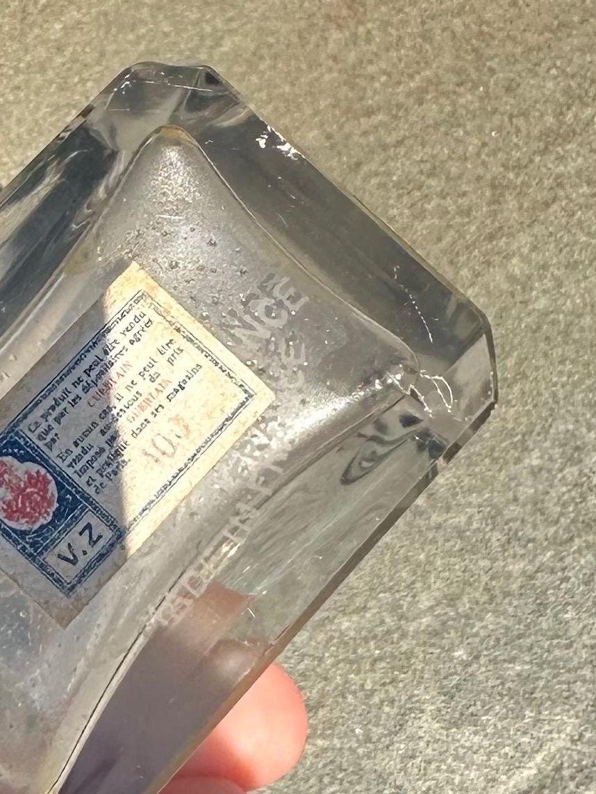 Bottom of bottle is etched "BOTTLE MADE IN FRANCE" and "PARIS FRANCE" with Baccarat etching covered by paper label. Bottom of bottle also appears to have a hand-etched number of "48".