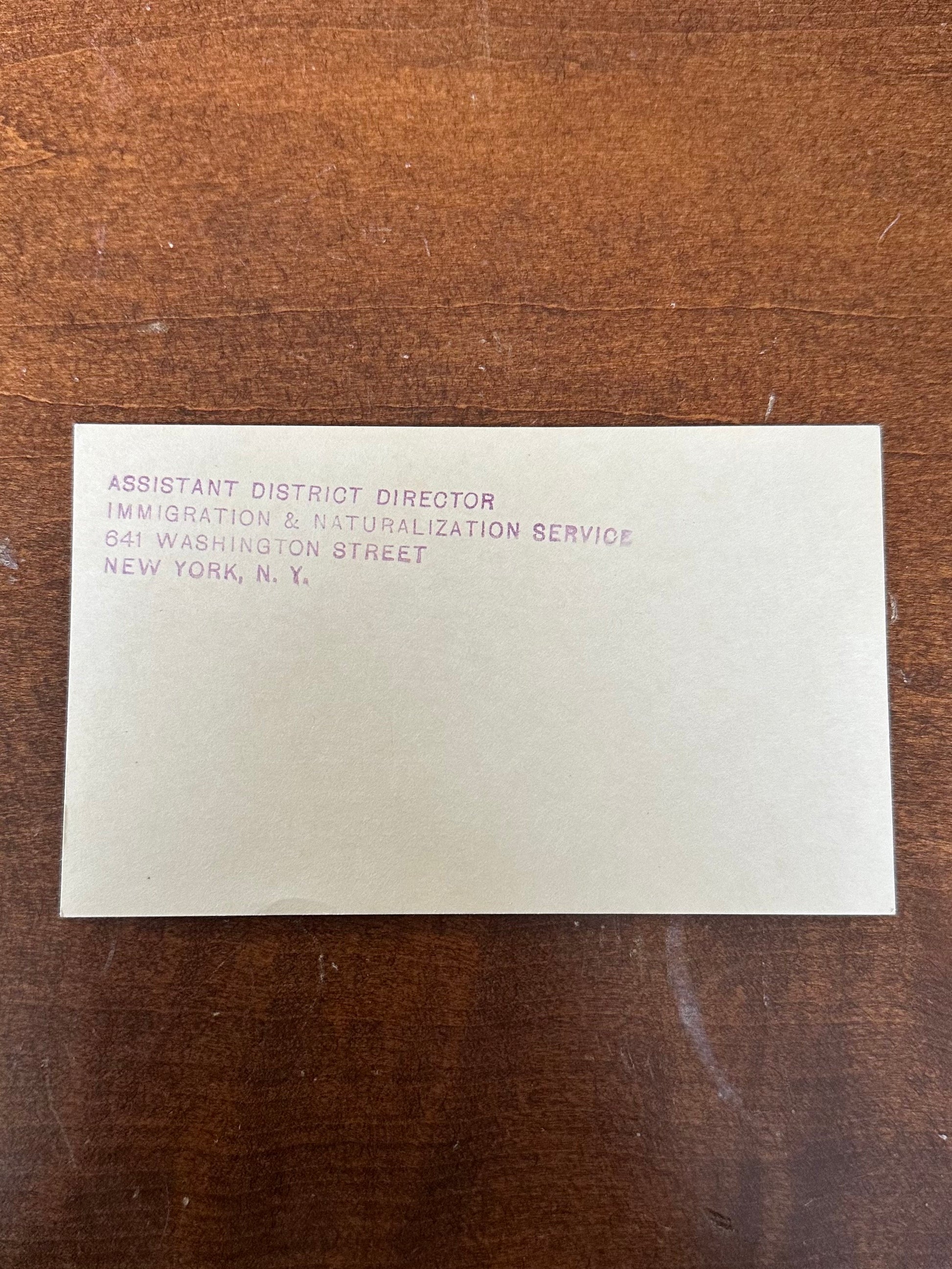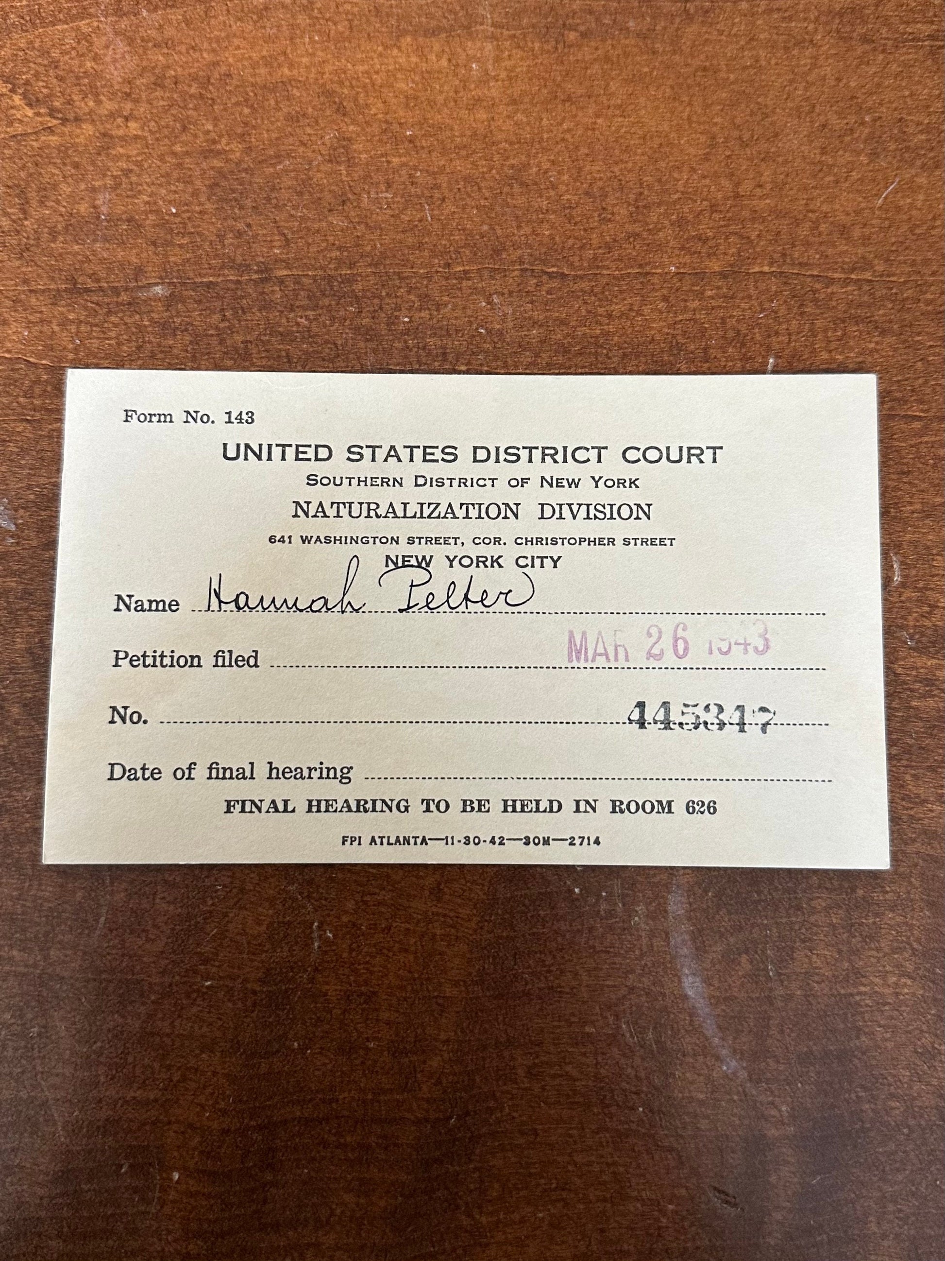 Top of card reads “Form No. 143 - United States District Court - Southern District of New York - Naturalization Division - 641 Washington Street, Cor. Christopher Street - New York City” and is signed by Hannah Pelter. Stamp date of March 26, 1943 for petition filed. No, 445347.