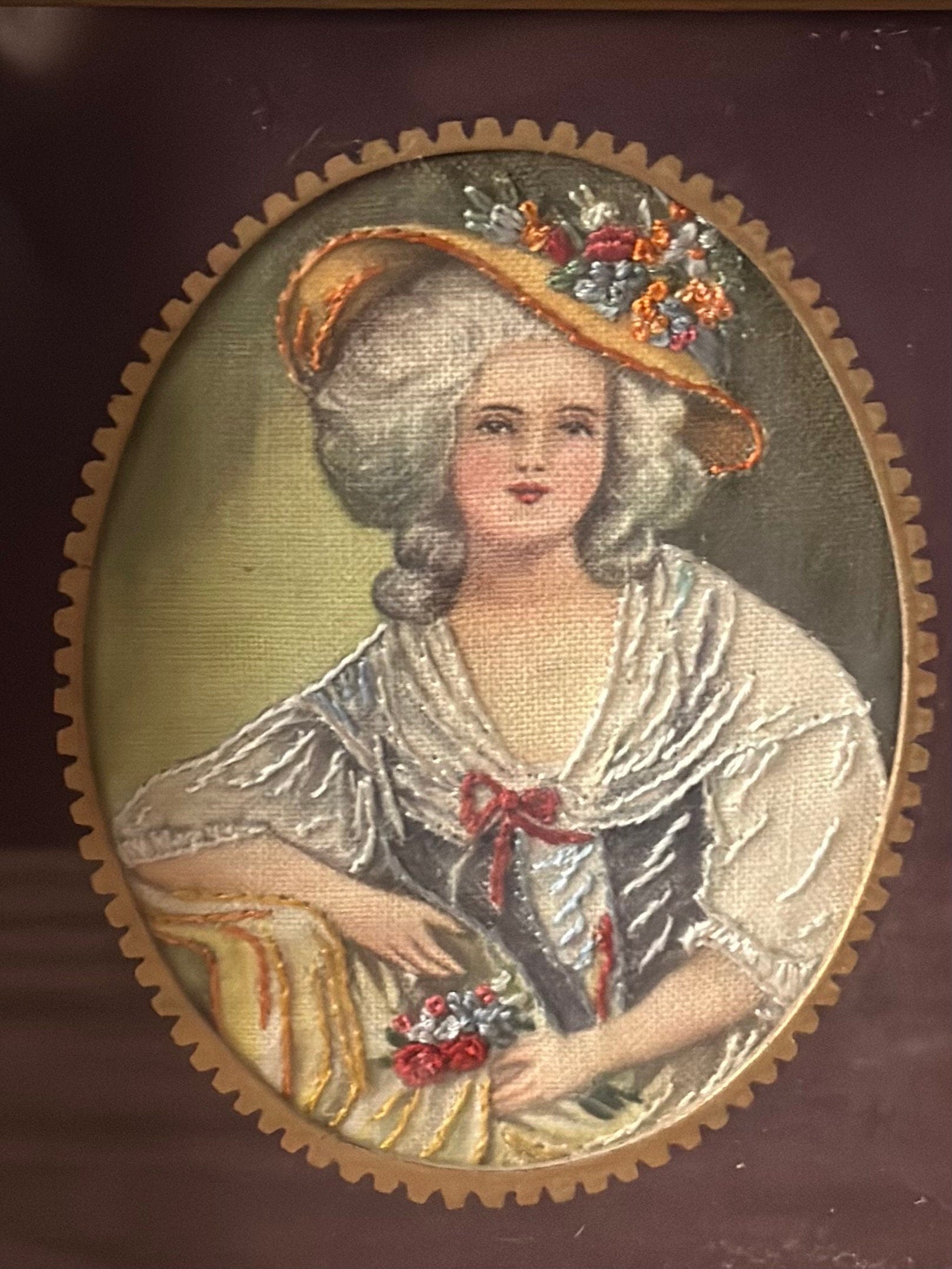 1940s Wood Framed Needle Painting Embroidered Fabric Print Portrait of Elizabeth of France, Dated 1946