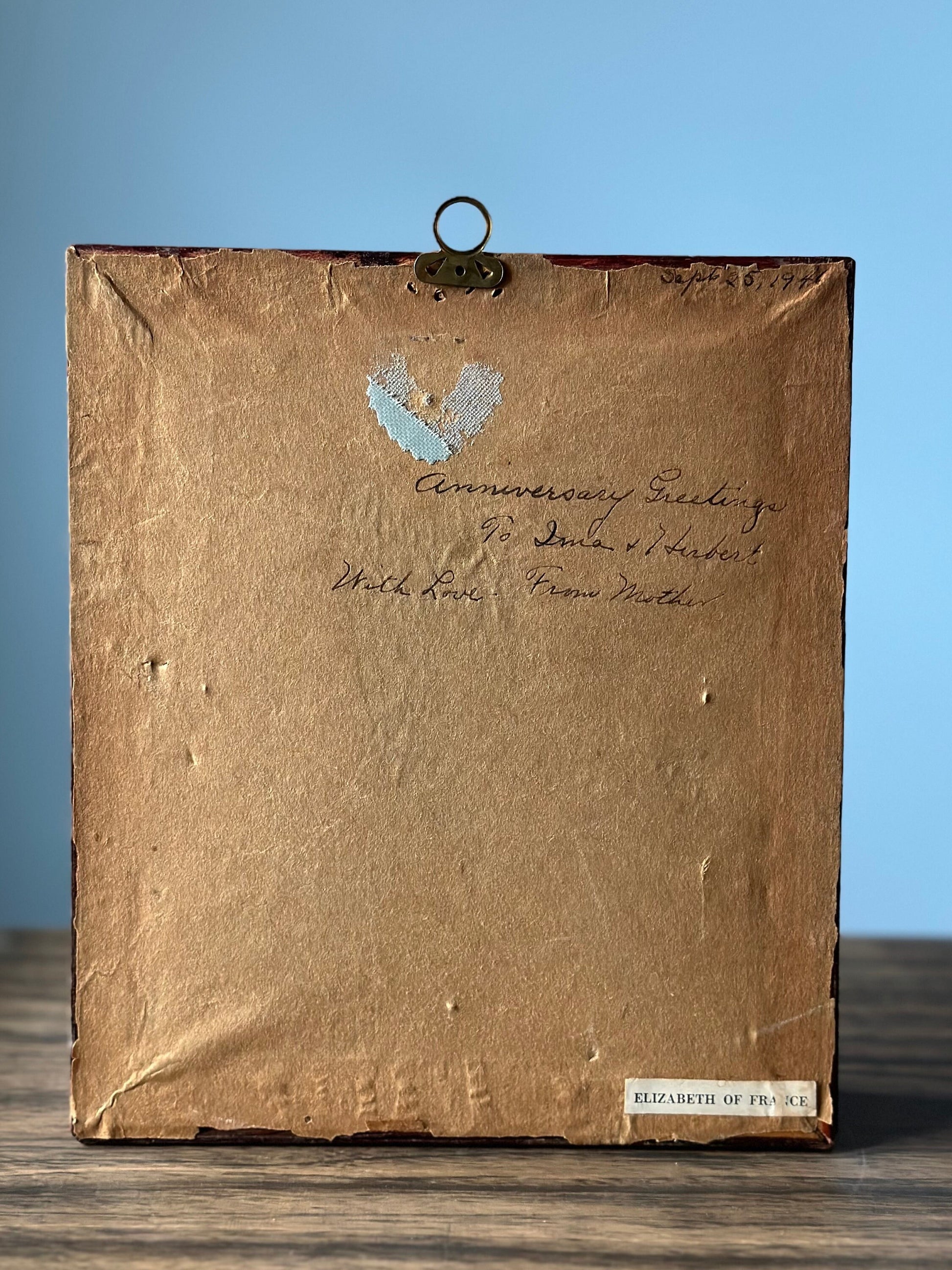 Back of frame is dated September 25, 1946, and inscribed "Anniversary Greetings to Ima & Herbert. With Love, From Mother" Framed is also affixed with an "Elizabeth of France" sticker.