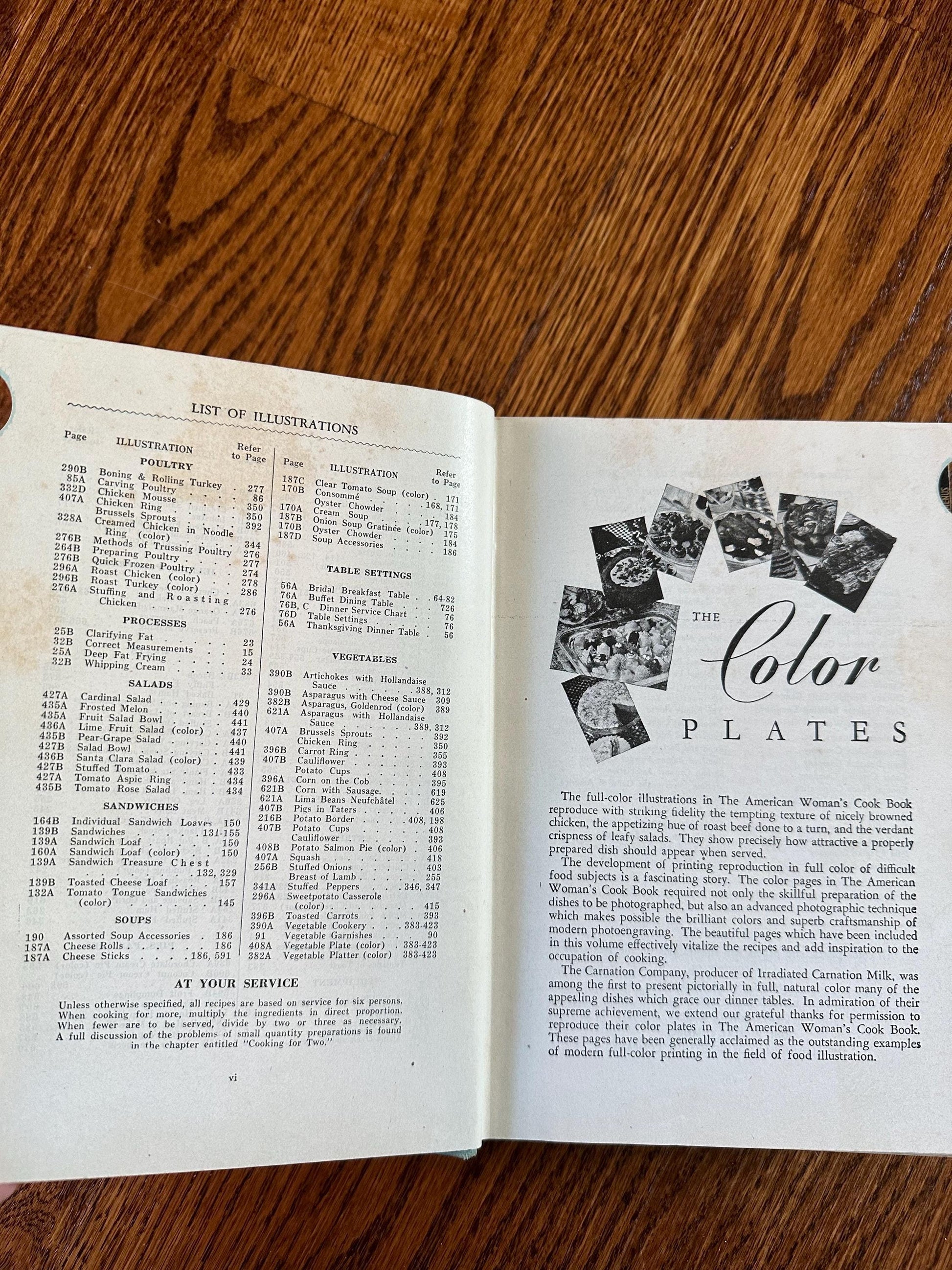At the end of the list of illustrations in the beginning of the book, reads “AT YOUR SERVICE: Unless otherwise specified, all recipes are based on service for six persons. When cooking for more, multiply the ingredients in direct proportion. When fewer are to be served, divide by two or three as necessary. A full discussion of the problems of small quantity preparations is found in the chapter entitled “Cooking for Two.”