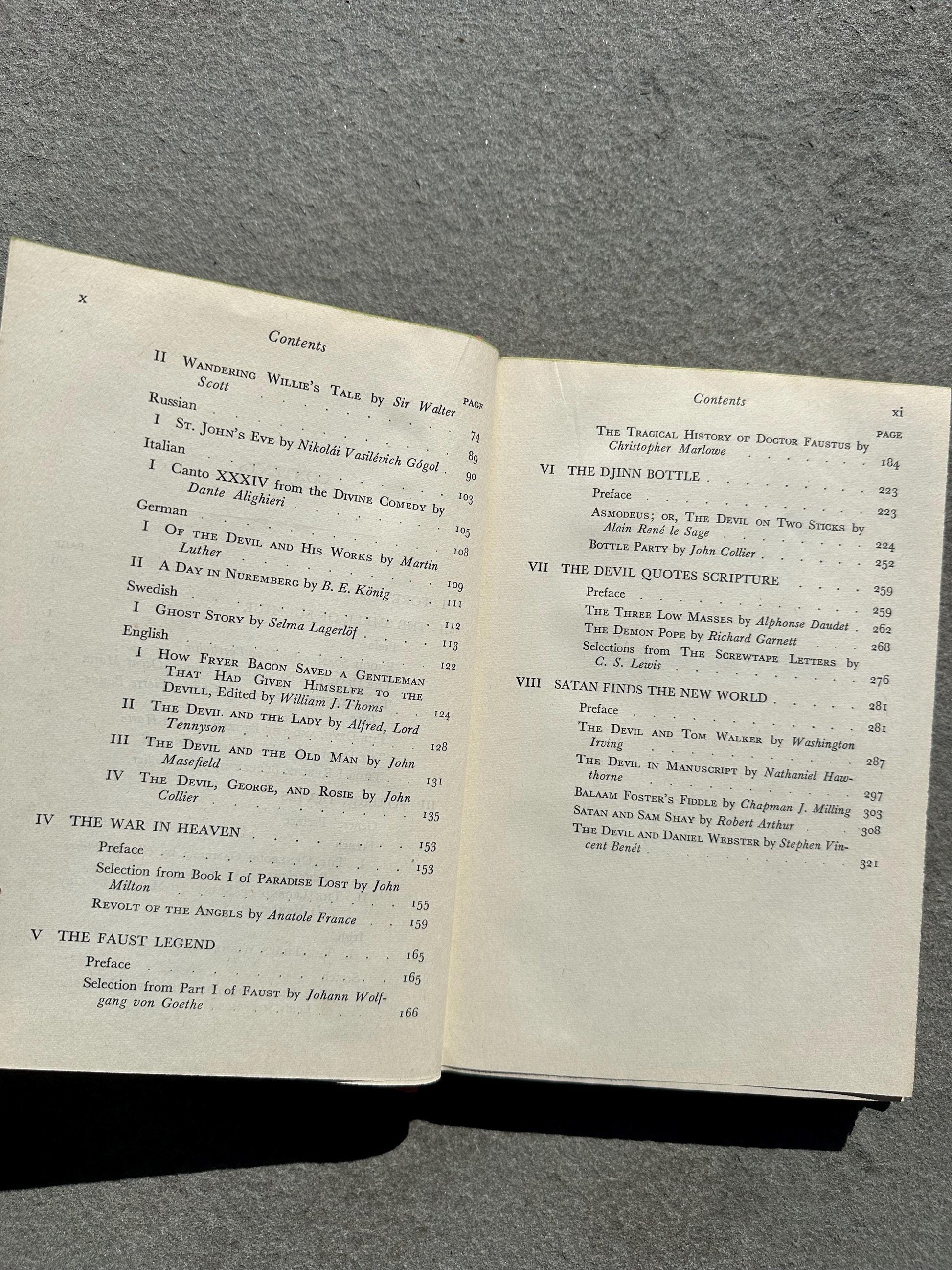 Excerpts from Foreword: “In this anthology of the appearances of the Devil in the literature of the Western world, the editors have been guided by two major considerations: readability in terms of the current taste and a sociological rather than a theological view of the Devil….The intention has been to include stories which are representative of the Devil in various cultures and to give the reader a taste of his local origins in the sectional introductions, briefly tracing at least some of the threads and symbols which have been woven into the hellish pattern.”