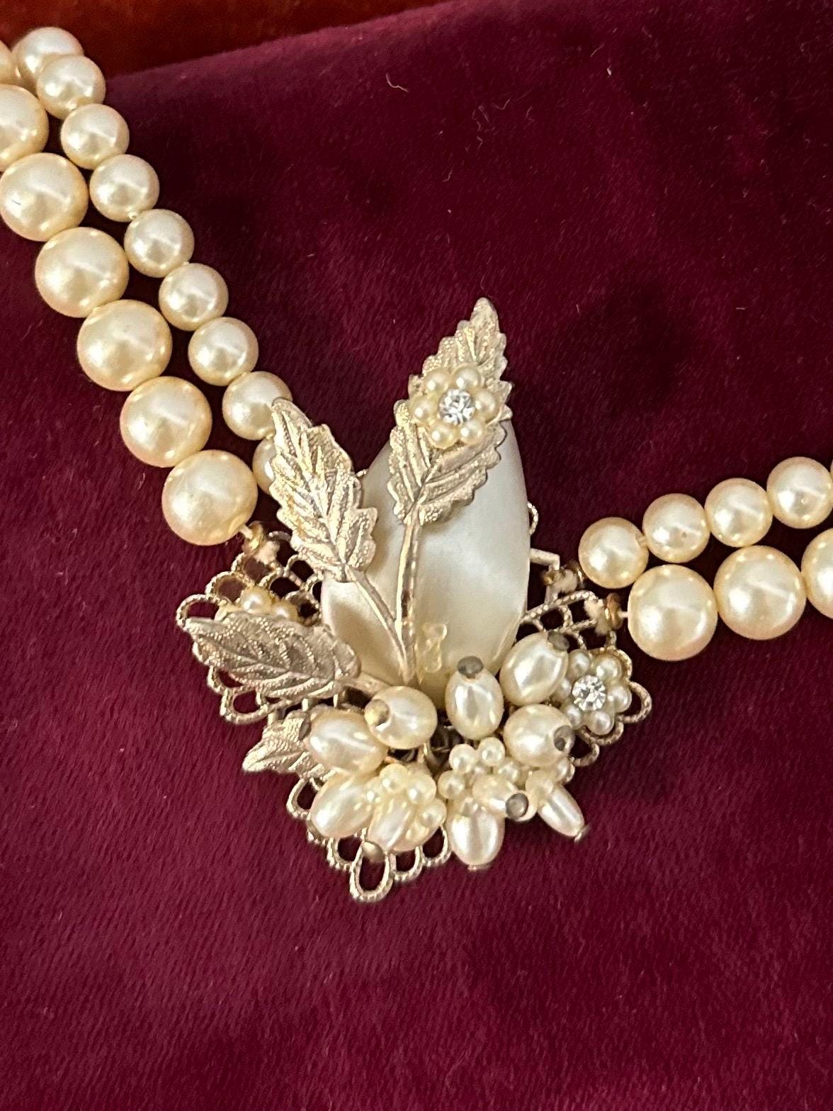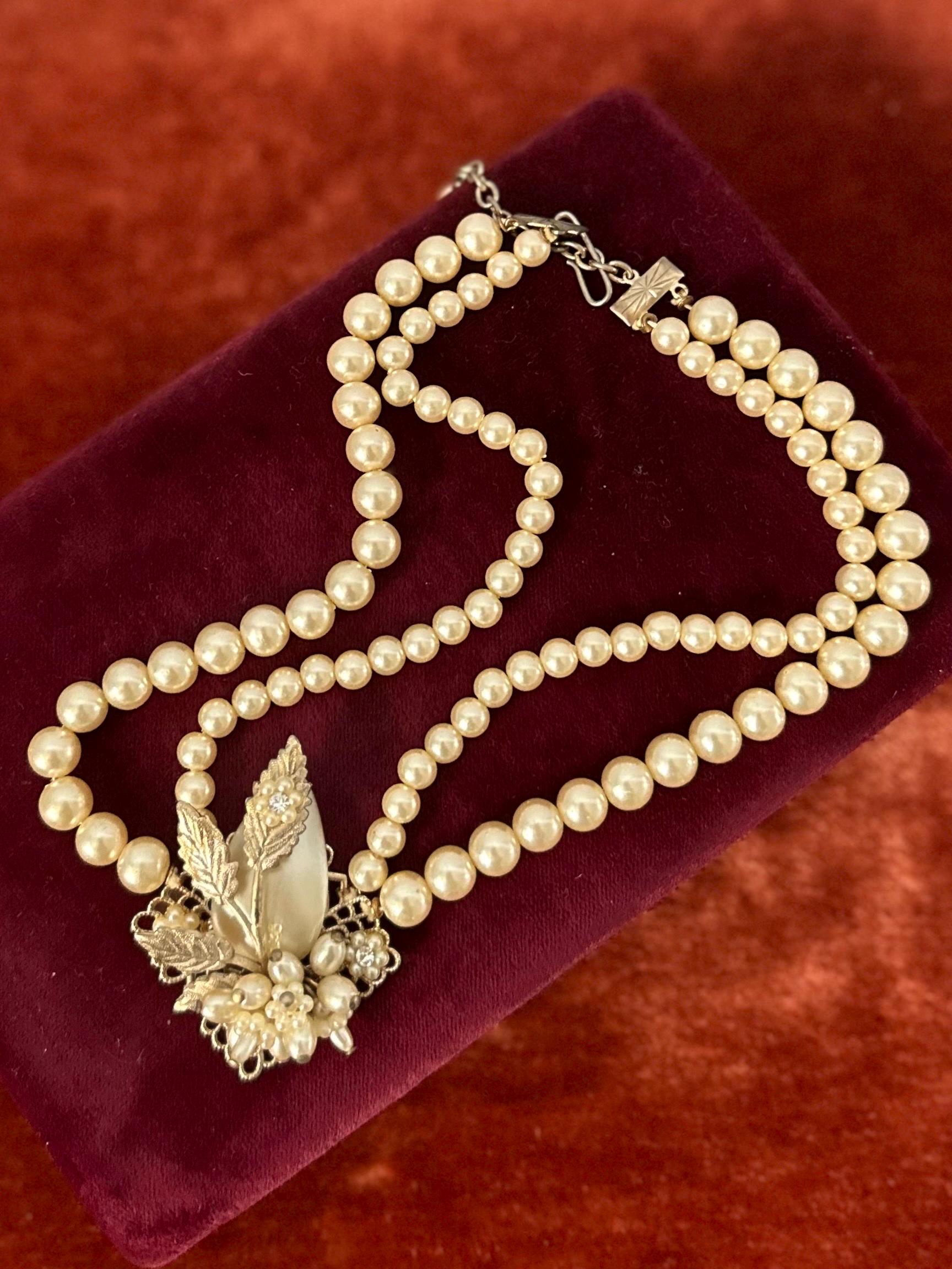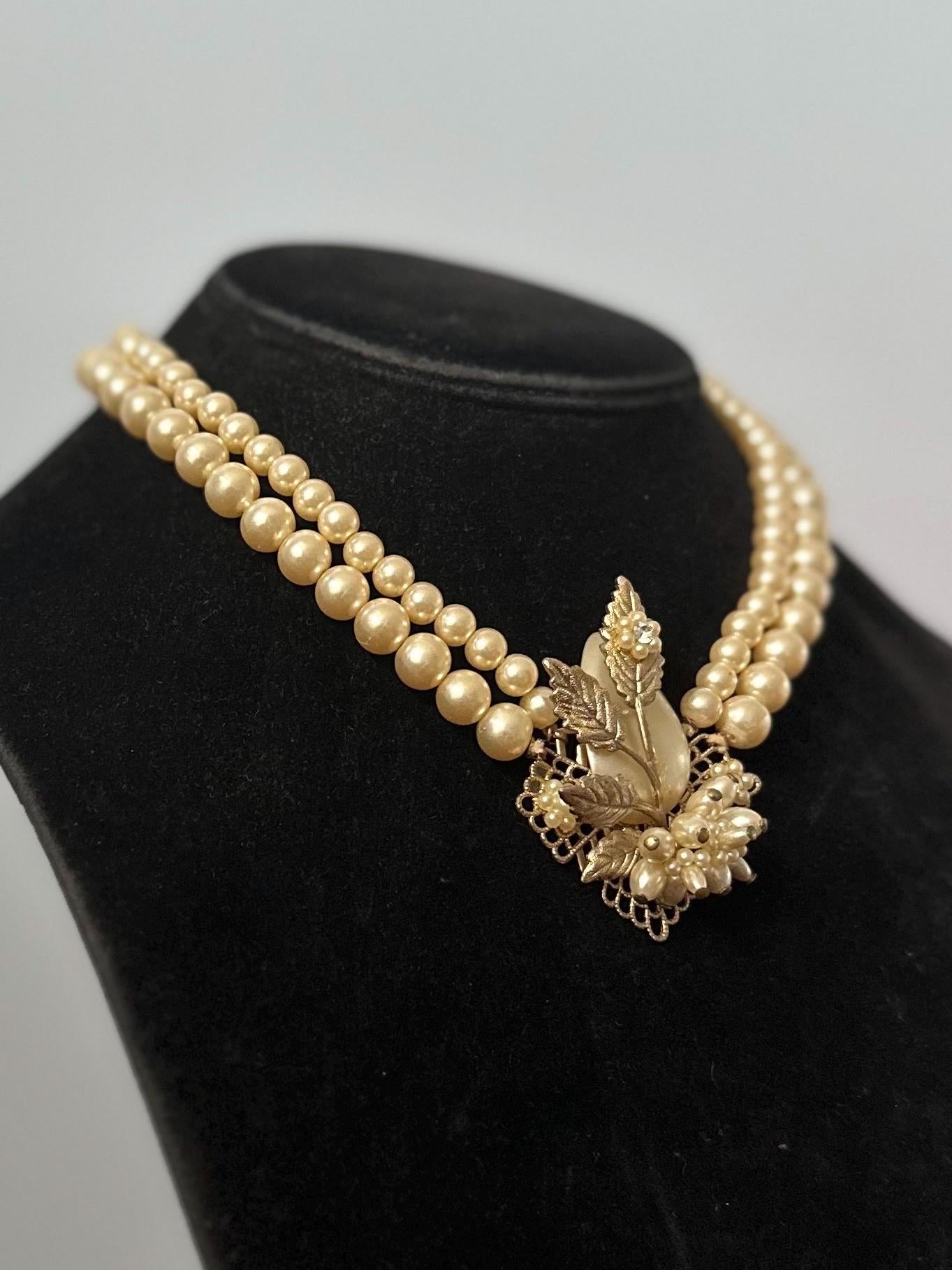 Beautiful double strand faux pearl collar necklace, with a filigree leaf detail center pendant also embellished with faux pearls, seed pearls, and rhinestones.