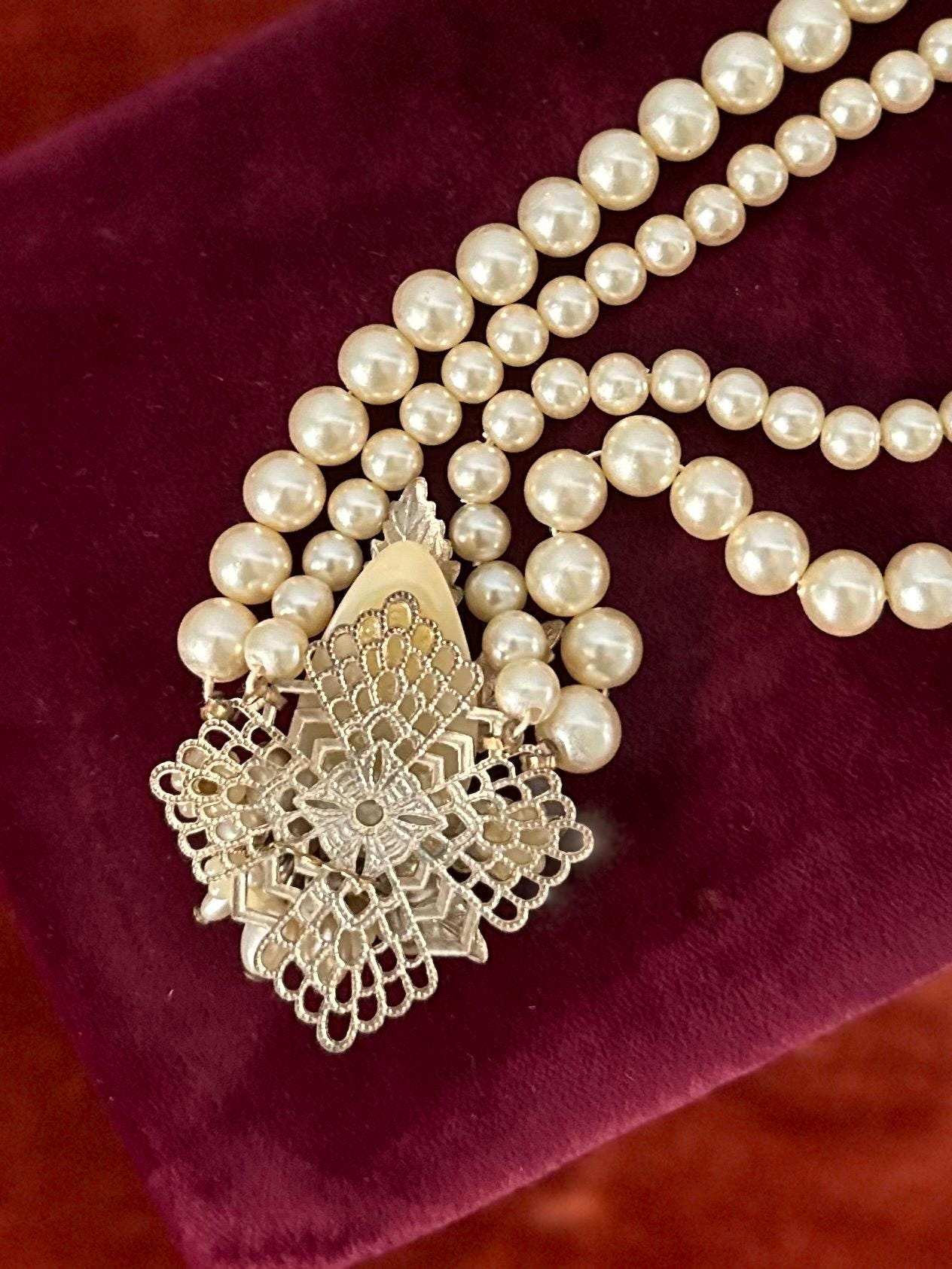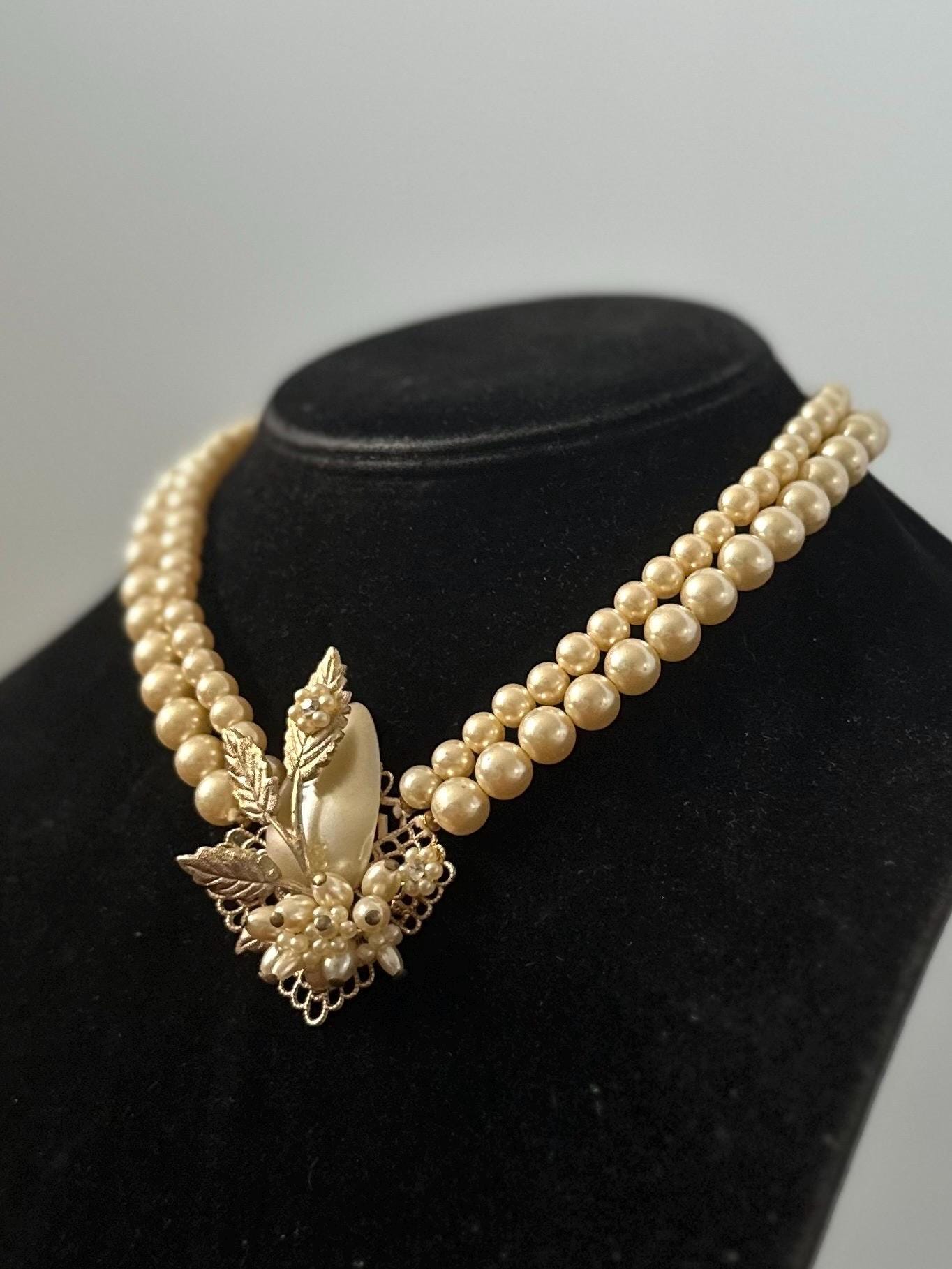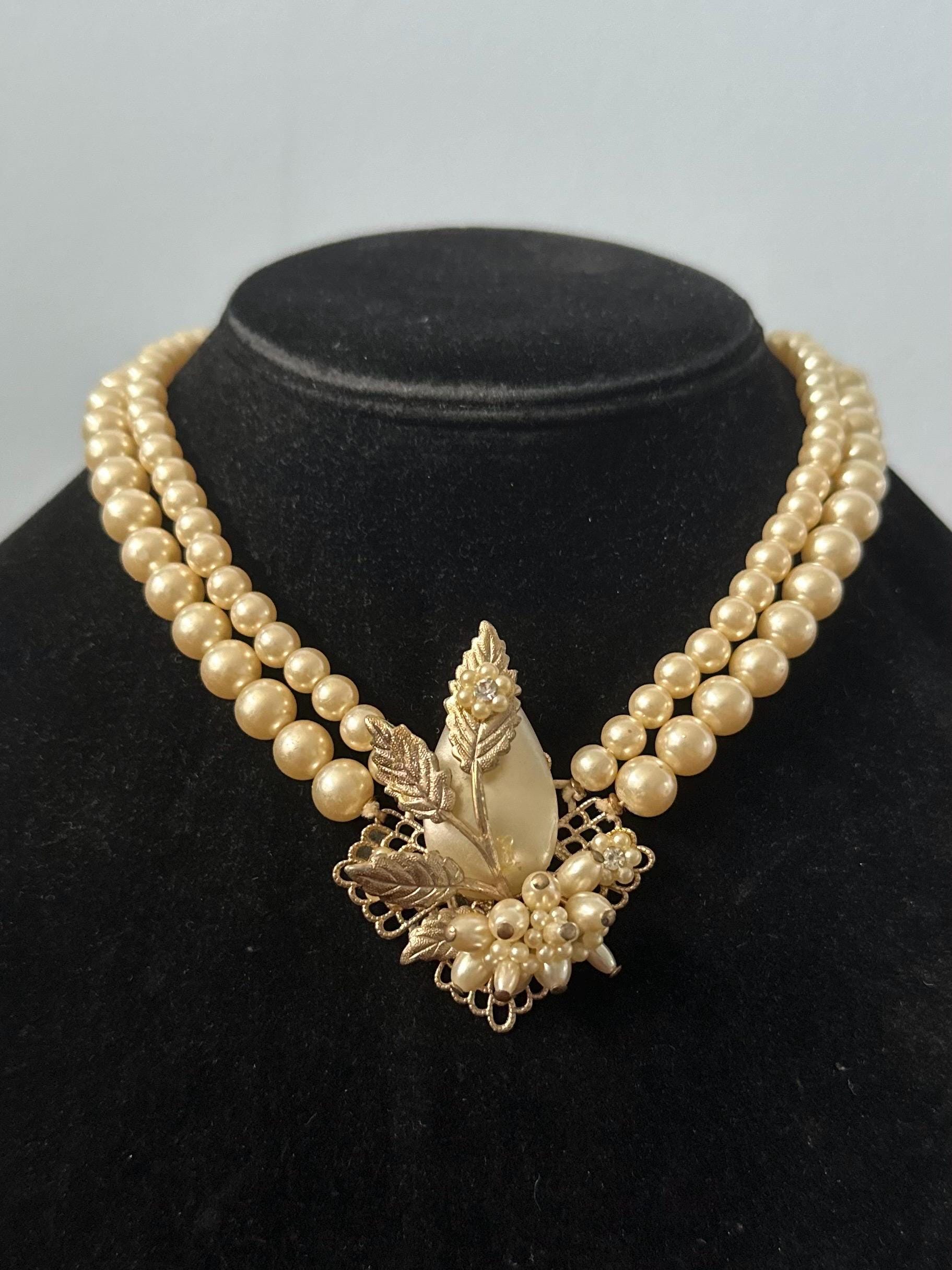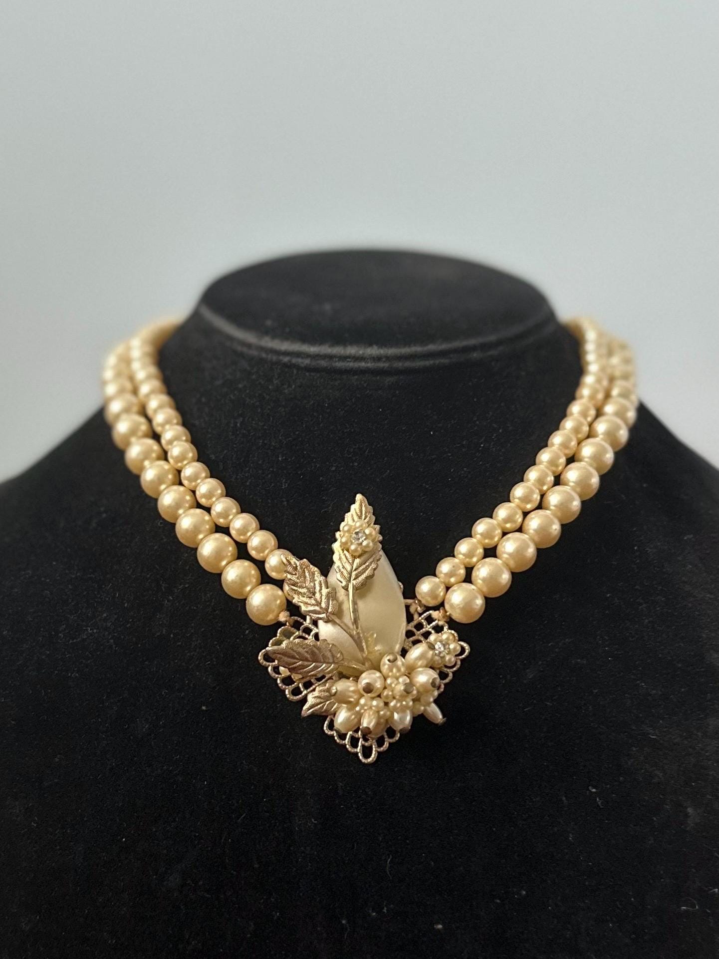Beautiful double strand faux pearl collar necklace, with a filigree leaf detail center pendant also embellished with faux pearls, seed pearls, and rhinestones.