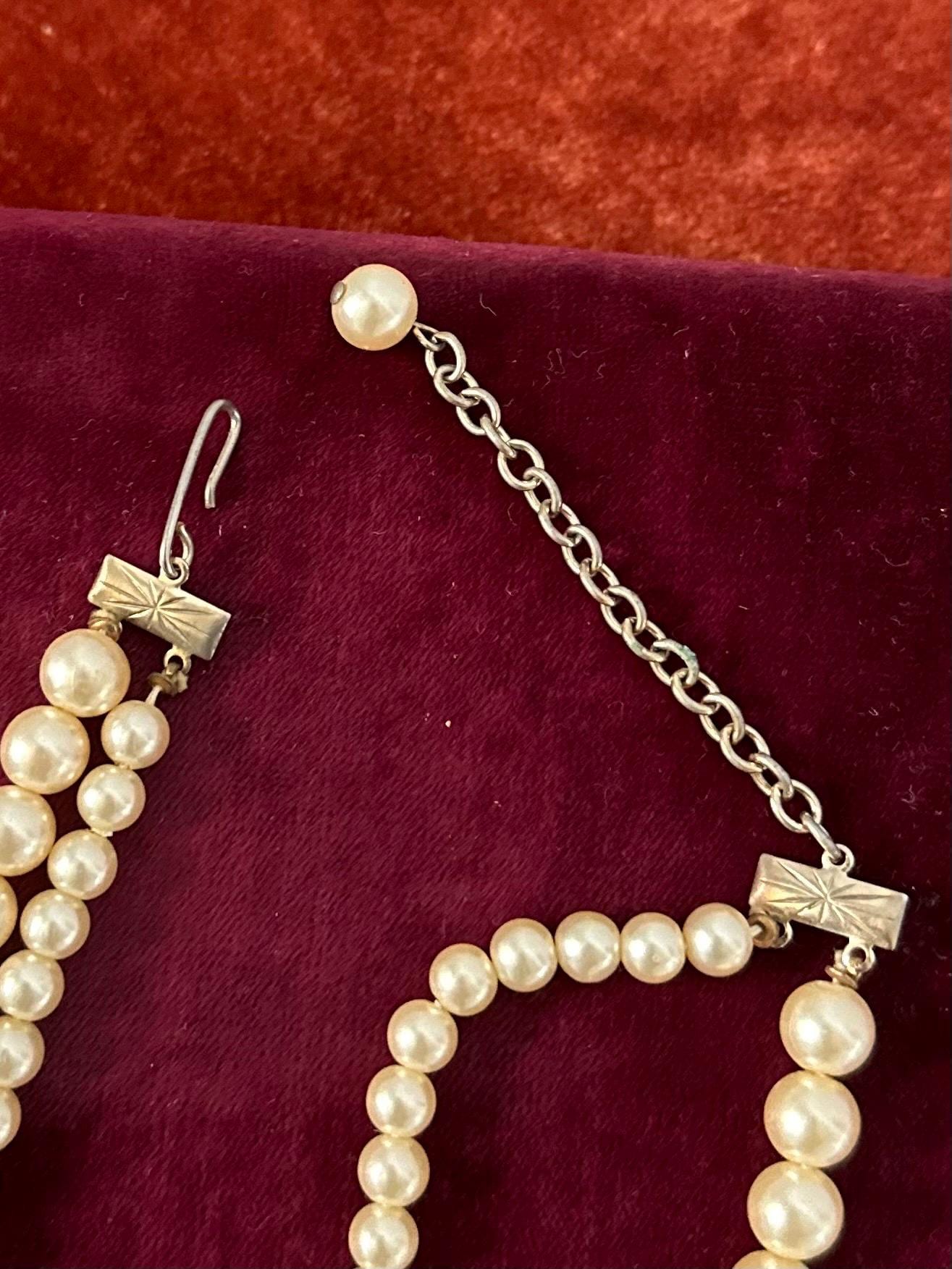1950s Double Strand Faux Pearl Collar Choker Necklace Filigree Leaf Pendant Adjustable