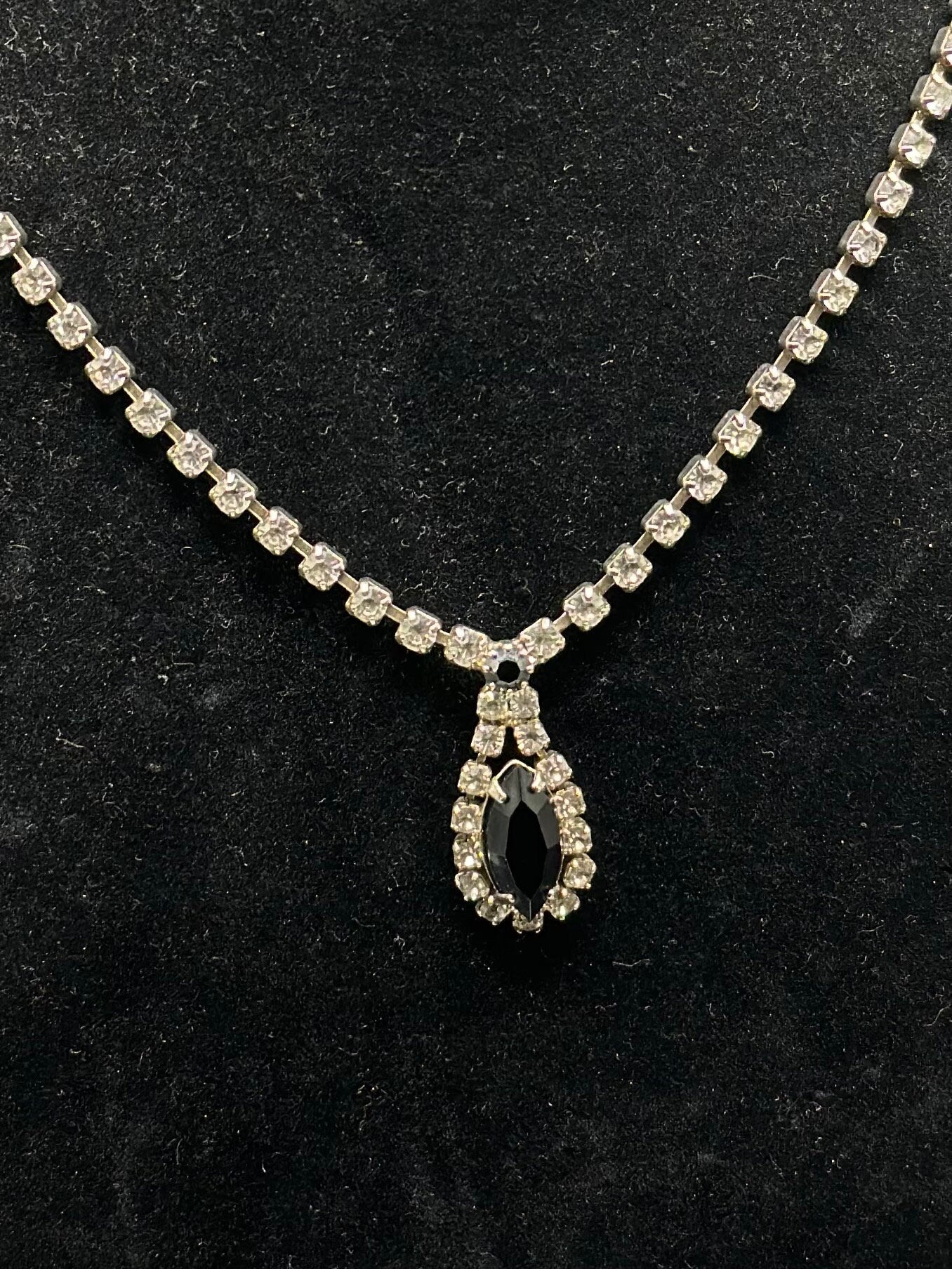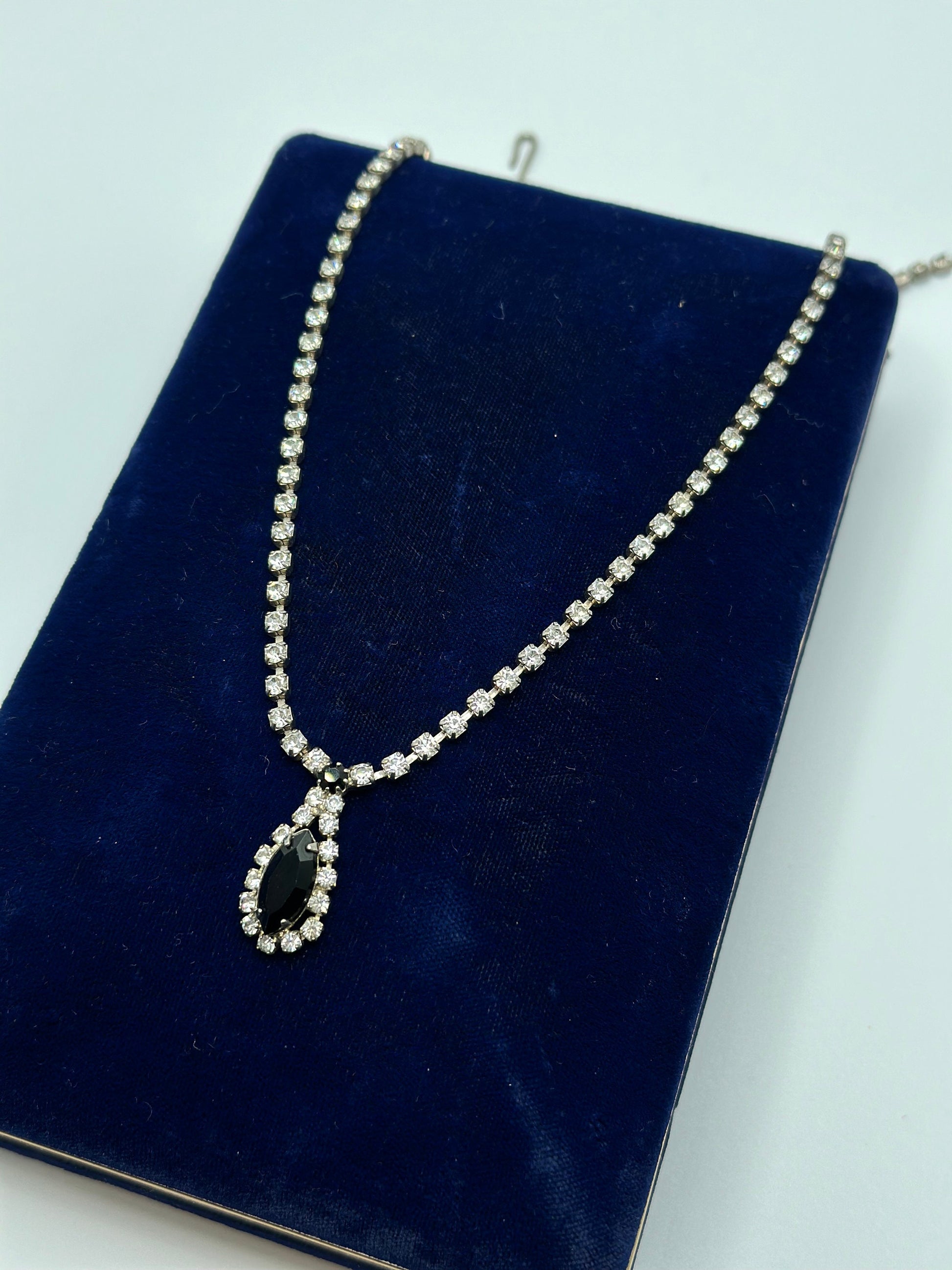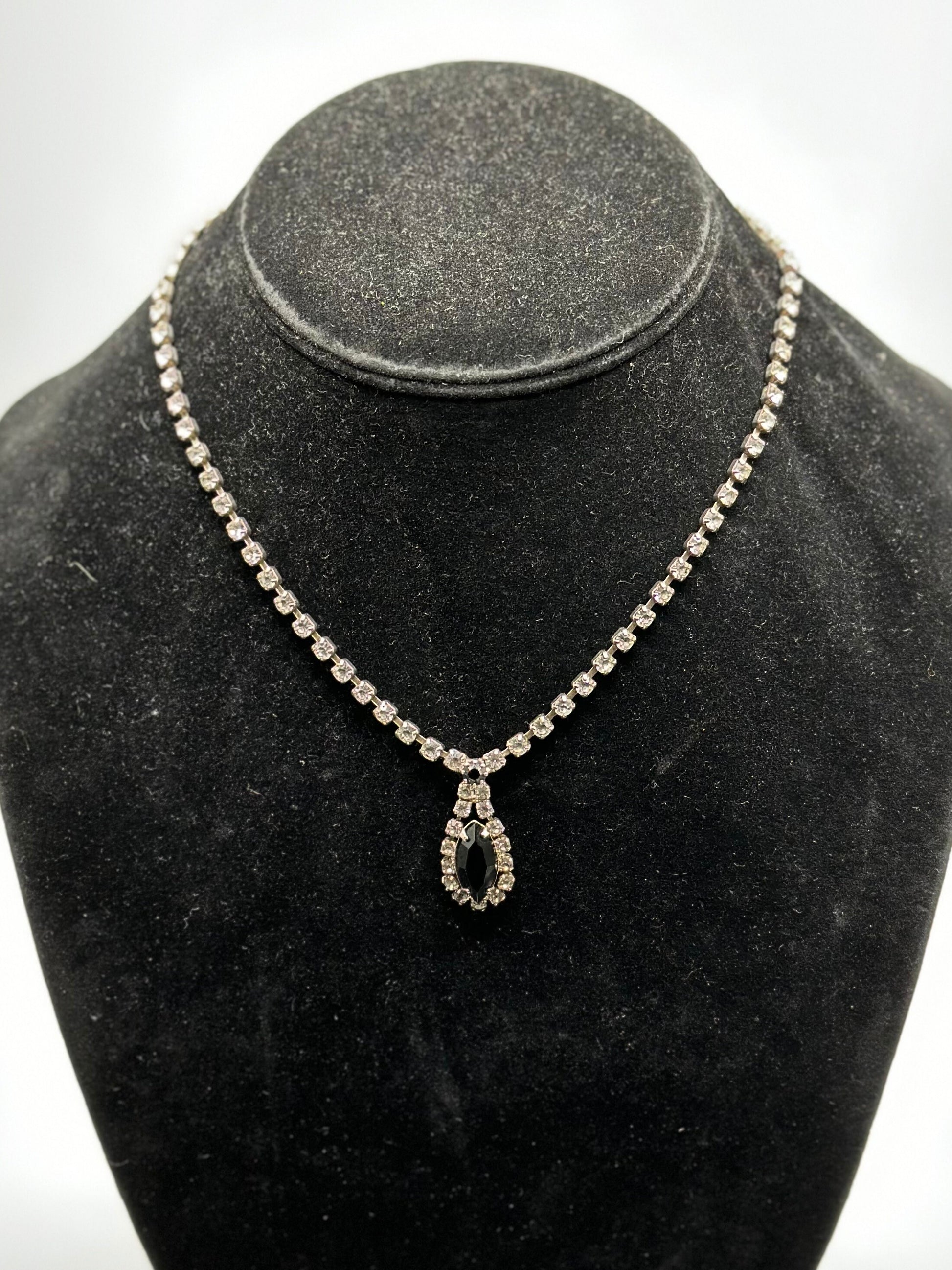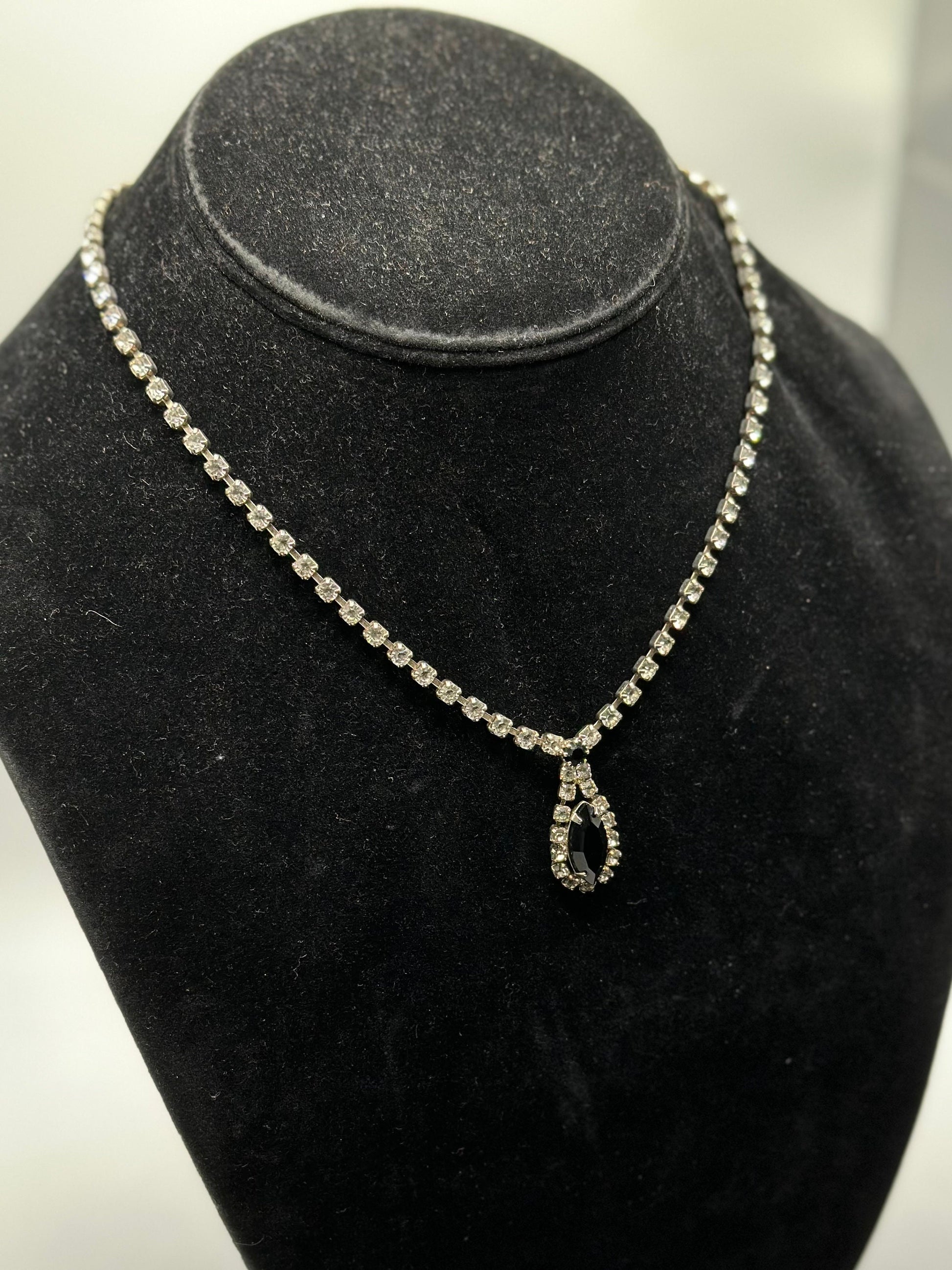 1950s Faceted Clear and Black Glass Rhinestone Necklace Marquise Teardrop