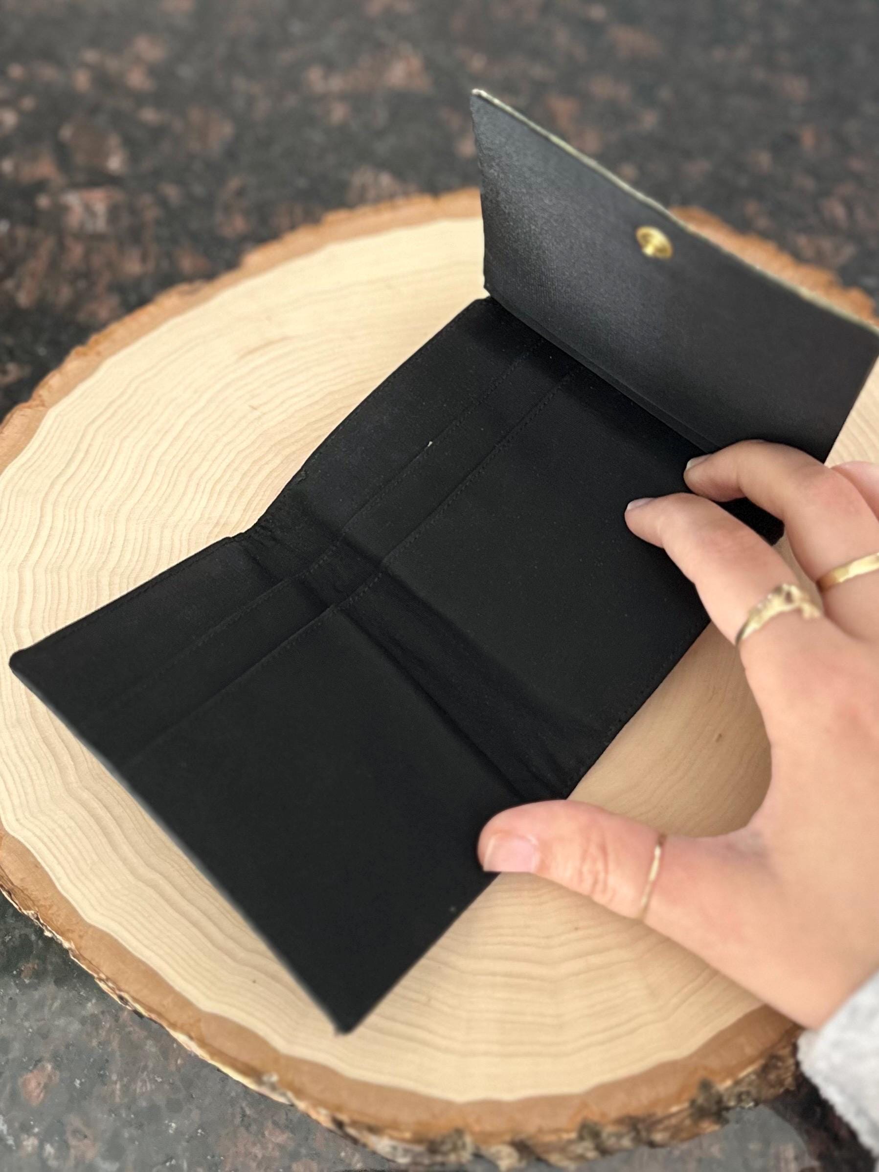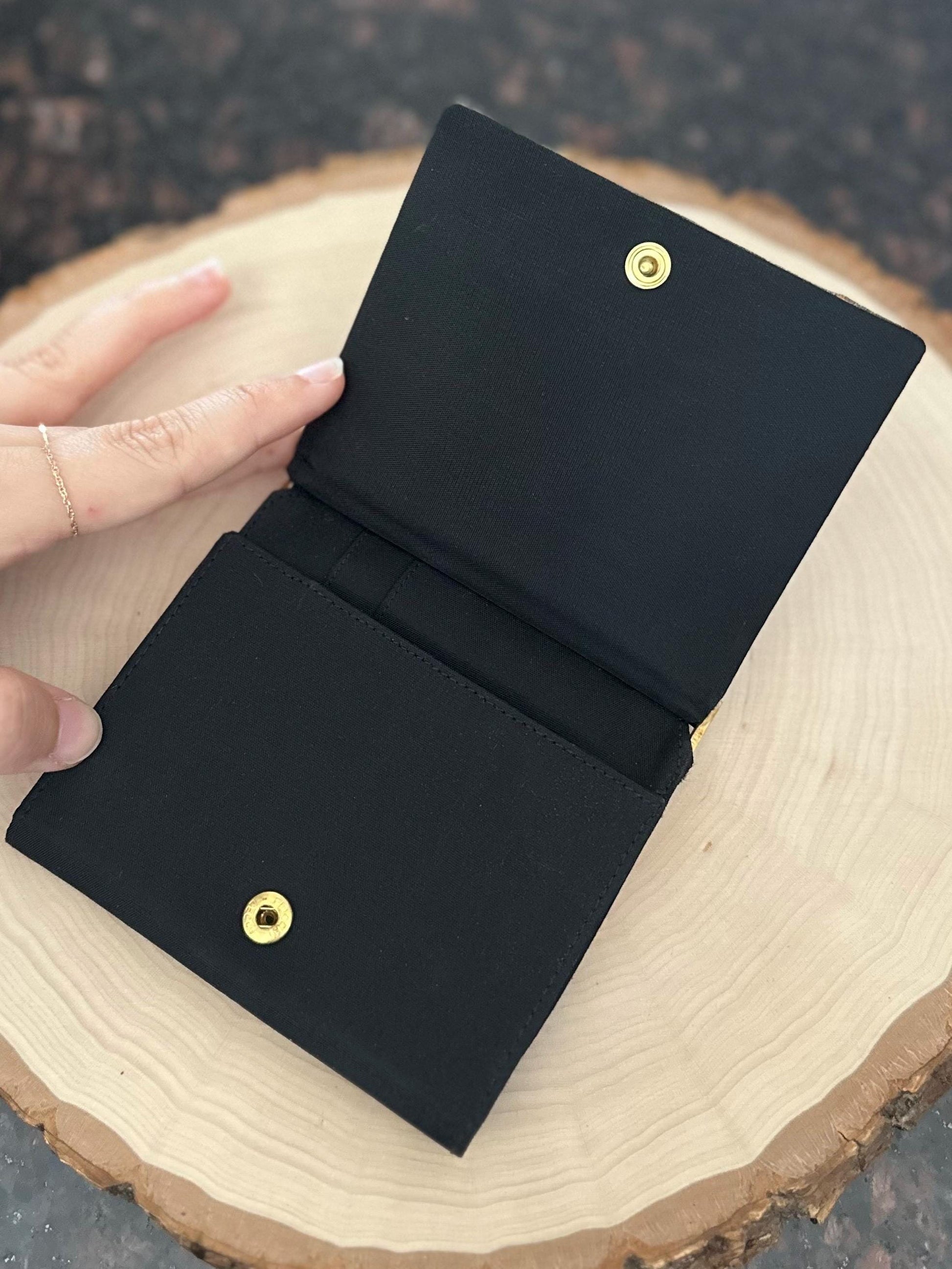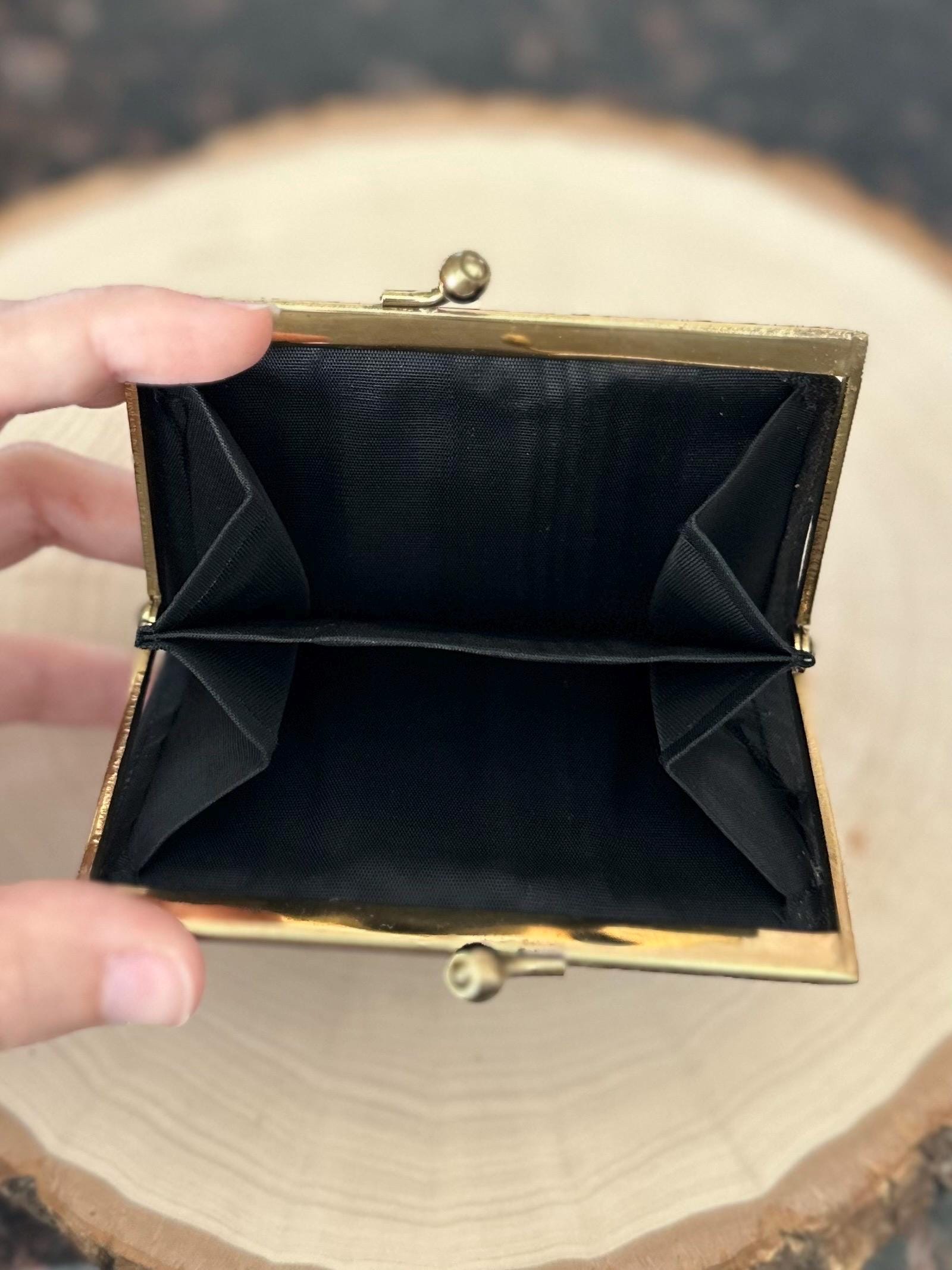 Wallet measures approximately 4 inches long by 3.75 inches long (not including kiss lock in measurement. When fully opened, wallet measures approximately 9.4 inches long.