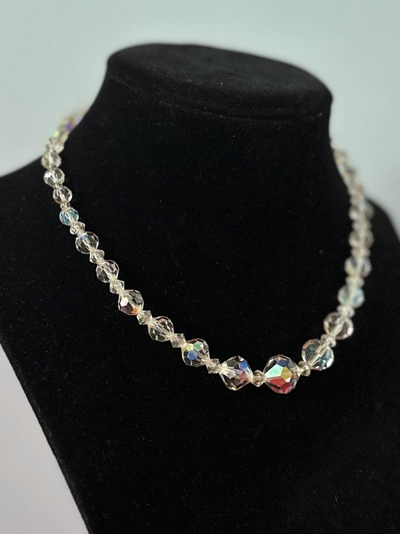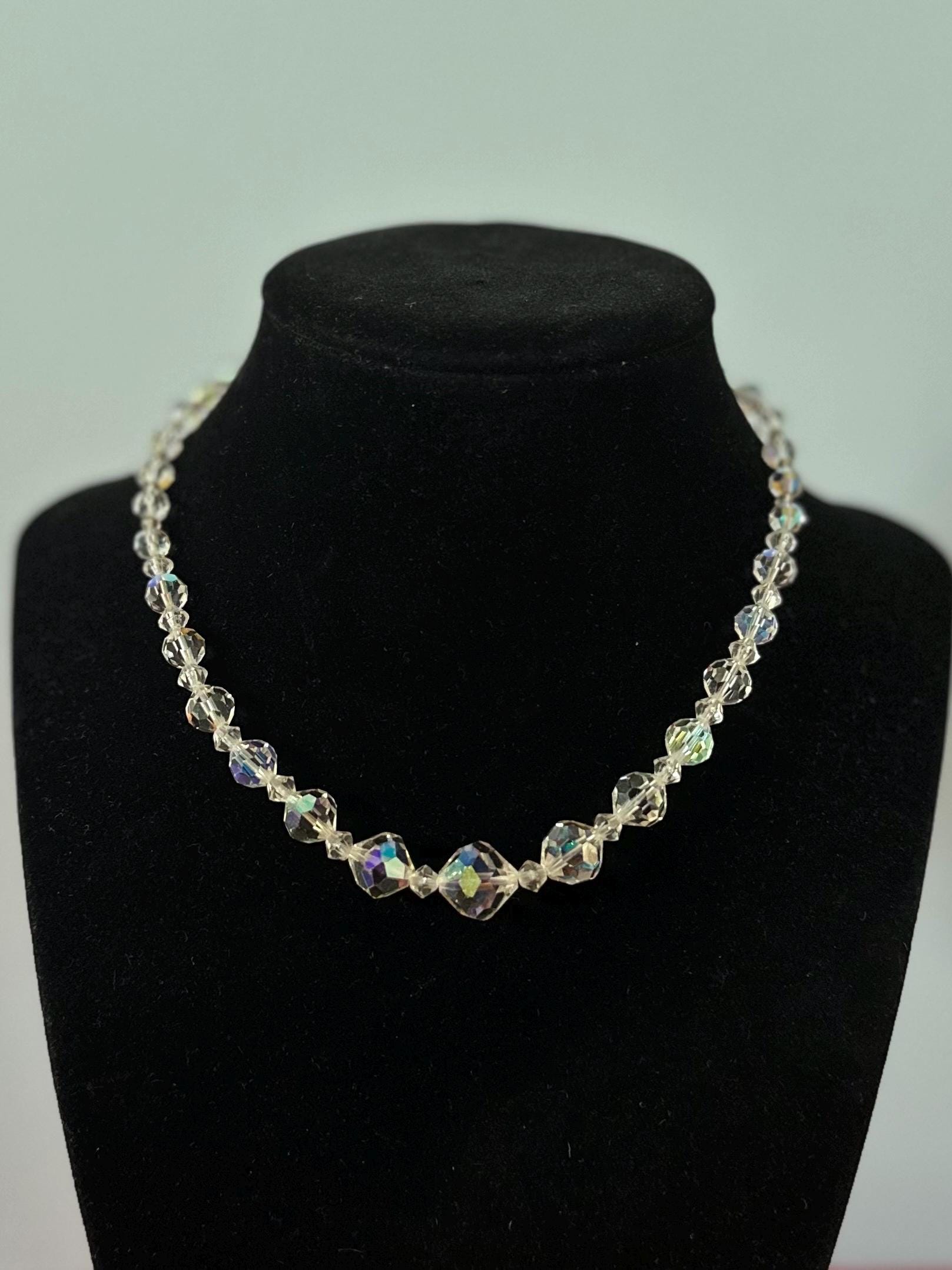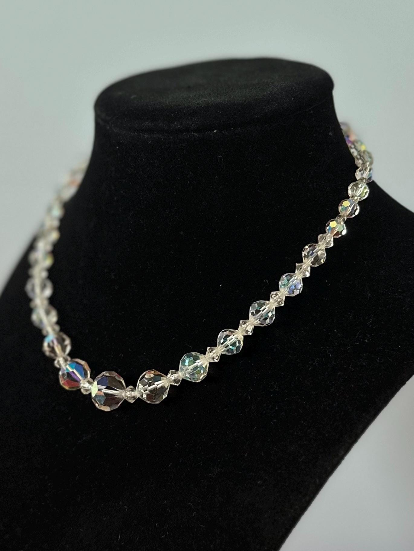 1950s Midcentury Faceted Iridescent Clear Graduated Crystal Beaded Necklace