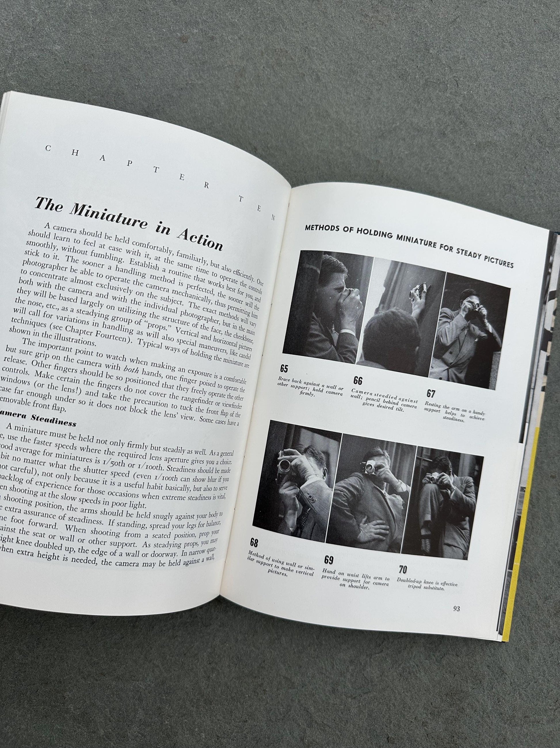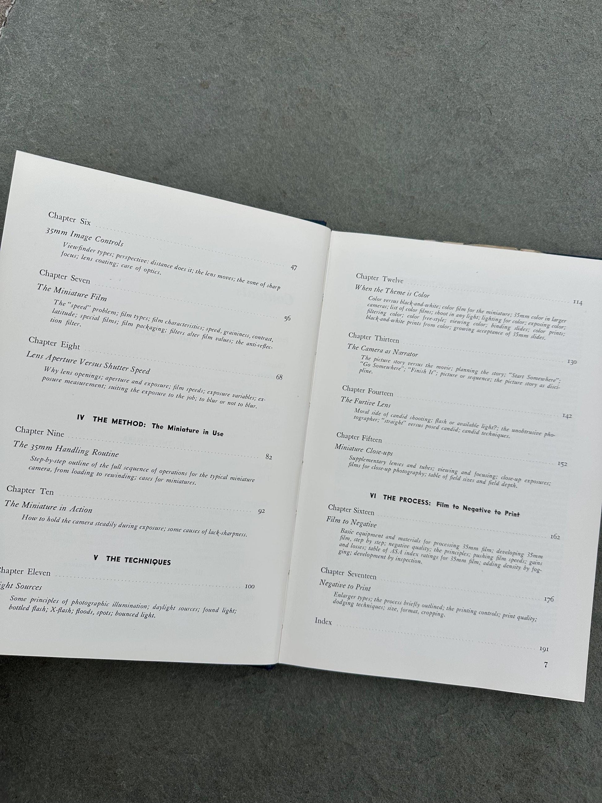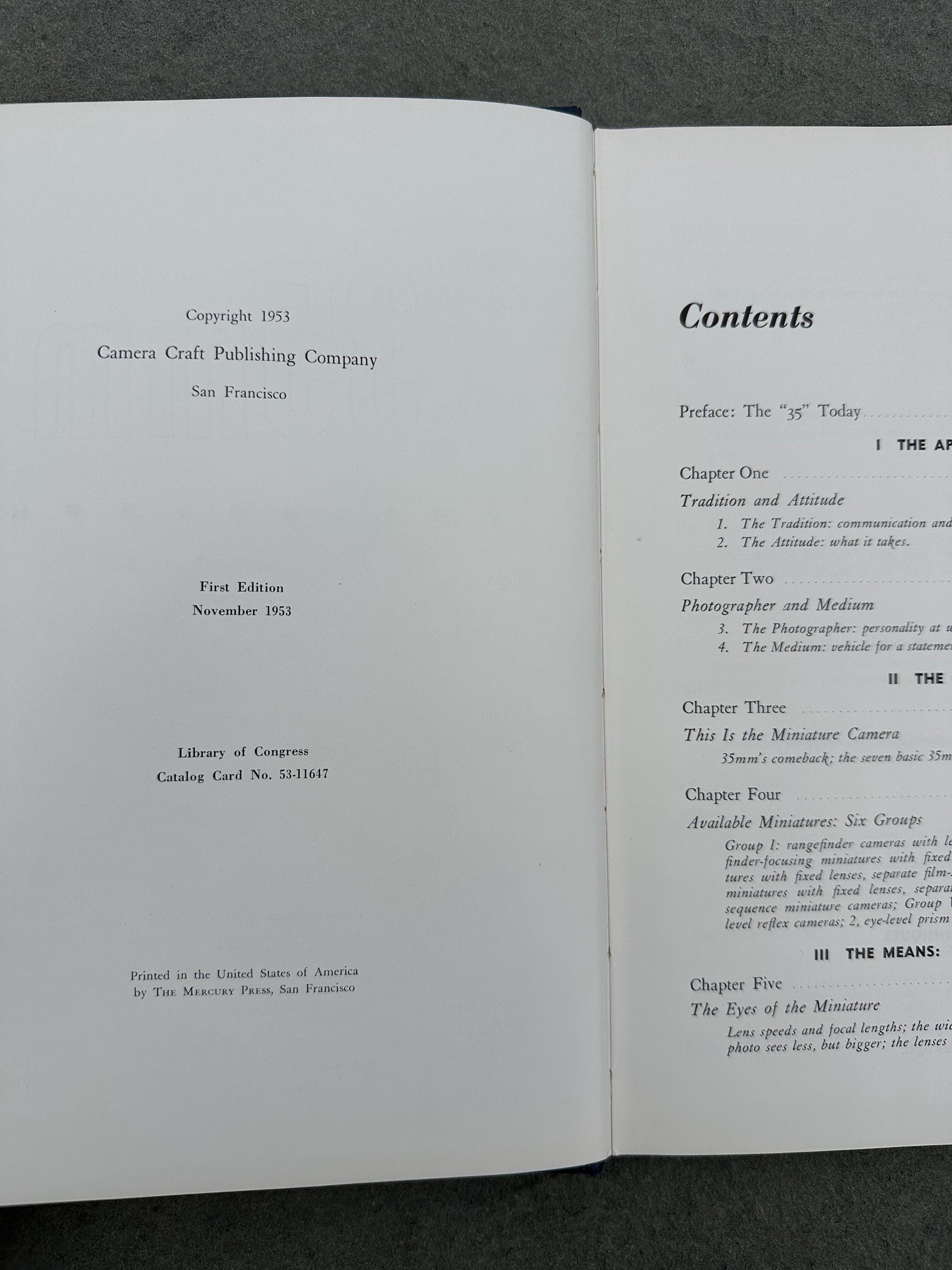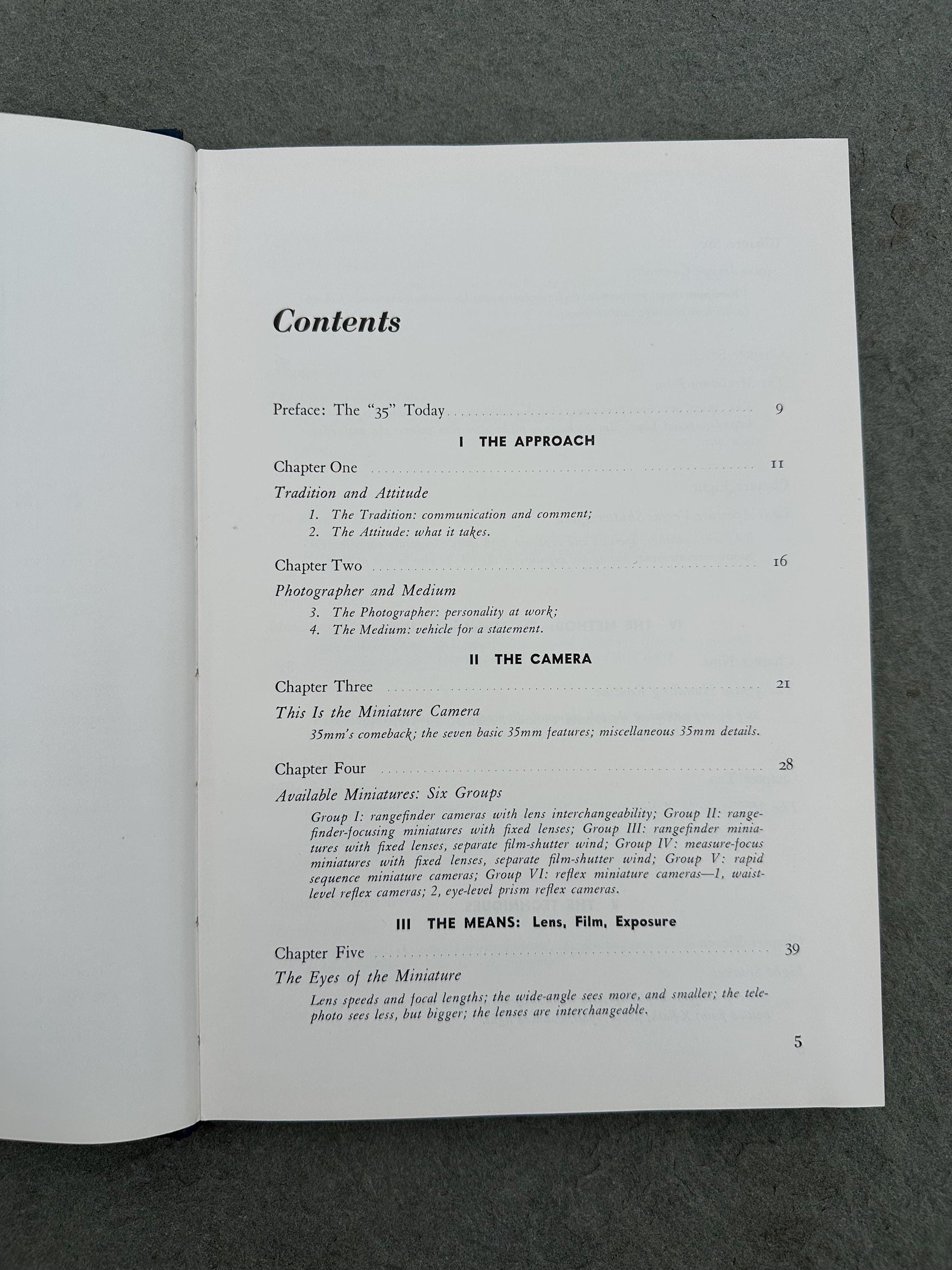 Contents include: I - THE APPROACH (Tradition and Attitude & Photographer and Medium) II - THE CAMERA (This is the Miniature Camera & Available Miniatures: Six Groups) III - THE MEANS: LENS, FILM, EXPOSURE (The Eyes of the Miniature, 35mm Image Controls, The Miniature Film, & Lens Aperture Versus Shutter Speed) IV - THE METHOD: THE MINIATURE IN USE (The 35mm Handling Routine & The Minaiture in Action) V - THE TECHNIQUES (Light Sources, When the Theme is Color, The Camera as Narrator, The Futive Lens, & Miniature Close-ups) VI - THE PROCESS: FILM TO NEGATIVE TO PRINT (Film to Negative & Negative to Print)