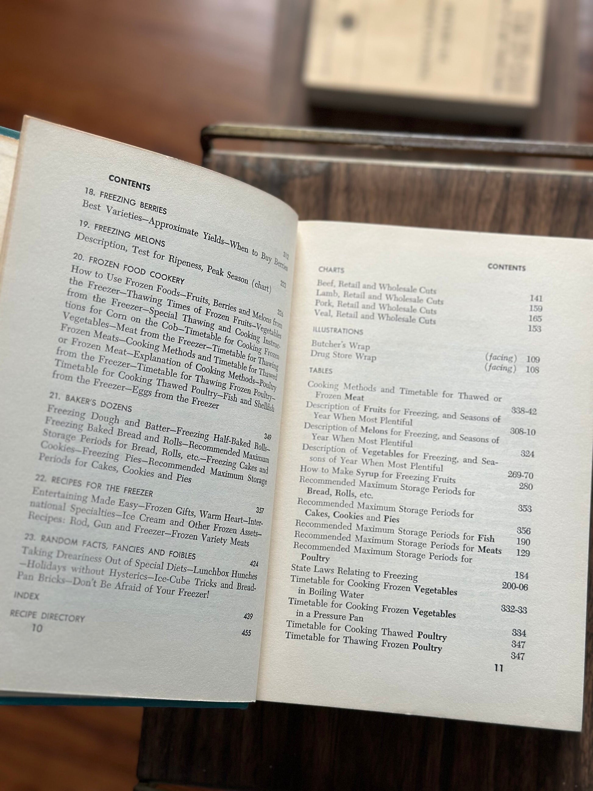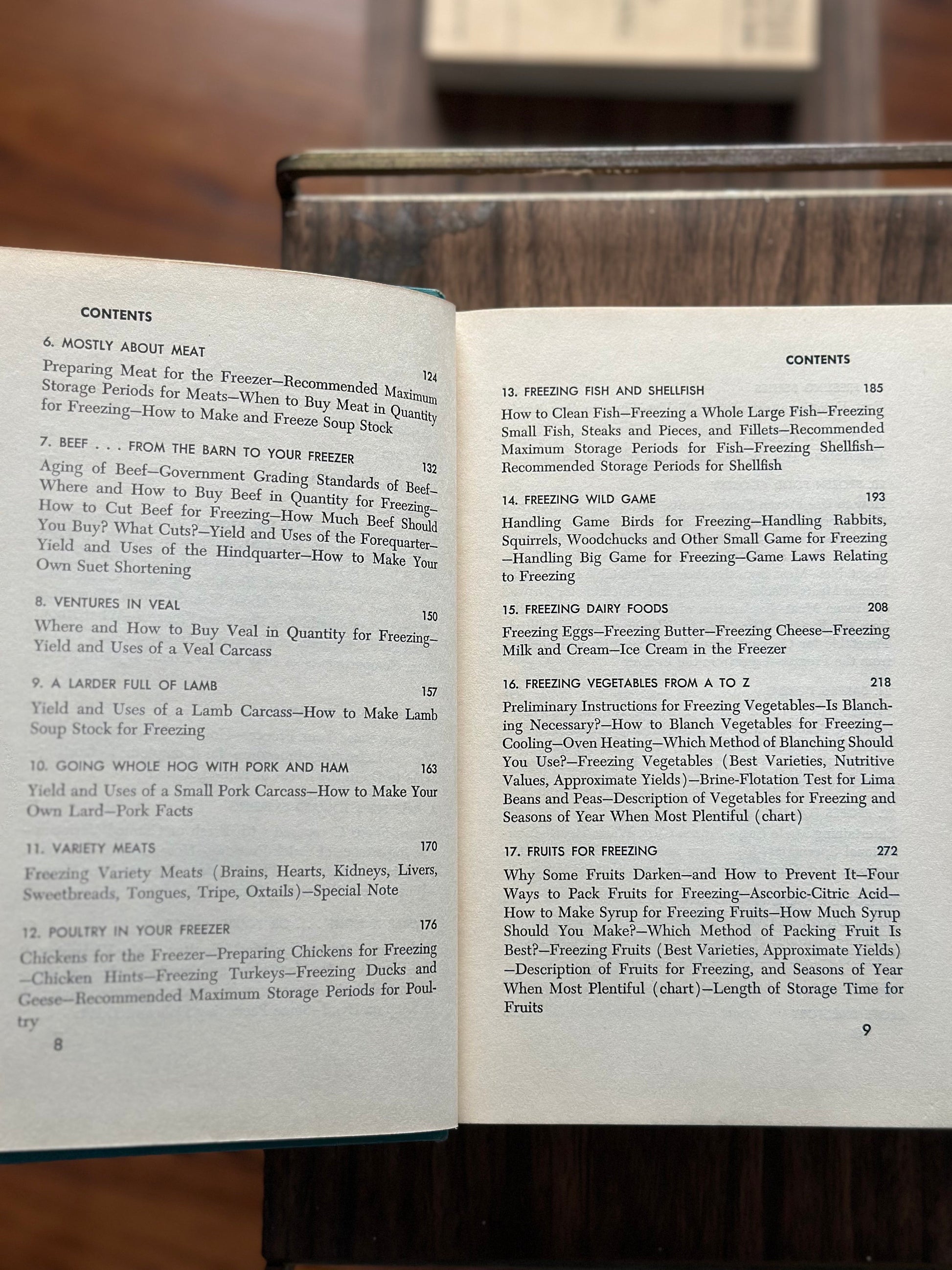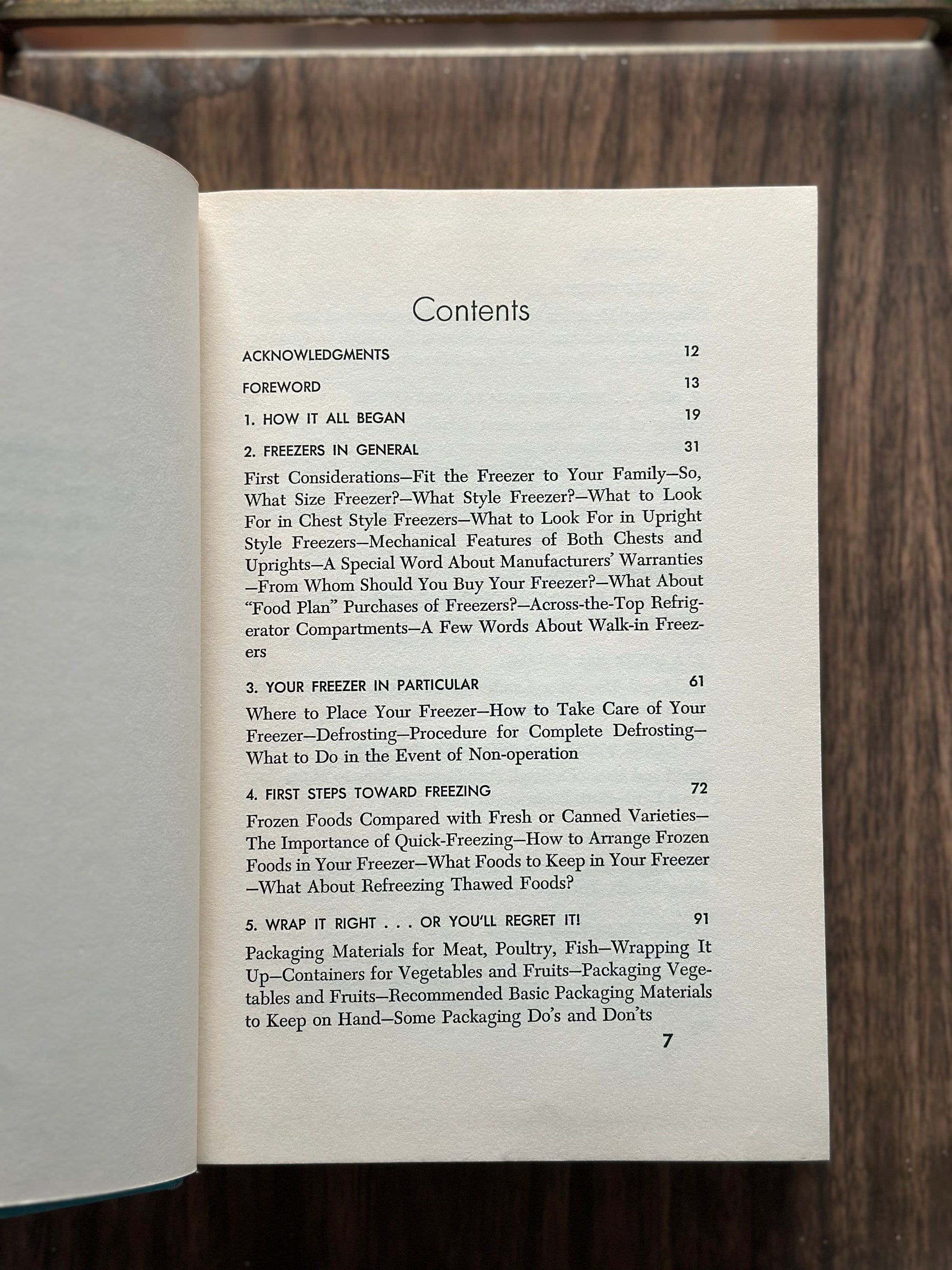 Contents include: How It All Began, Freezers in General, Your Freezer in Particular, First Steps Toward Freezing, Wrap It Right...Or You'll Regret It!, Mostly About Meat, Beef...From the Barn to Your Freezer, Ventures in Veal, A Larder Full of Lamb, Going Whole Hog with Pork and Ham, Variety Meats, Poultry in Your Freezer, Freezing Fish & Shellfish, Freezing Wild Game, Freezing Dairy Foods, Freezing Vegetables from A to Z, Fruits for Freezing, Freezing Berries, Freezing Melons, Frozen Food Cookery, Baker's Dozens, Recipes for the Freezer, Random Facts, & Fancies, & Foibles.