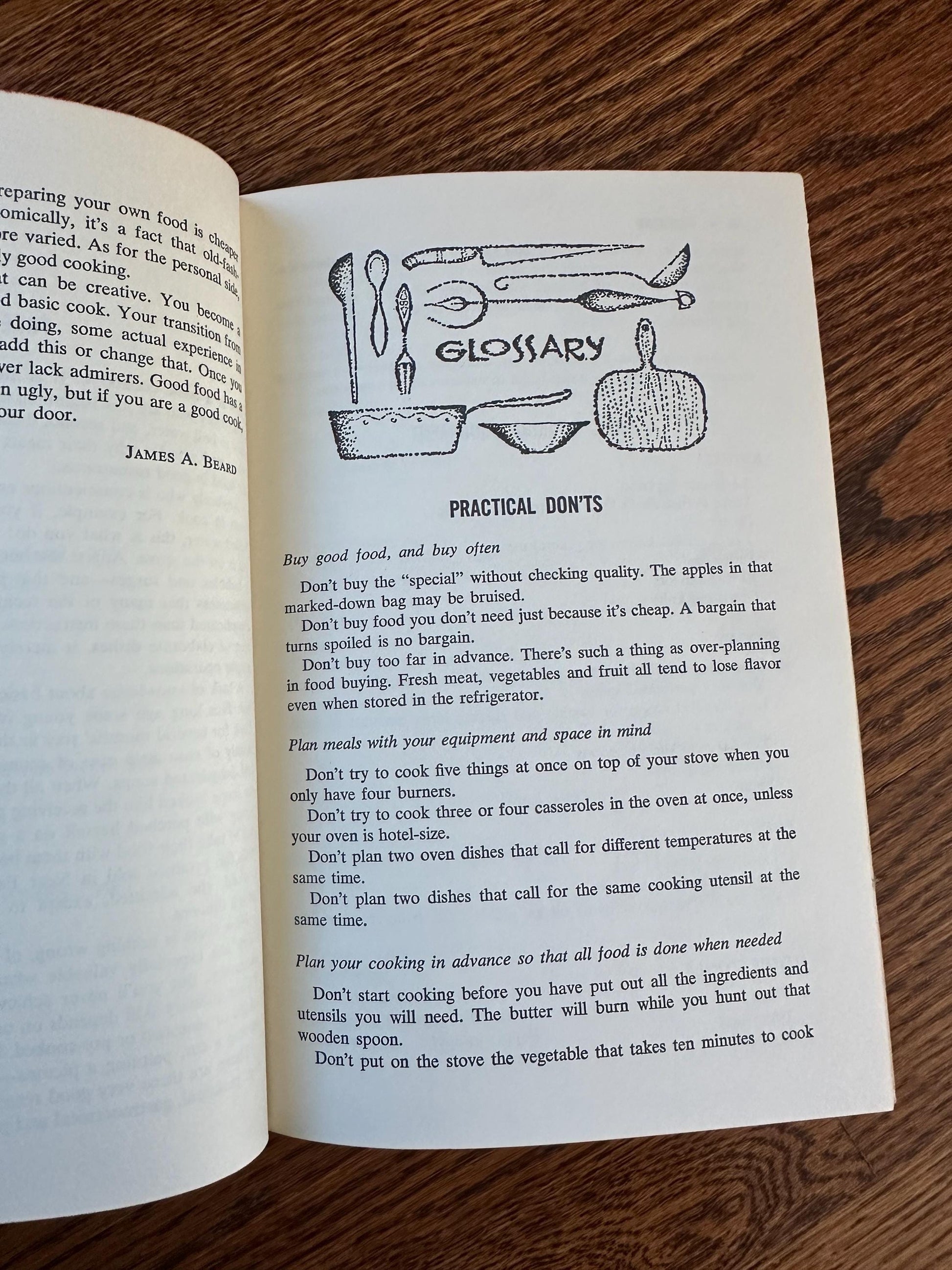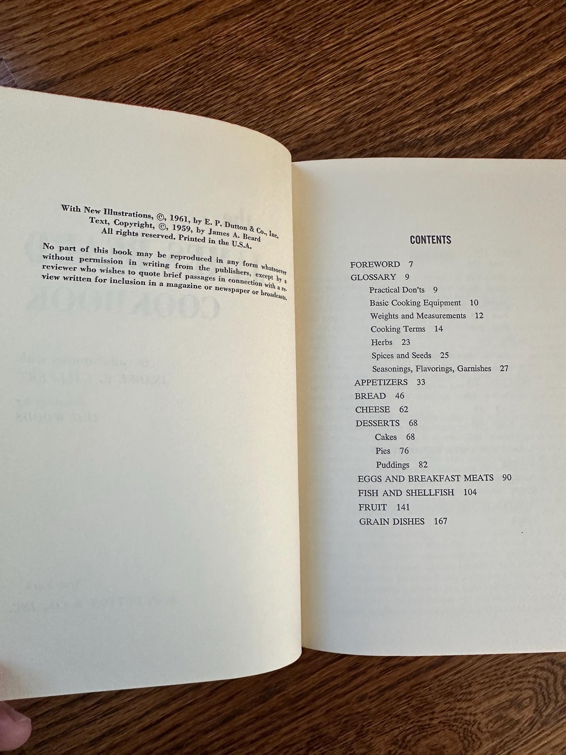 Drawings by Luiz Woods. Copyright 1961 (with new illustrations) by E.P. Dutton & Co., Inc. Text Copyright 1959, by James A. Beard. Printed in USA.