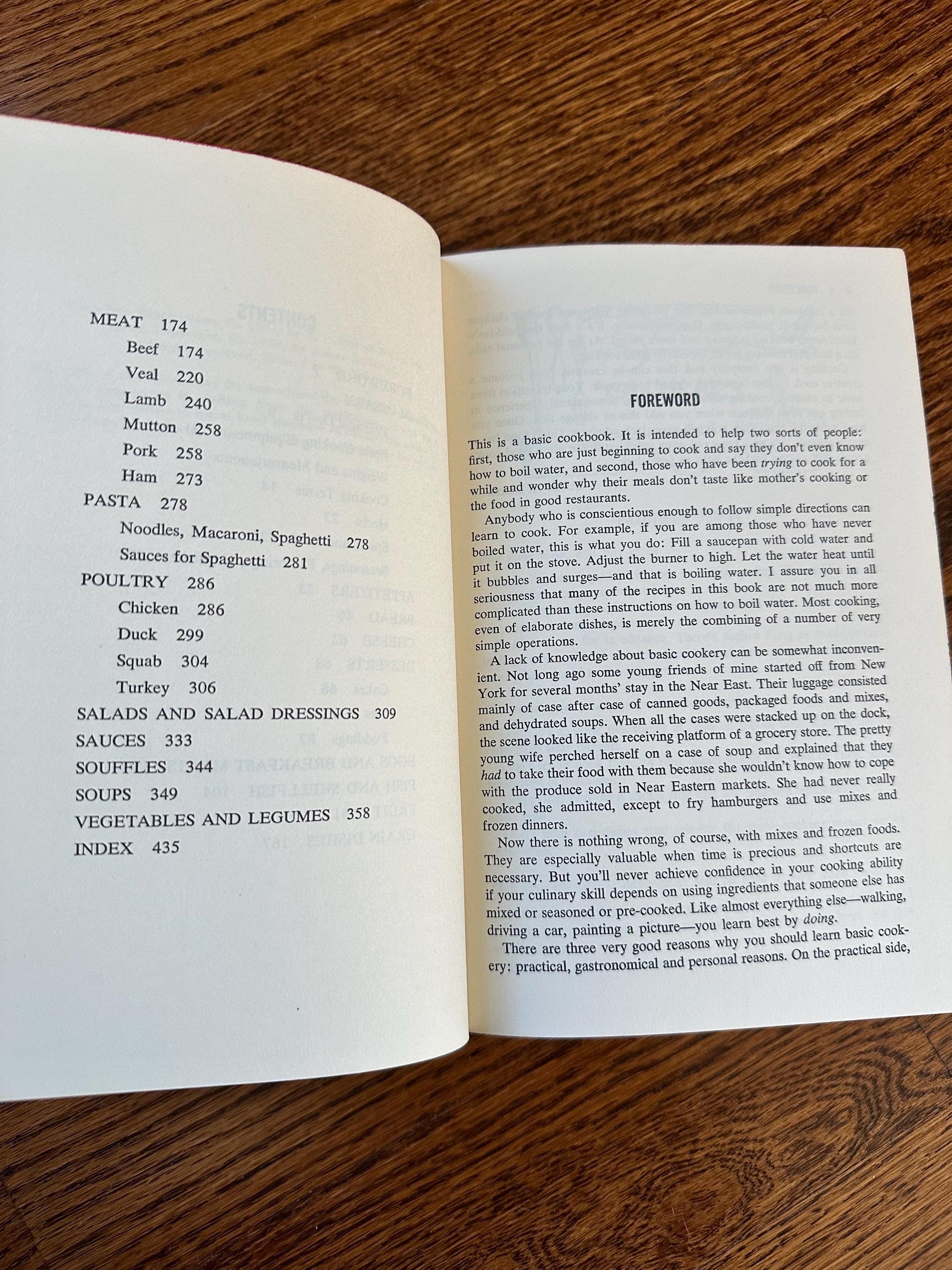 Contents include: Glossary, Appetizers, Bread, Cheese, Desserts, Eggs and Breakfast Meats, Fish and Shellfish, Fruit, Grain Dishes, Meat, Pasta, Poultry, Salads and Salad Dressings, Sauces, Soufflés, Soups, Vegetables, and Index.