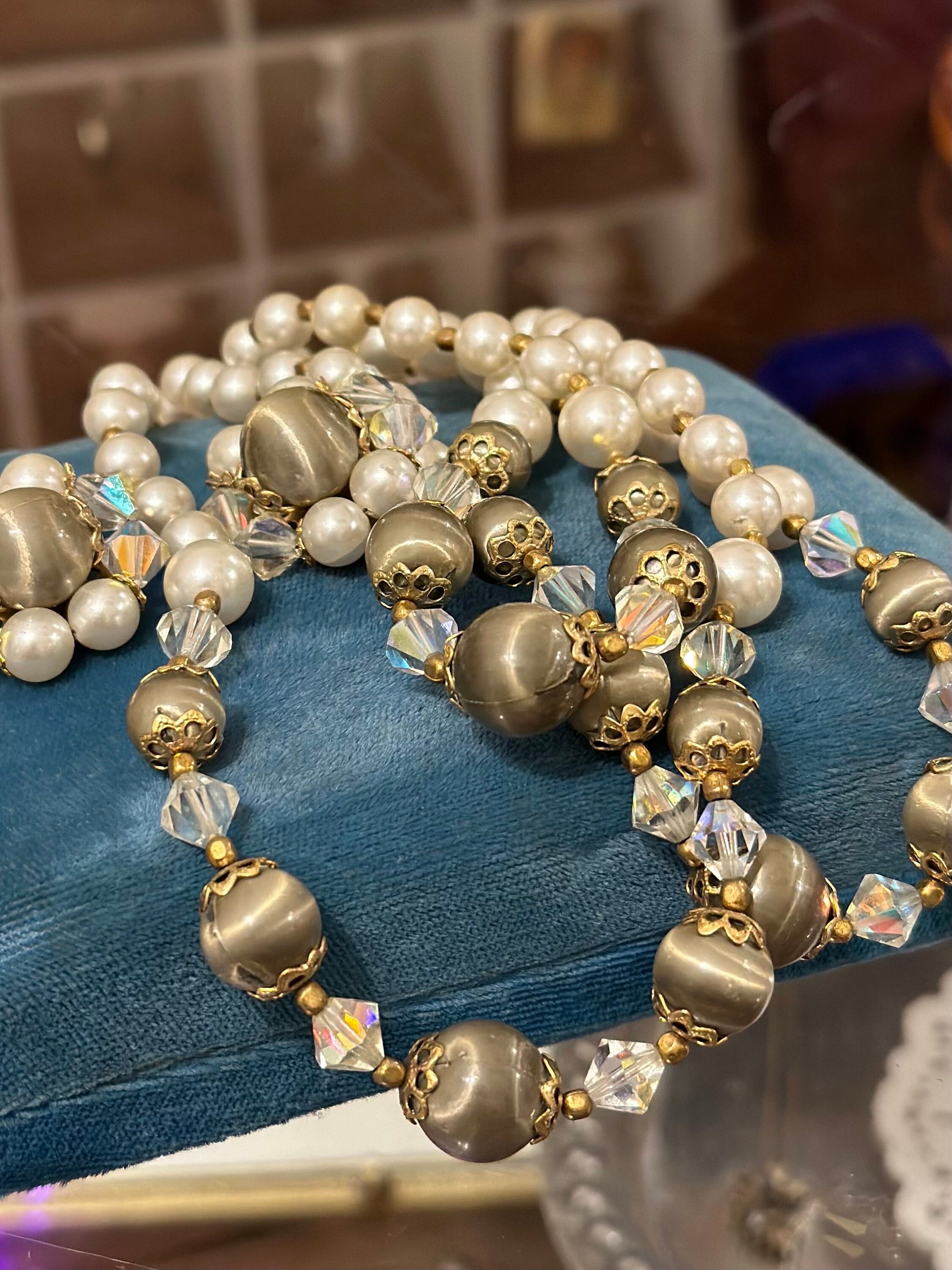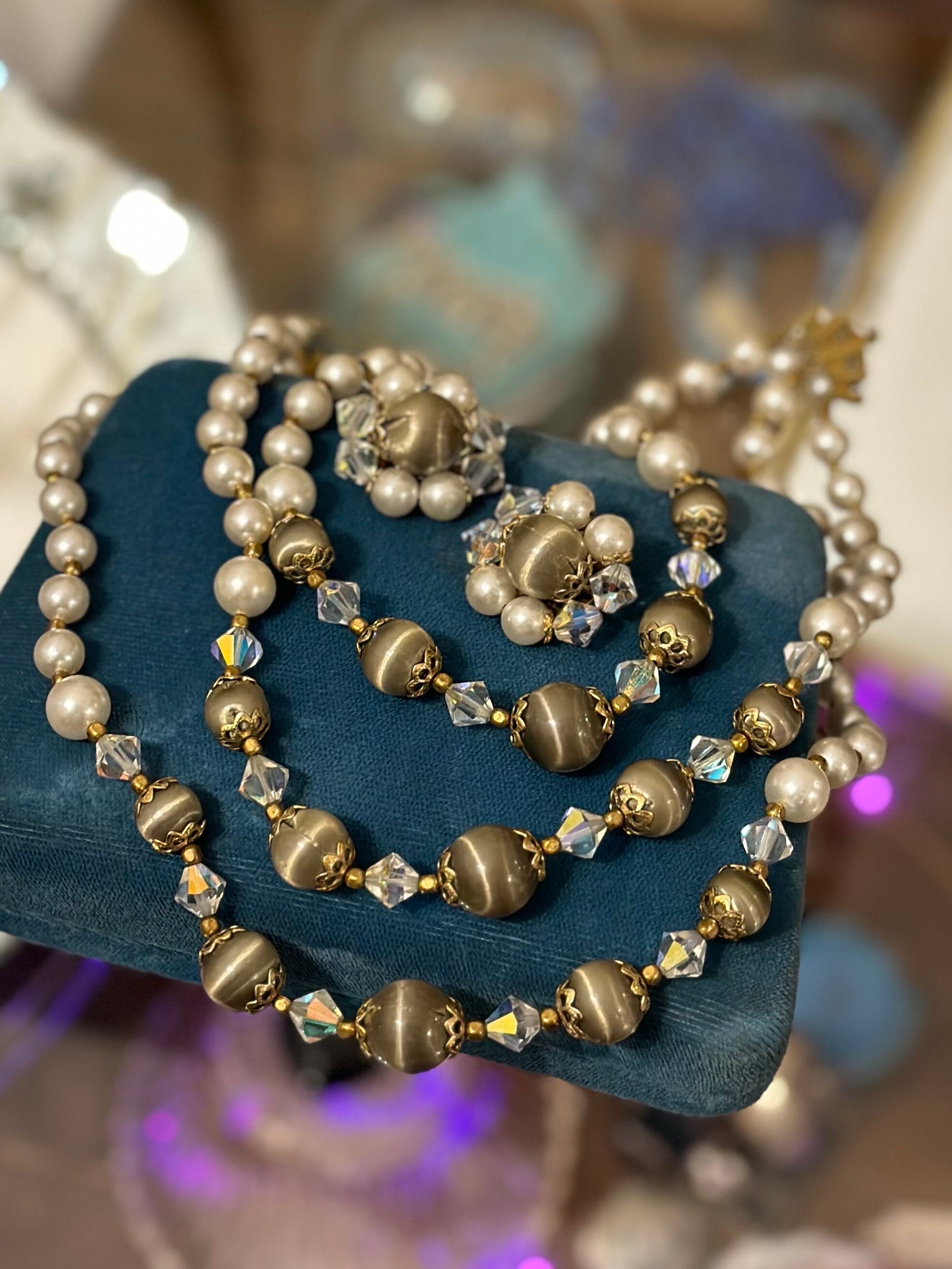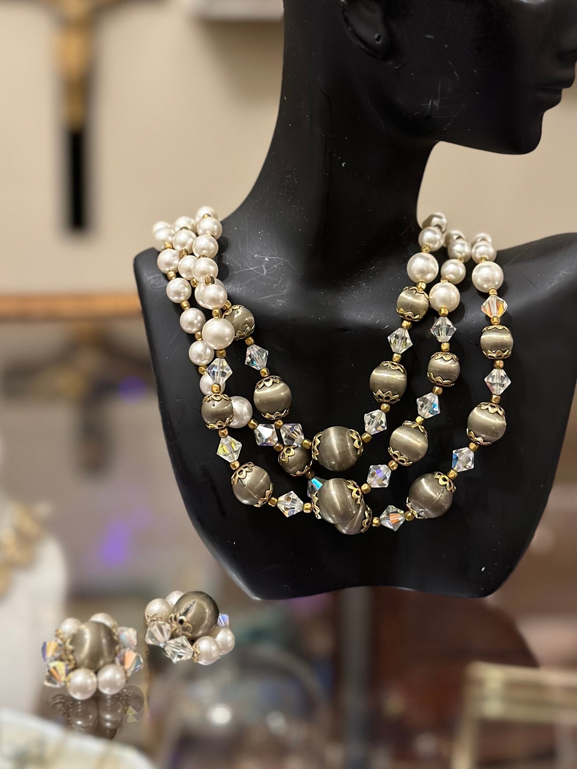1960s Faux Taupe & Cream Pearl and Crystal Beaded Triple Strand Choker Collar Necklace with Matching Clip-On Earrings