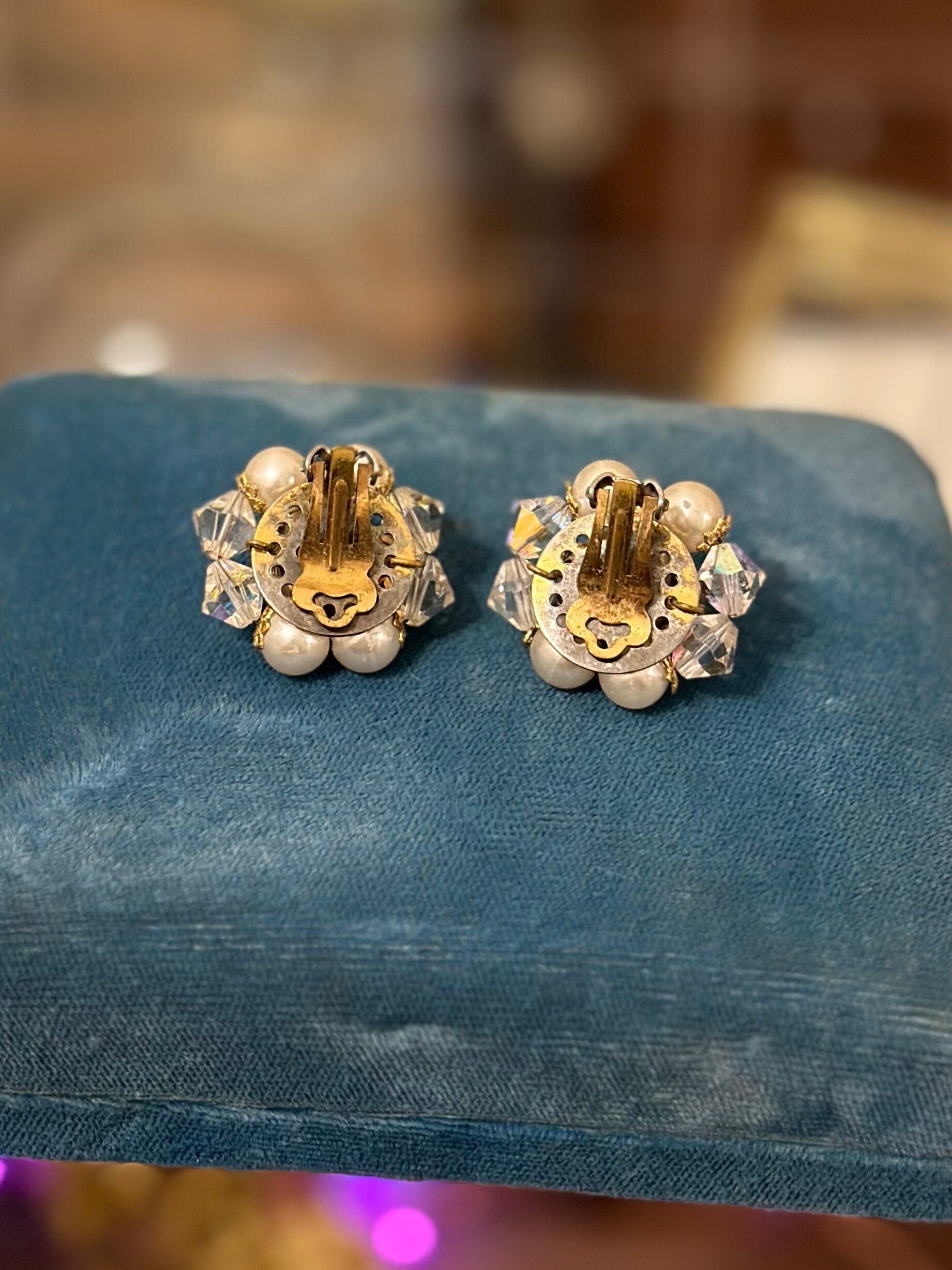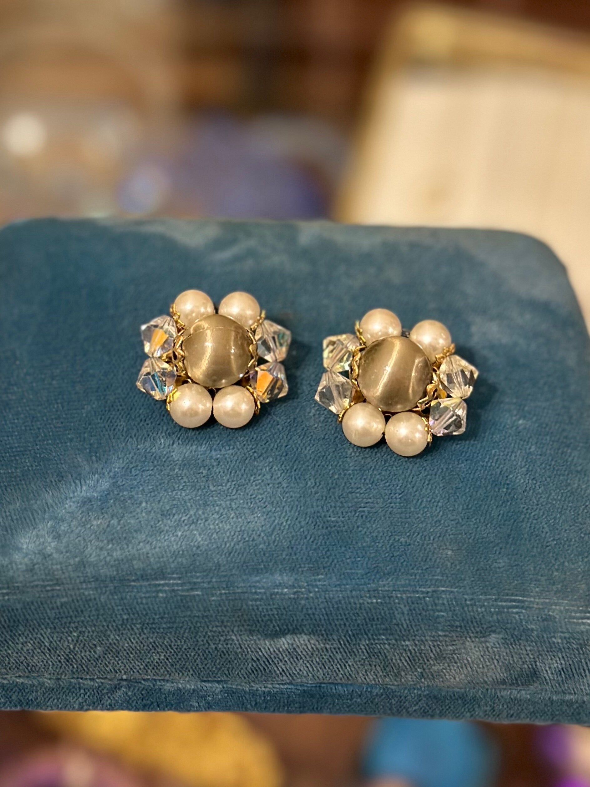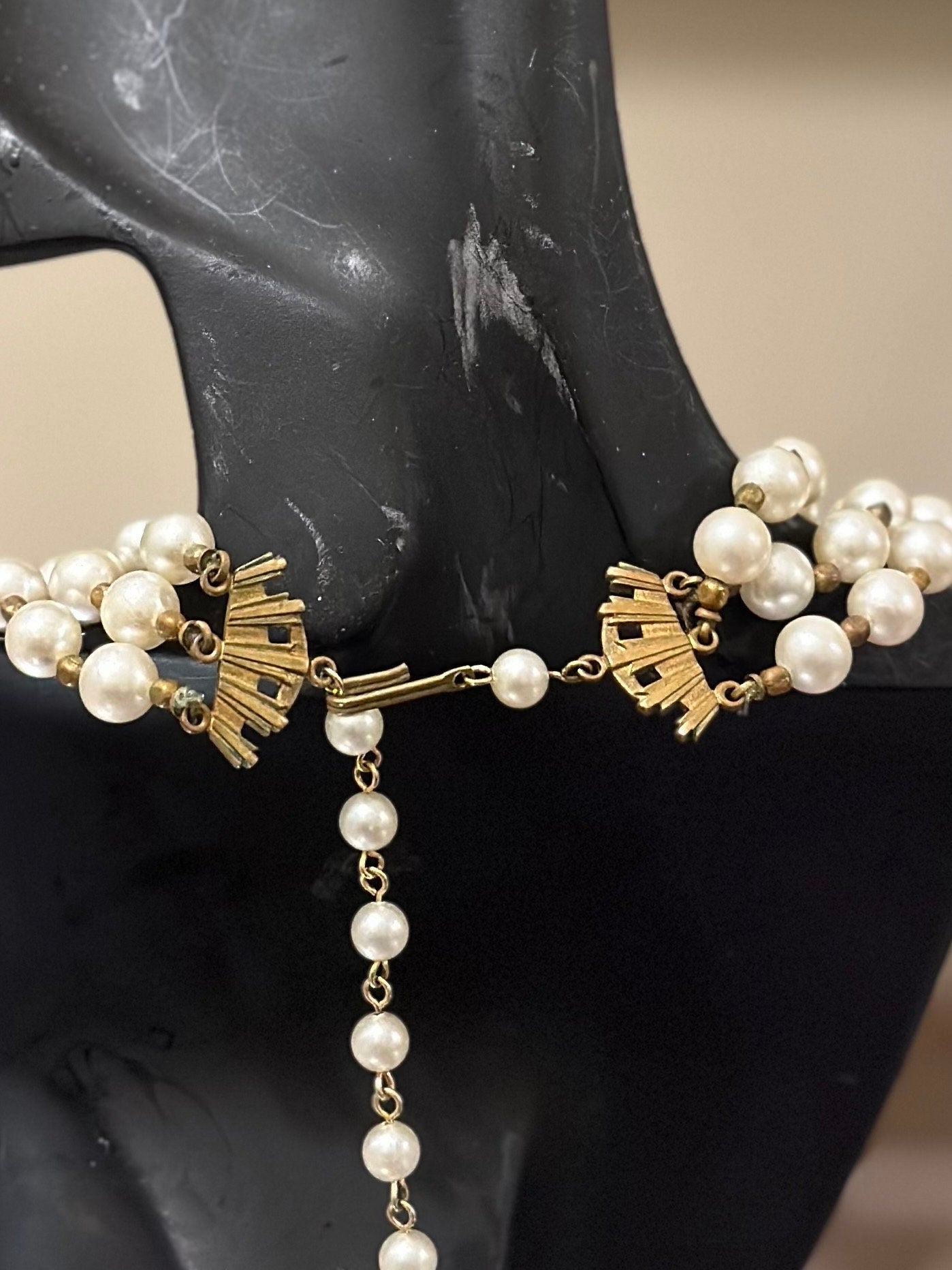 1960s Faux Taupe & Cream Pearl and Crystal Beaded Triple Strand Choker Collar Necklace with Matching Clip-On Earrings