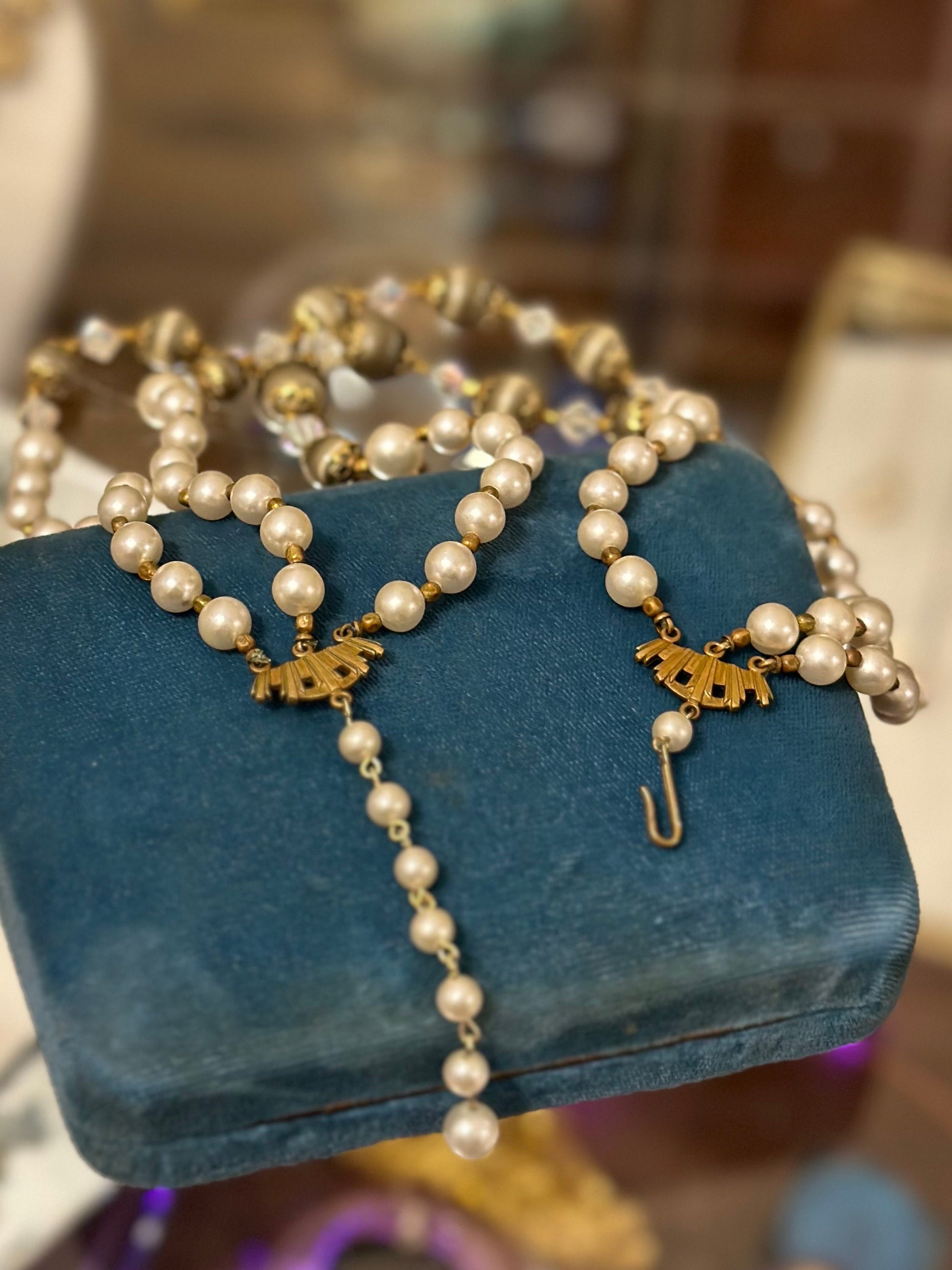 Necklace measures approximately 16 inches long and has a hook closure, which allows it to be adjustable. Ends of necklace are affixed with geometric art deco style fixtures that hold all three strands together.