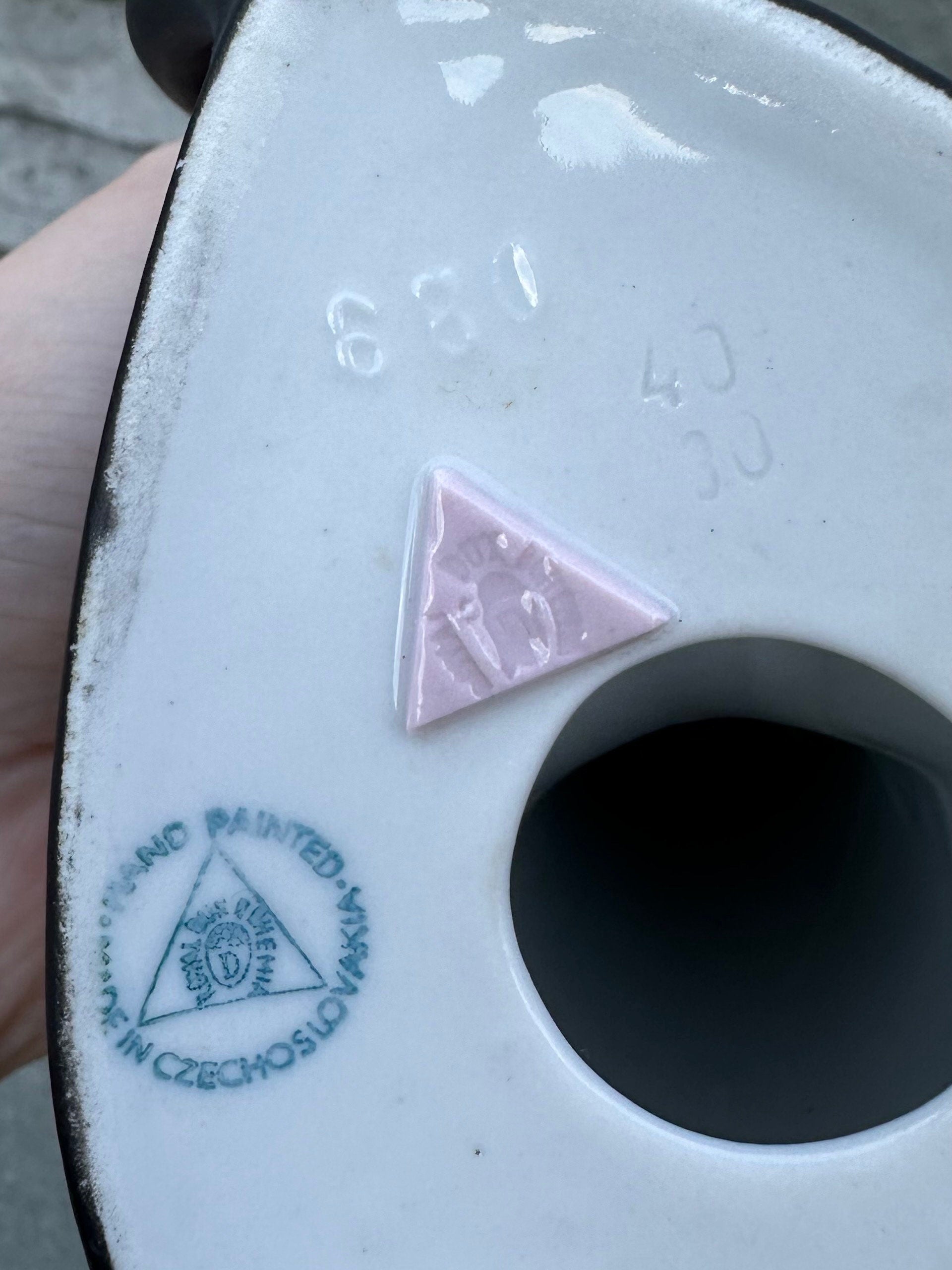 Bottom of figurine has raised triangle maker’s mark and stamped maker’s mark that states “ROYAL DUX BOHEMIA - hand painted in Czechoslovakia”.