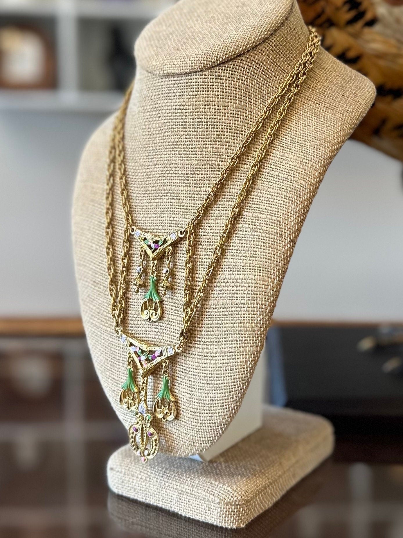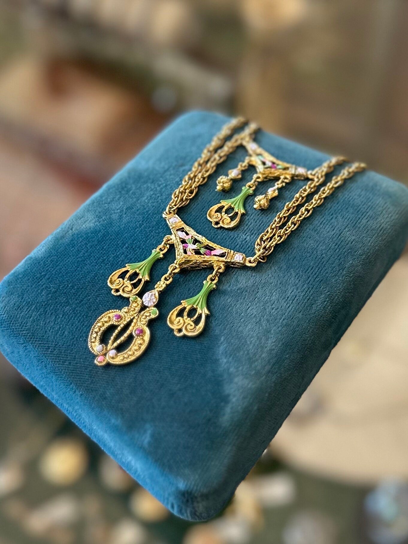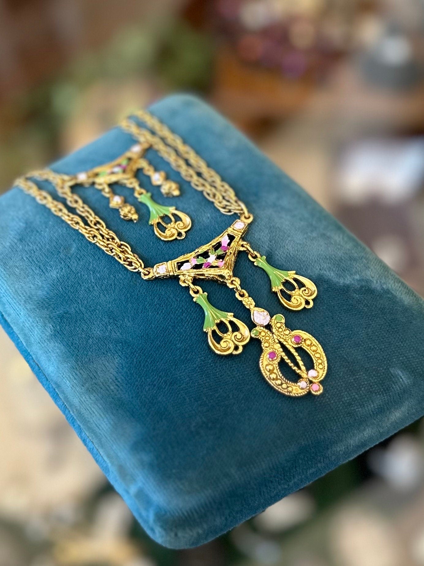 1960s Unsigned KRAMER Gold Tone Etruscan Revival Enamel Pendant Statement Necklace NWT