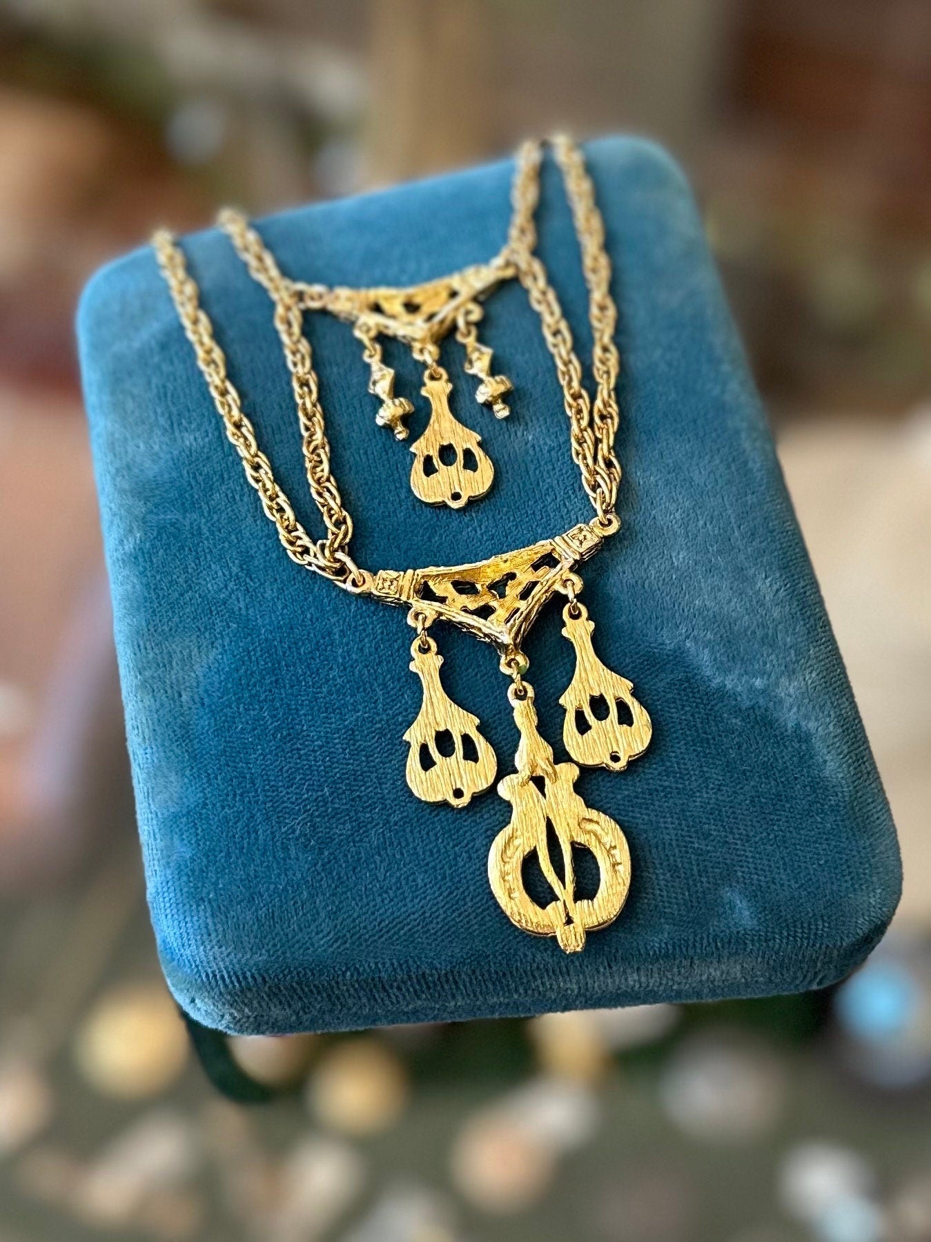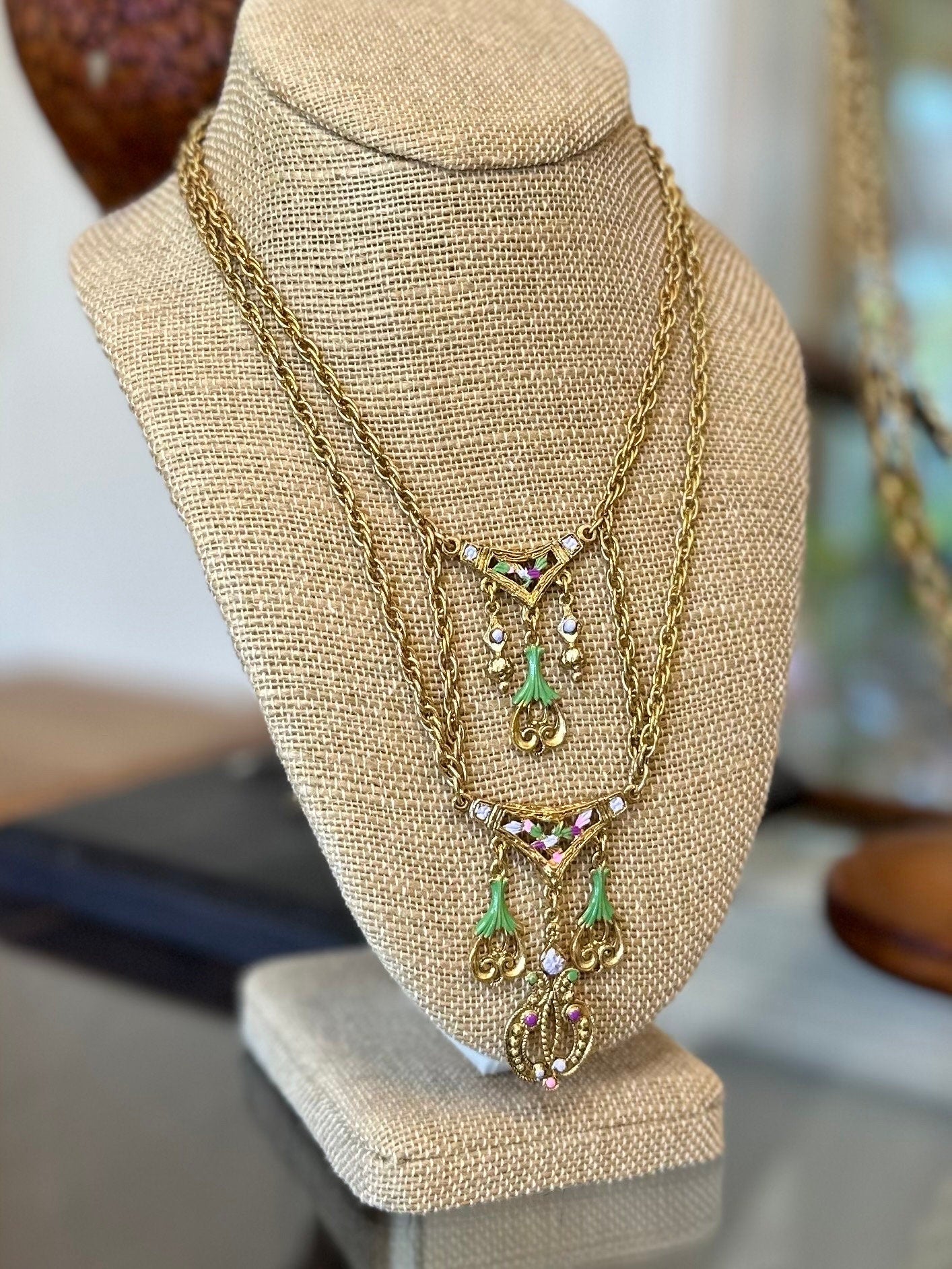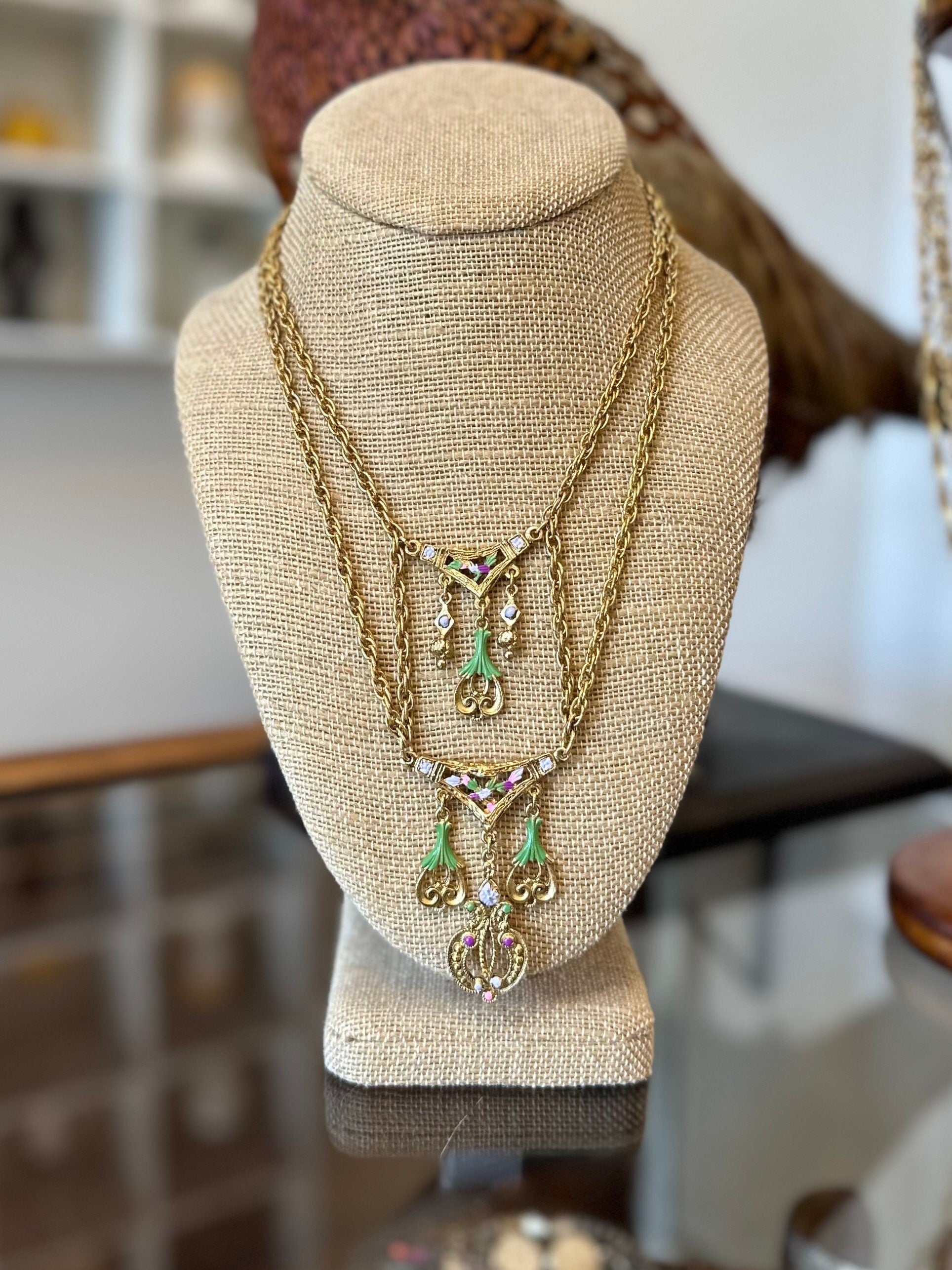 1960s Unsigned KRAMER Gold Tone Etruscan Revival Enamel Pendant Statement Necklace NWT