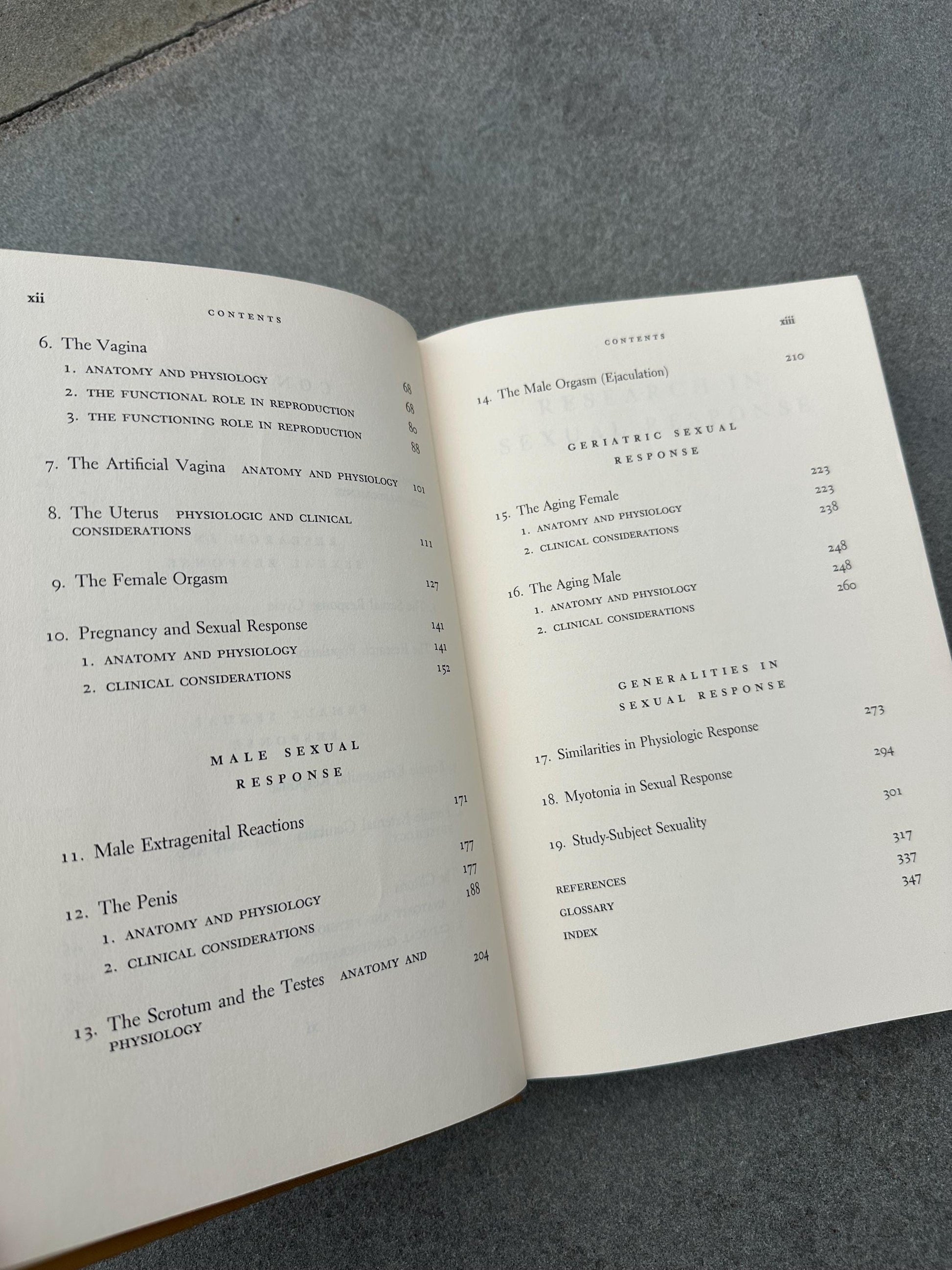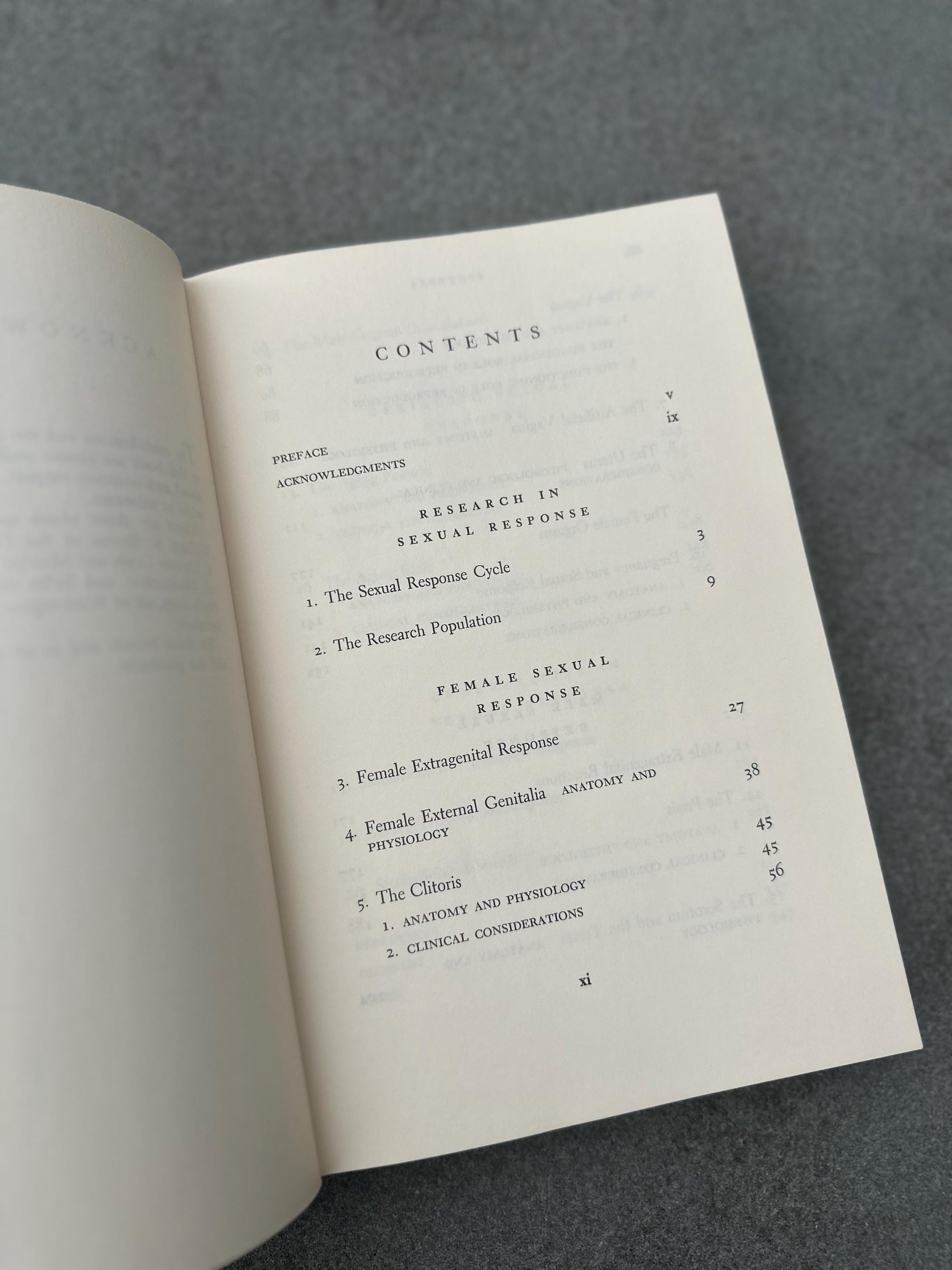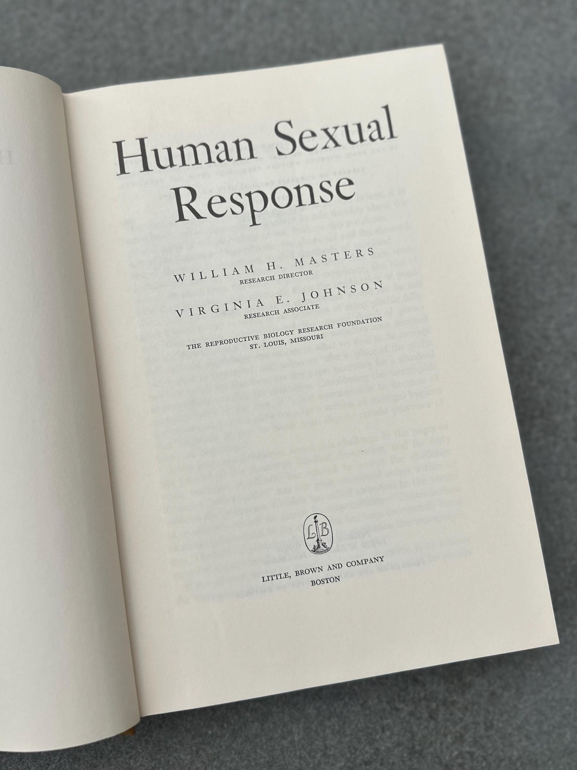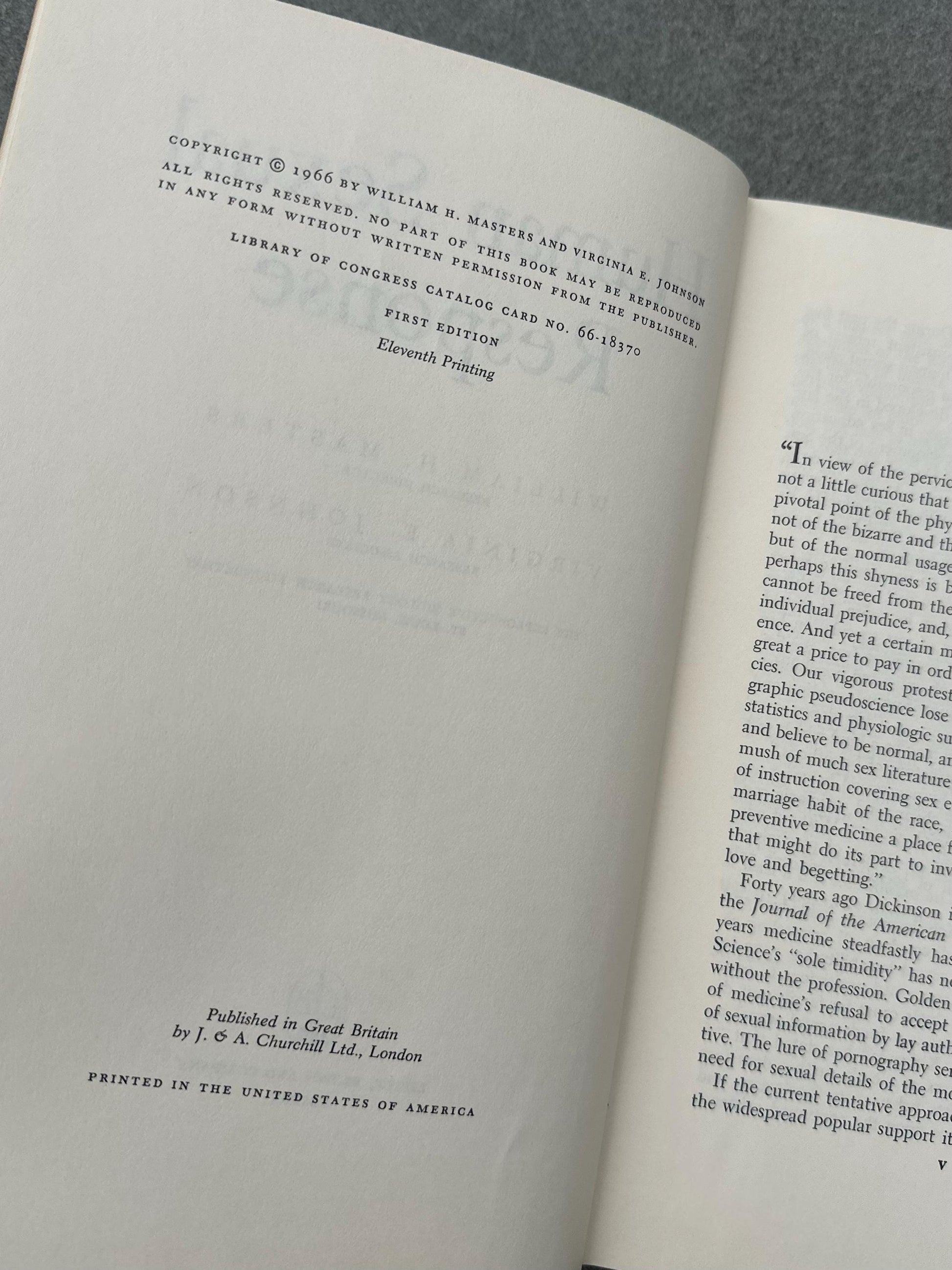Copyright 1966 by William H. Masters (Research Director) & Virginia E. Johnson (Research Associate). The Reproductive Biology Research Foundation. Little, Brown and Company, Boston. First Edition, 11th Printing. Published in Great Britain. Printed in USA.