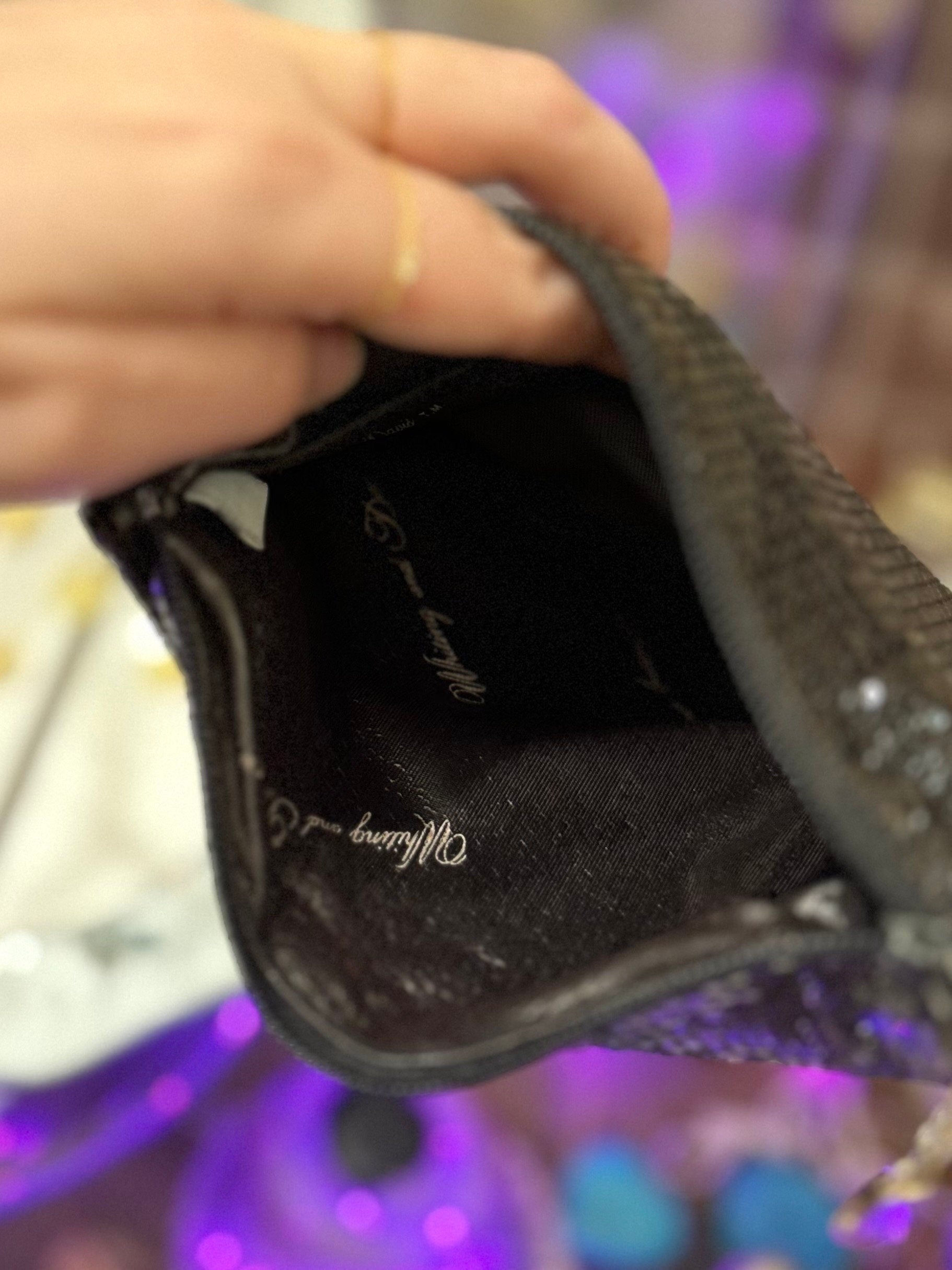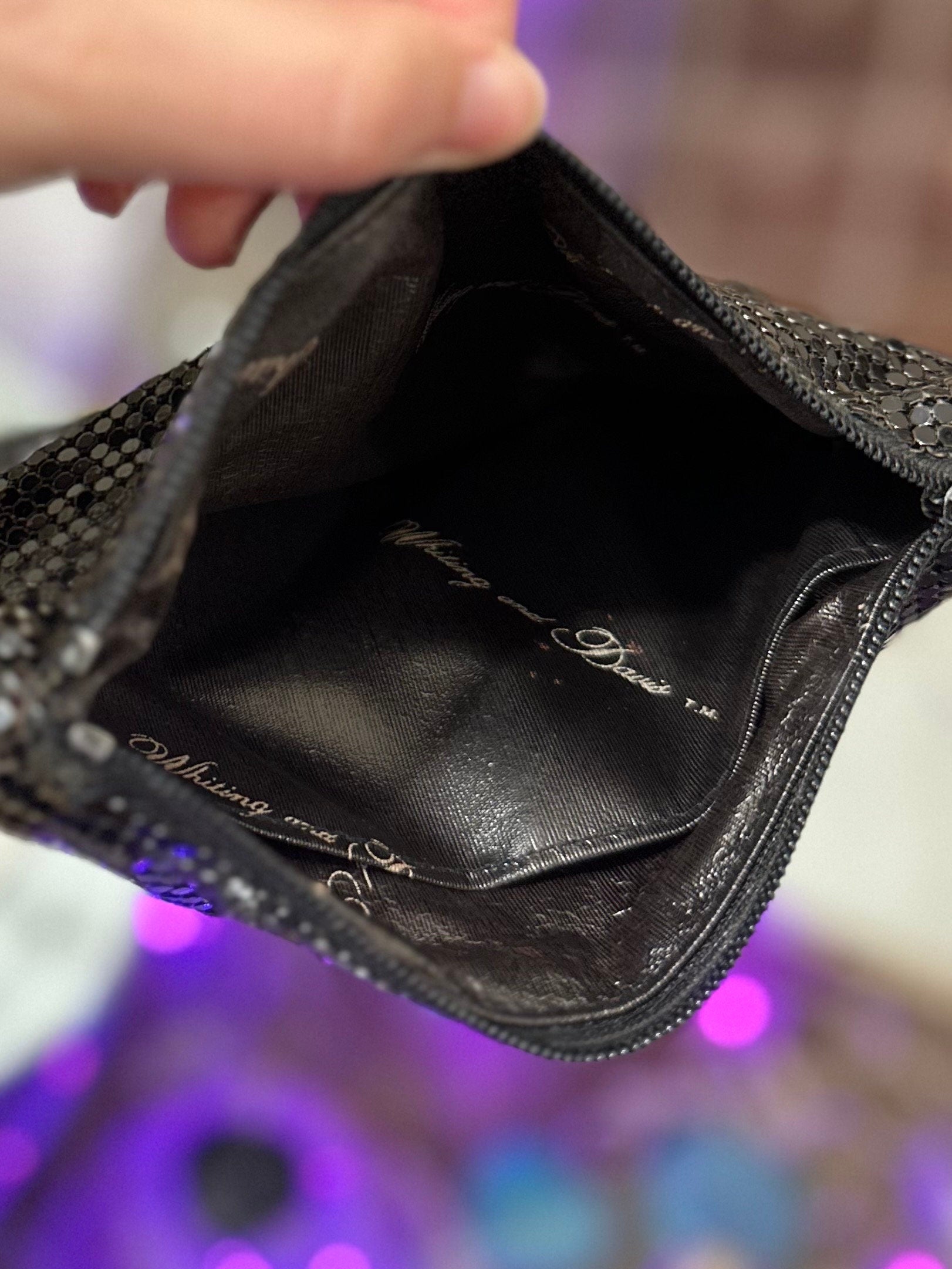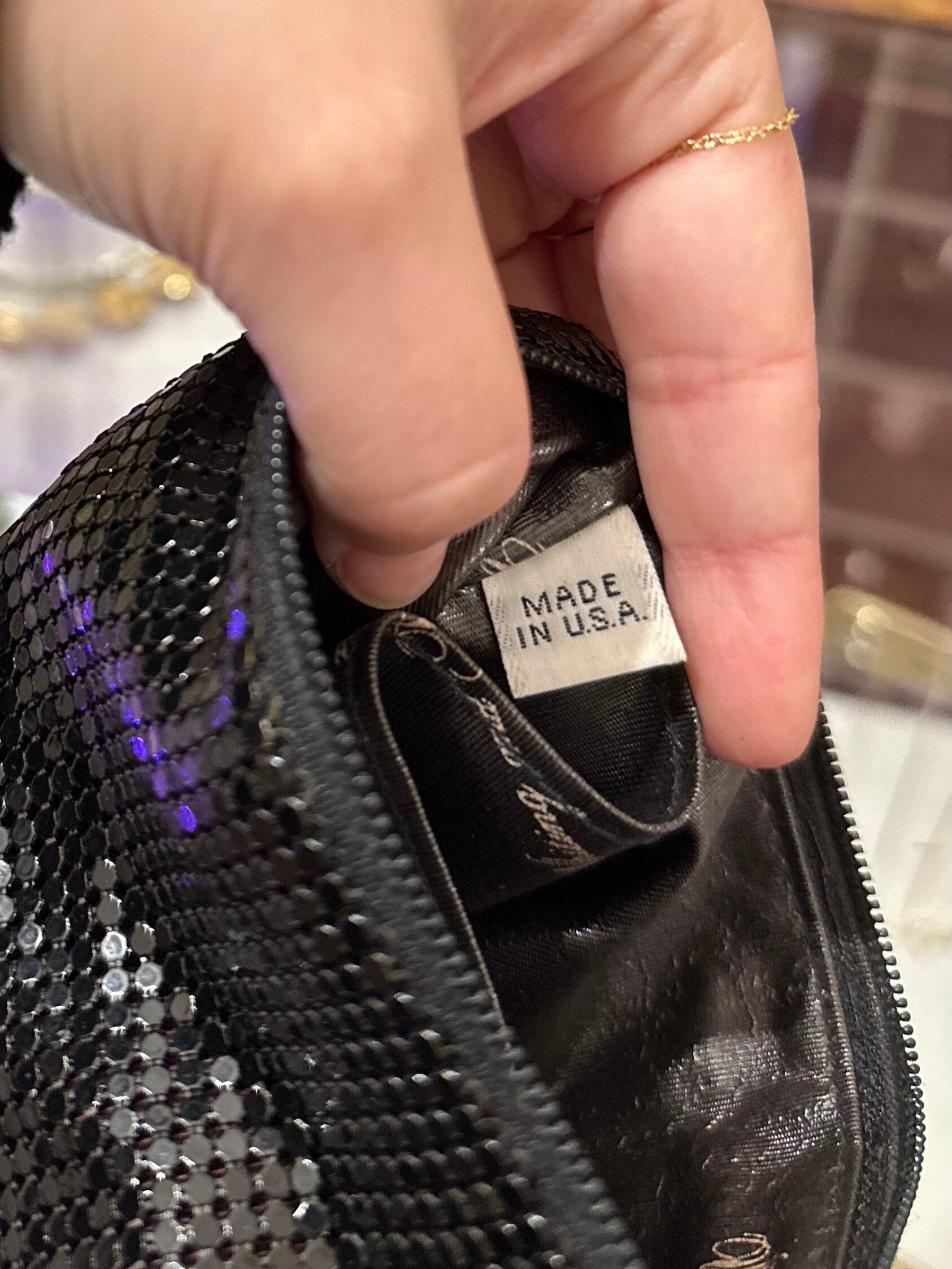Clutch measures approximately 7 inches long by 5.4 inches wide. Black TALON zipper with an oval hang tag signed Whiting & Davis. Inside lining is branded with Whiting & Davis logo all over. There is a fabric tag inside that states Made in USA.