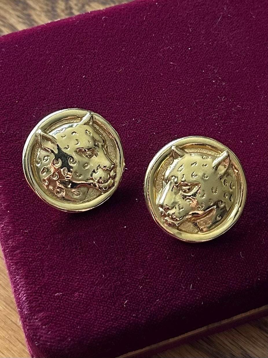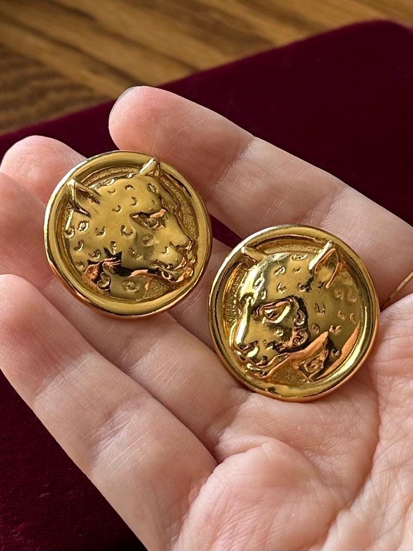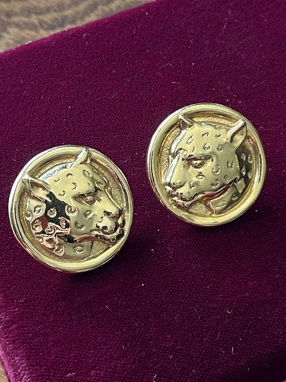 1980s 1990s Gold Tone Large Leopard Cheetah Pierced Statement Earrings