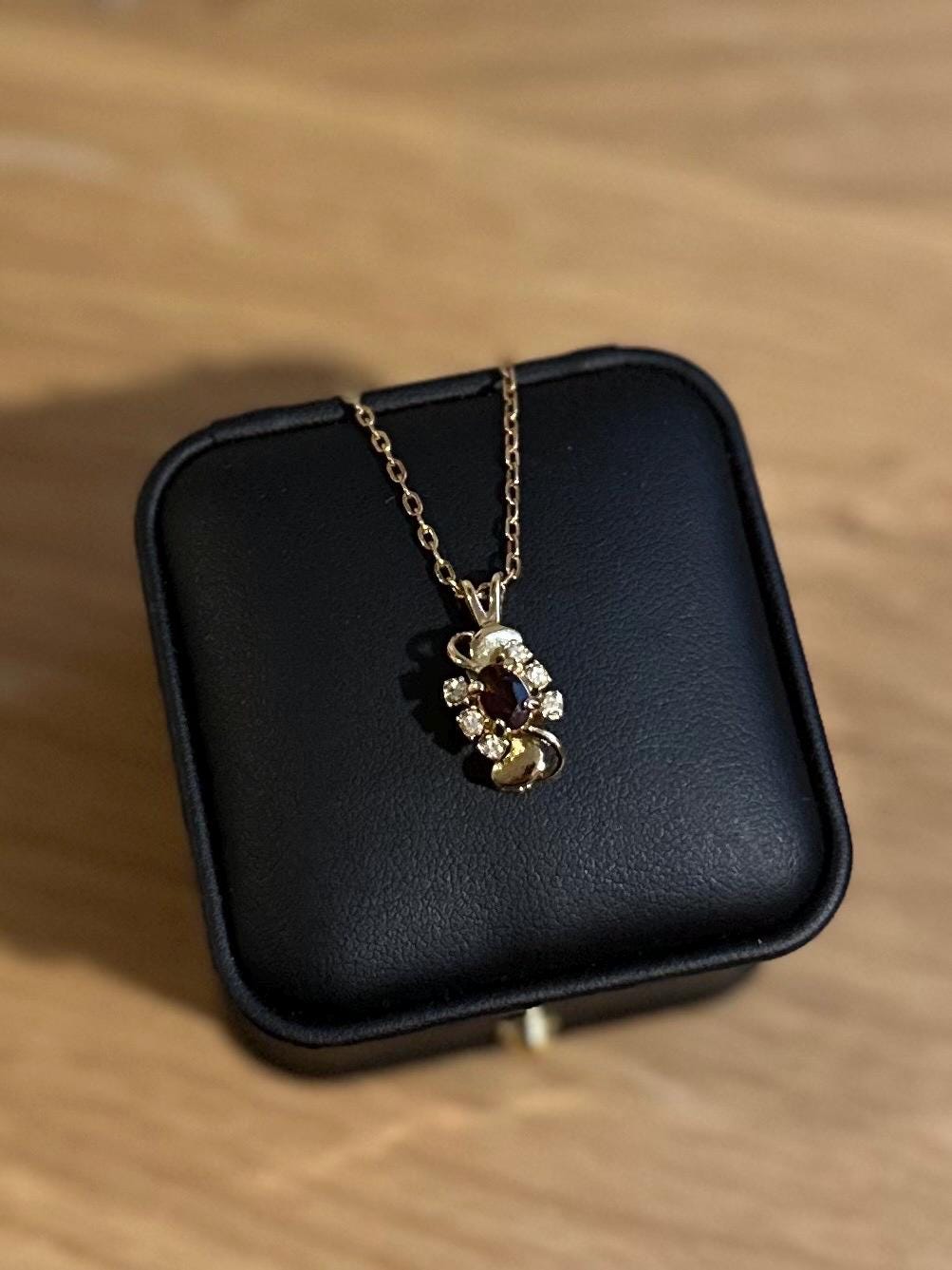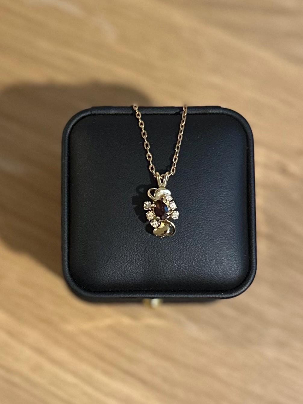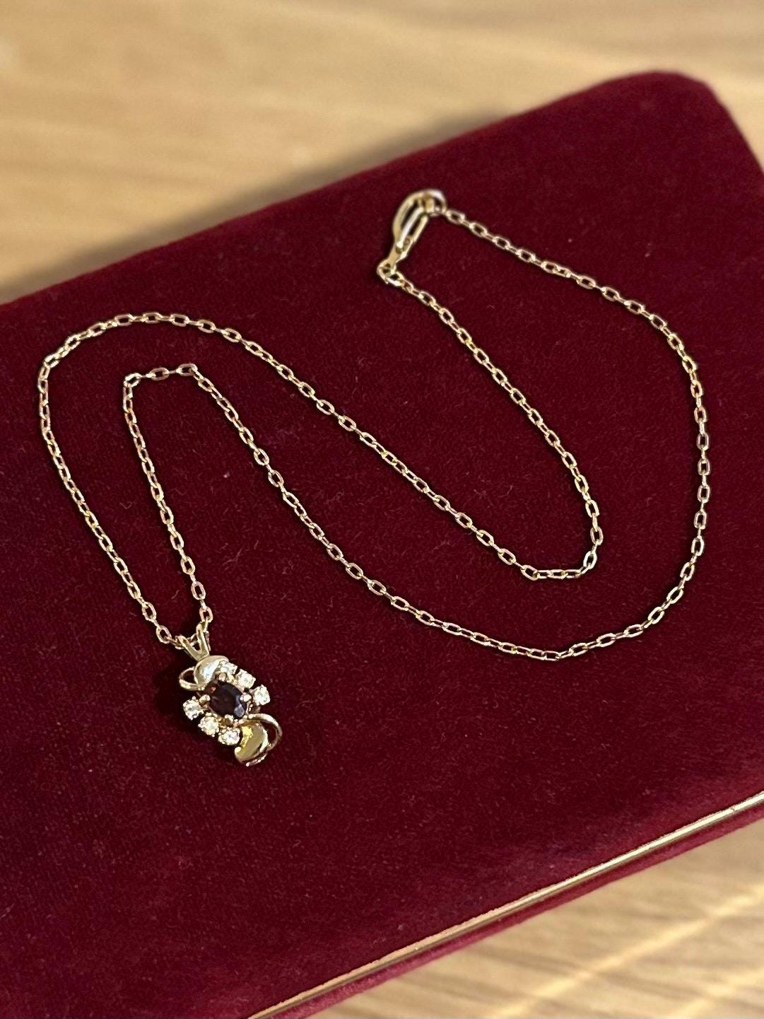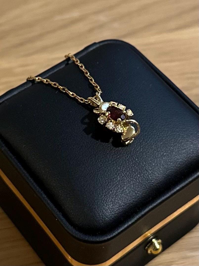 1980s Gold Tone Faux Garnet & Rhinestone Swirl Pendant Necklace