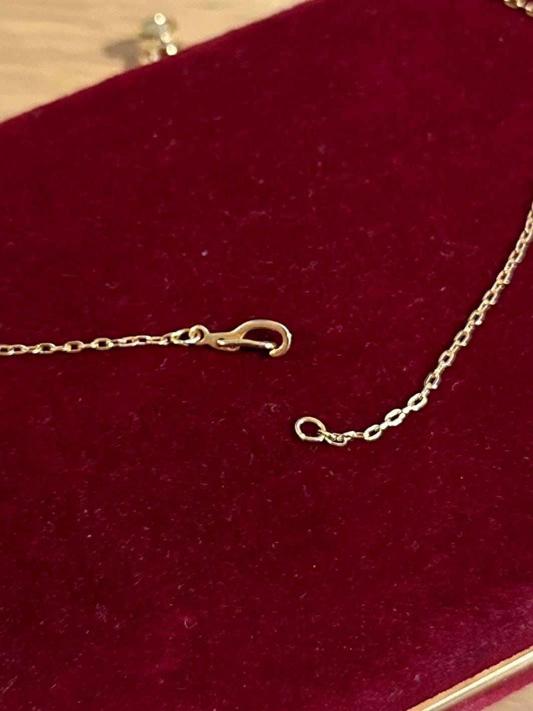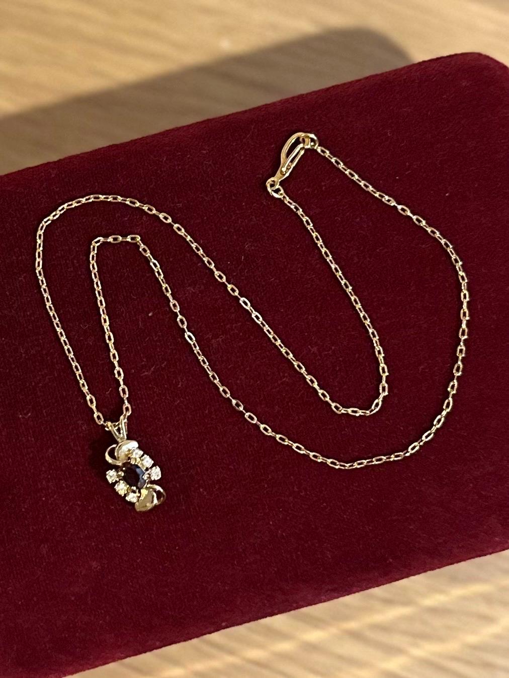 Chain measures approximately 15.75 inches long and has a lobster claw clasp. Pendant measures approximately 0.75 inches long by 0.4 inch wide.