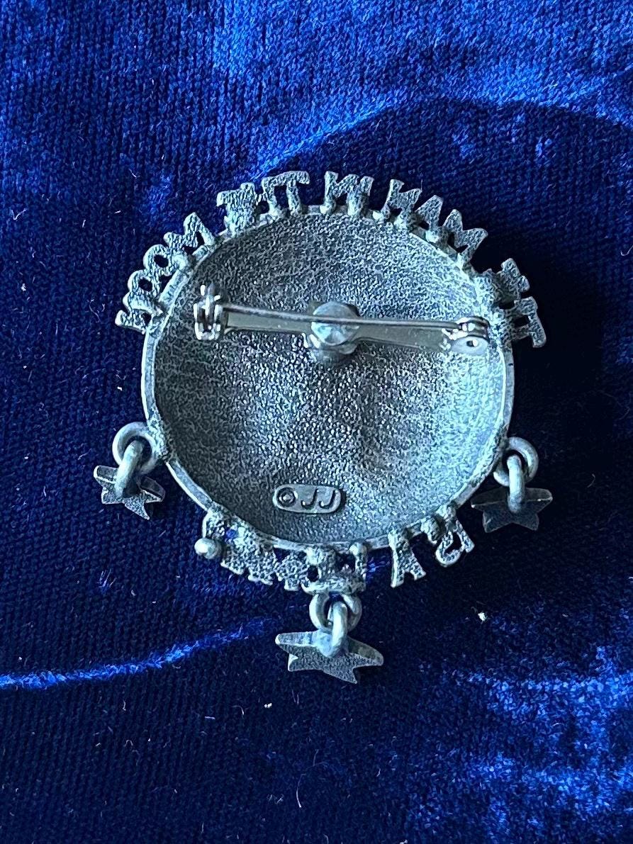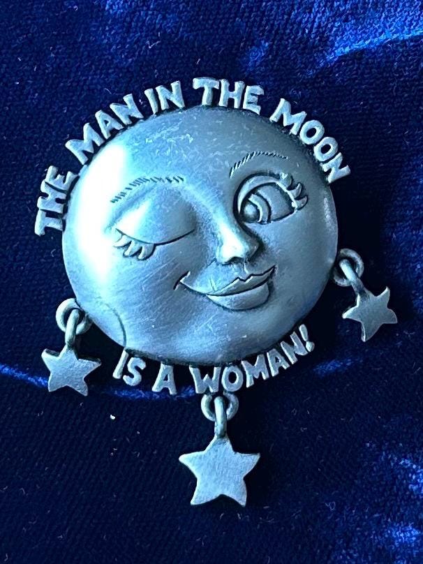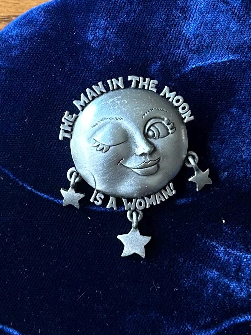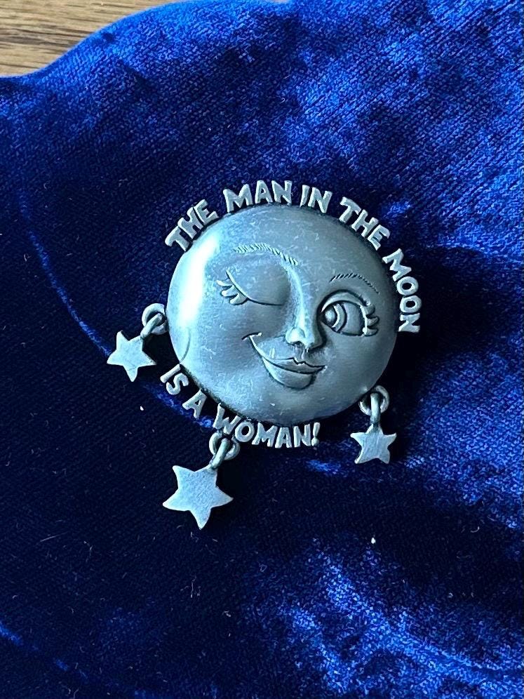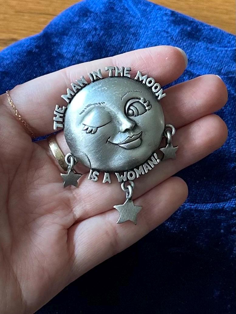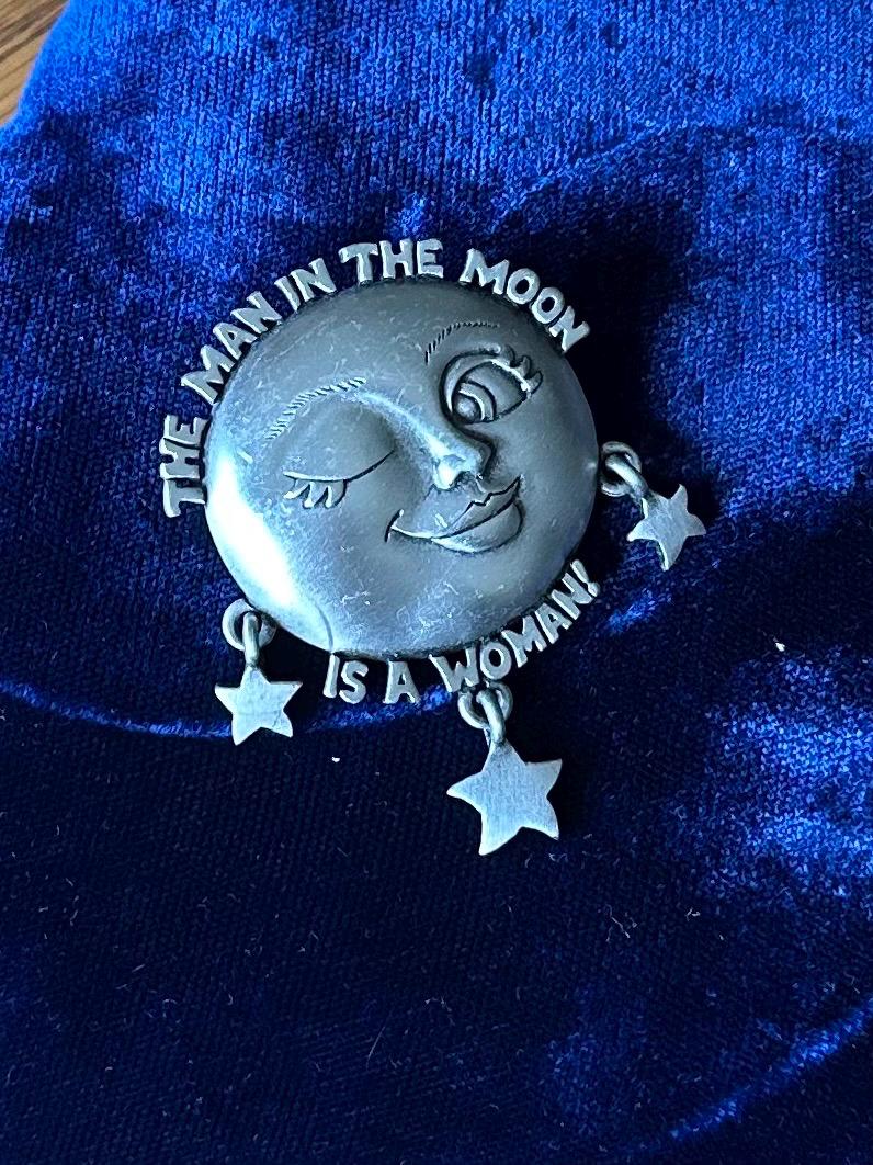 1980s Signed JJ Jonette The Man in the Moon is a Woman Celestial Moon & Stars Silver Tone Brooch