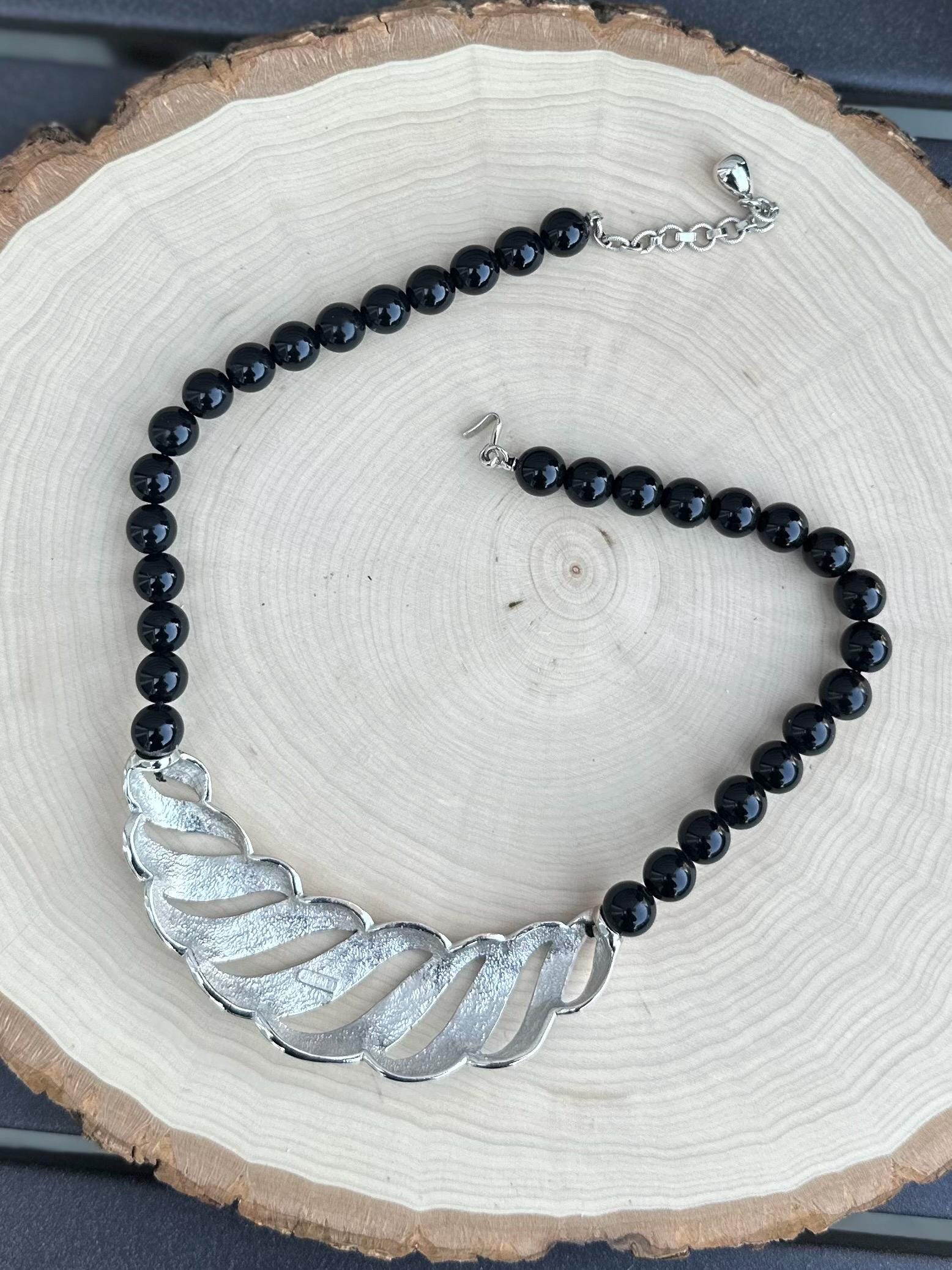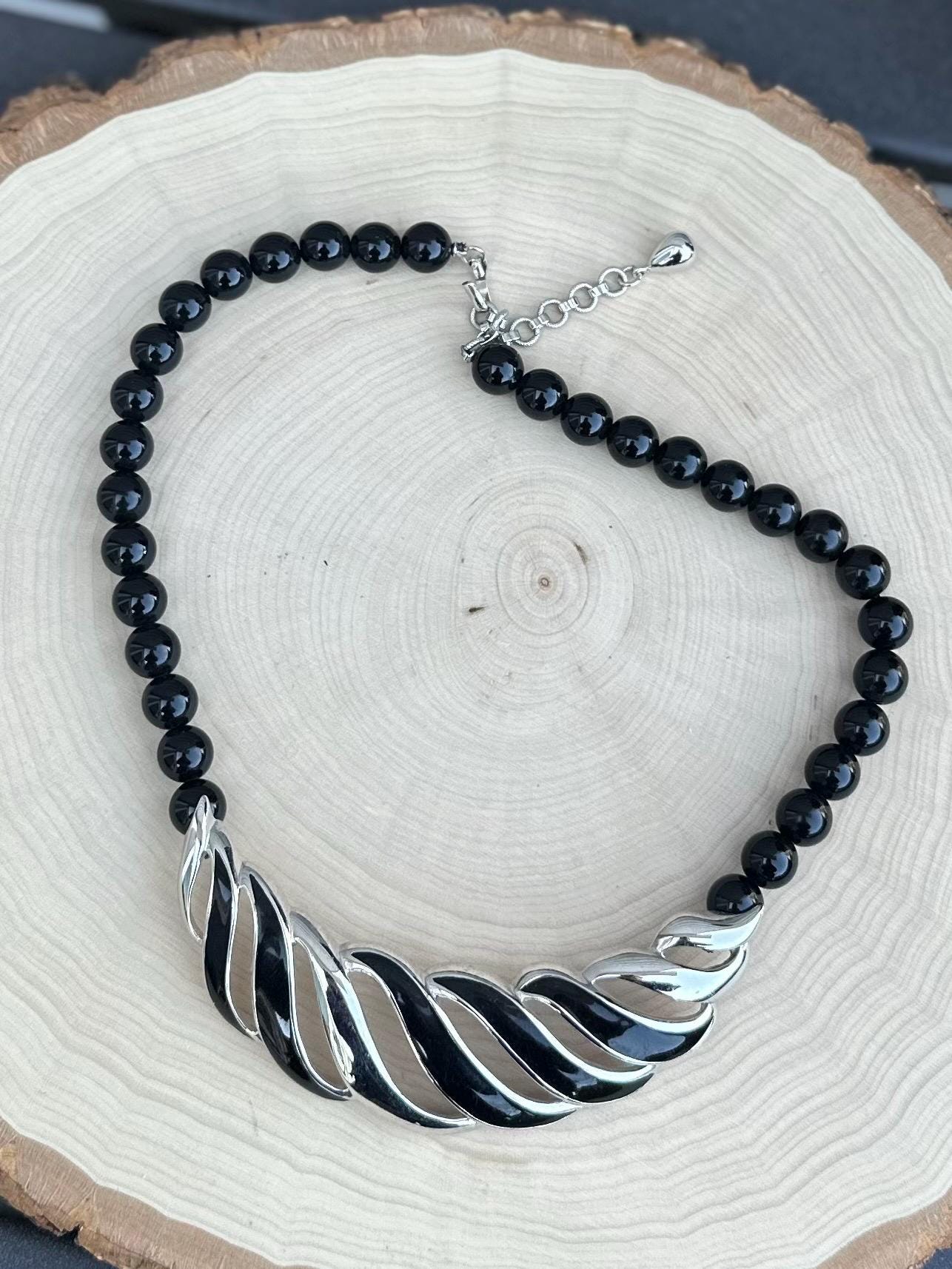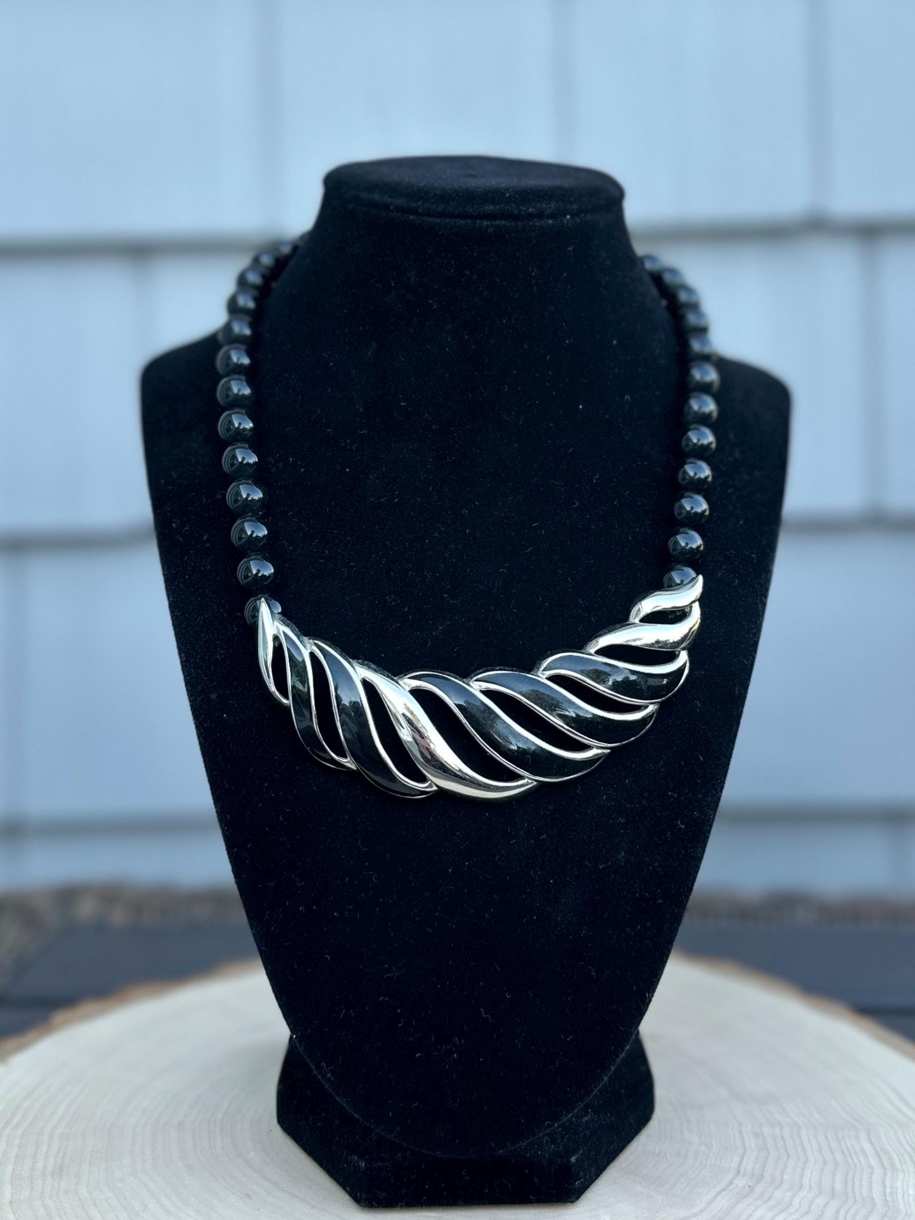 1980s Signed MONET Black & Silver Tone Beaded Collar Bib Necklace Adjustable