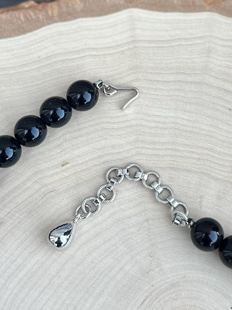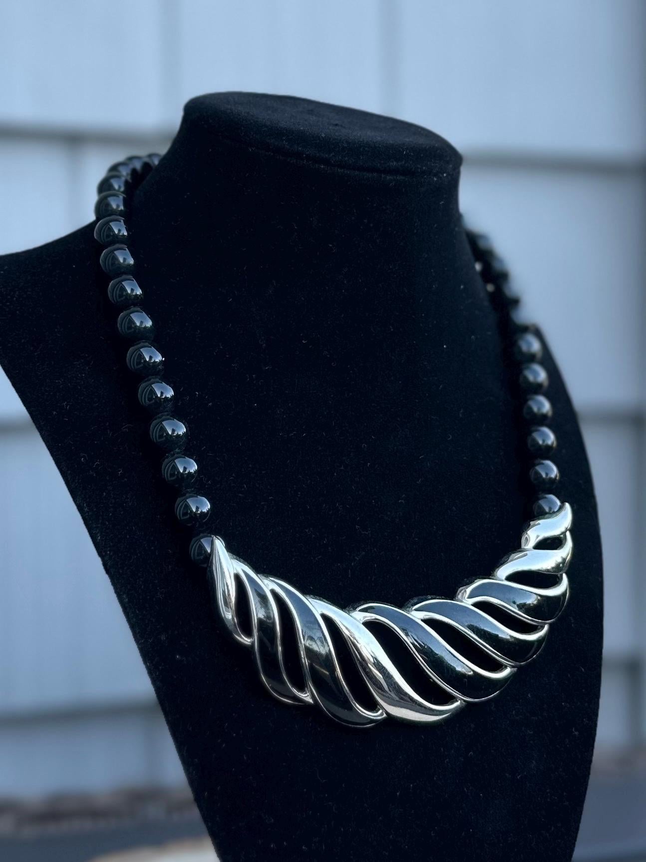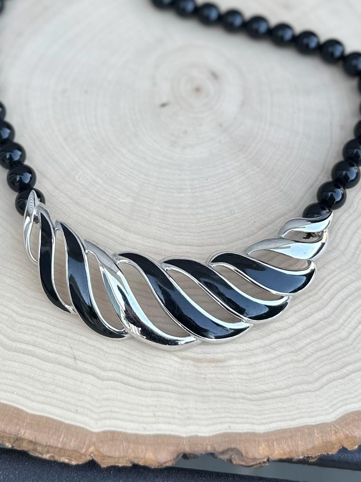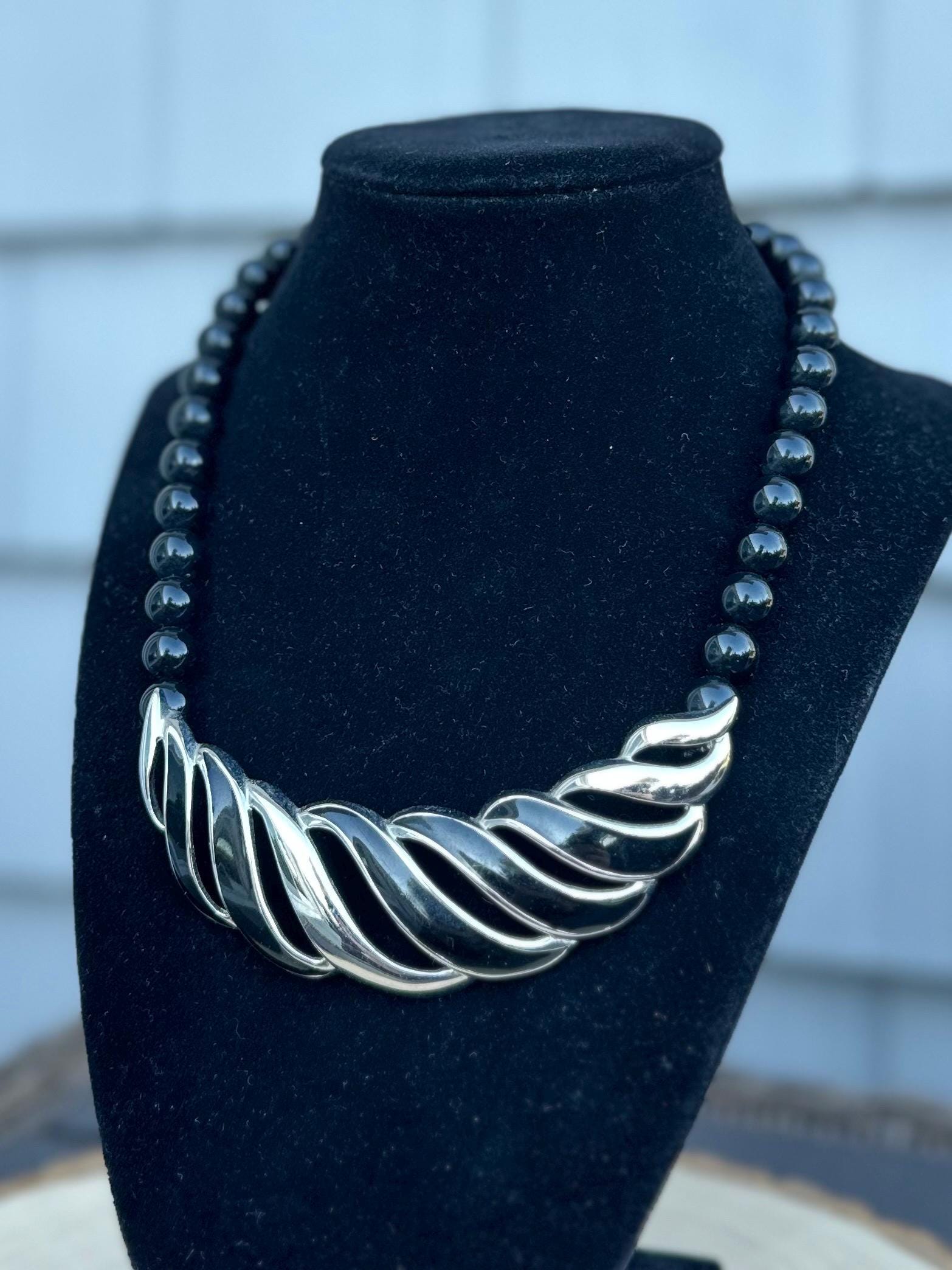 1980s Signed MONET Black & Silver Tone Beaded Collar Bib Necklace Adjustable