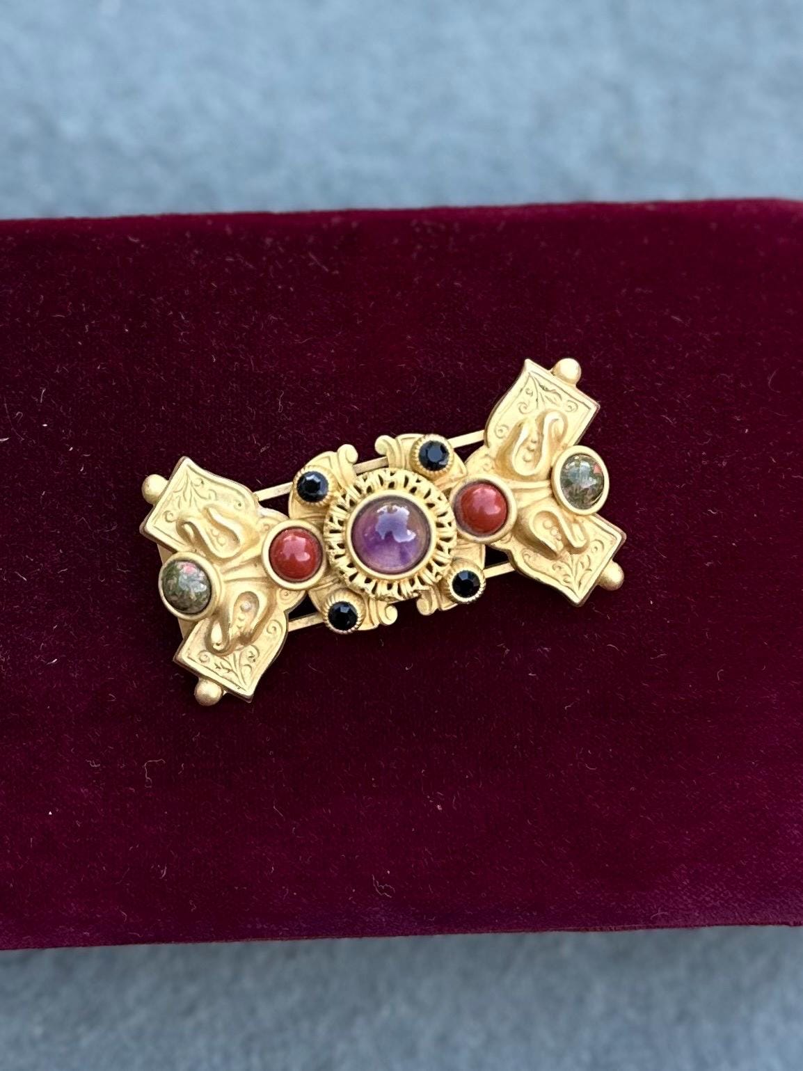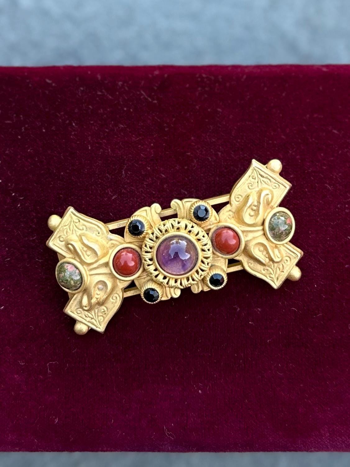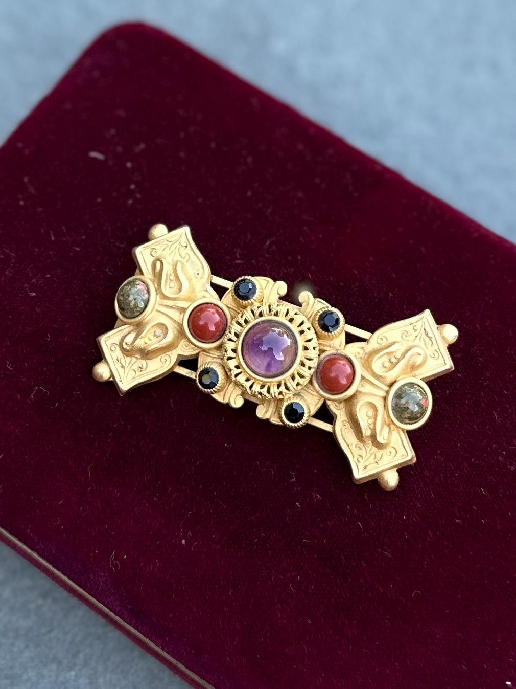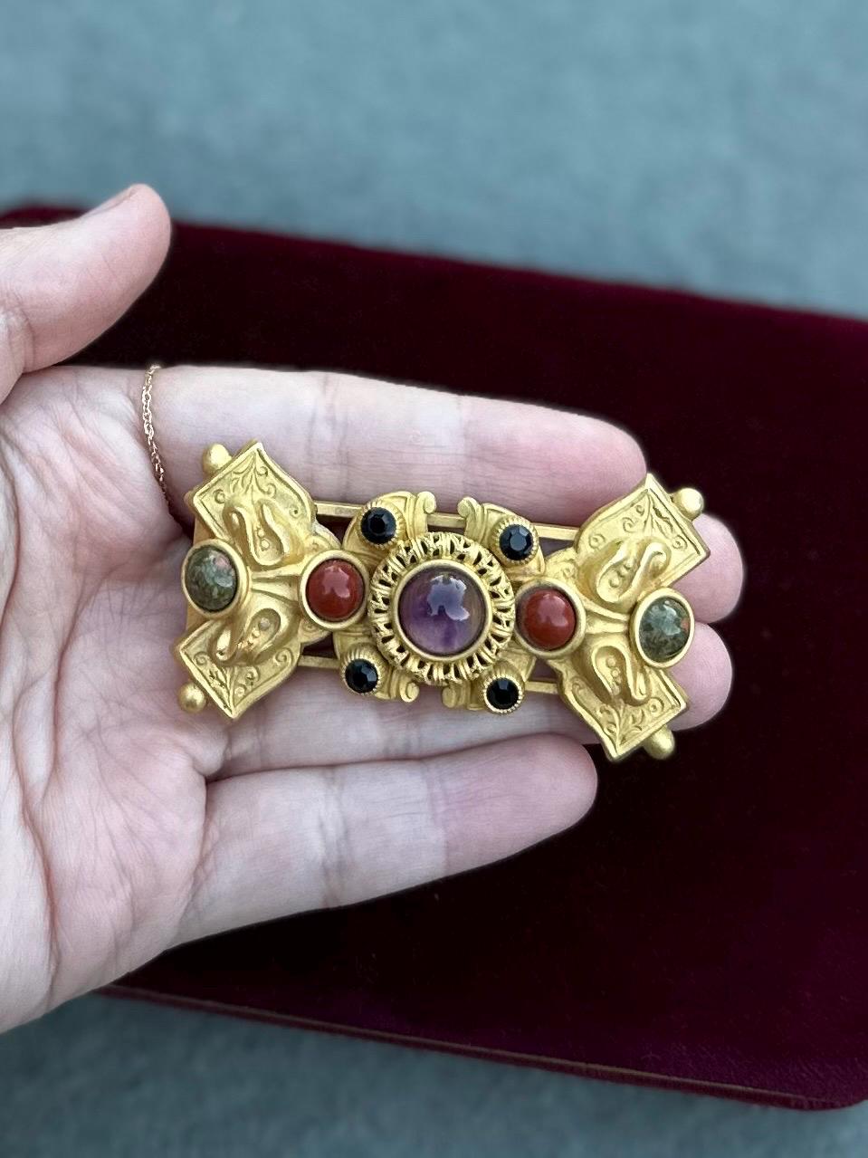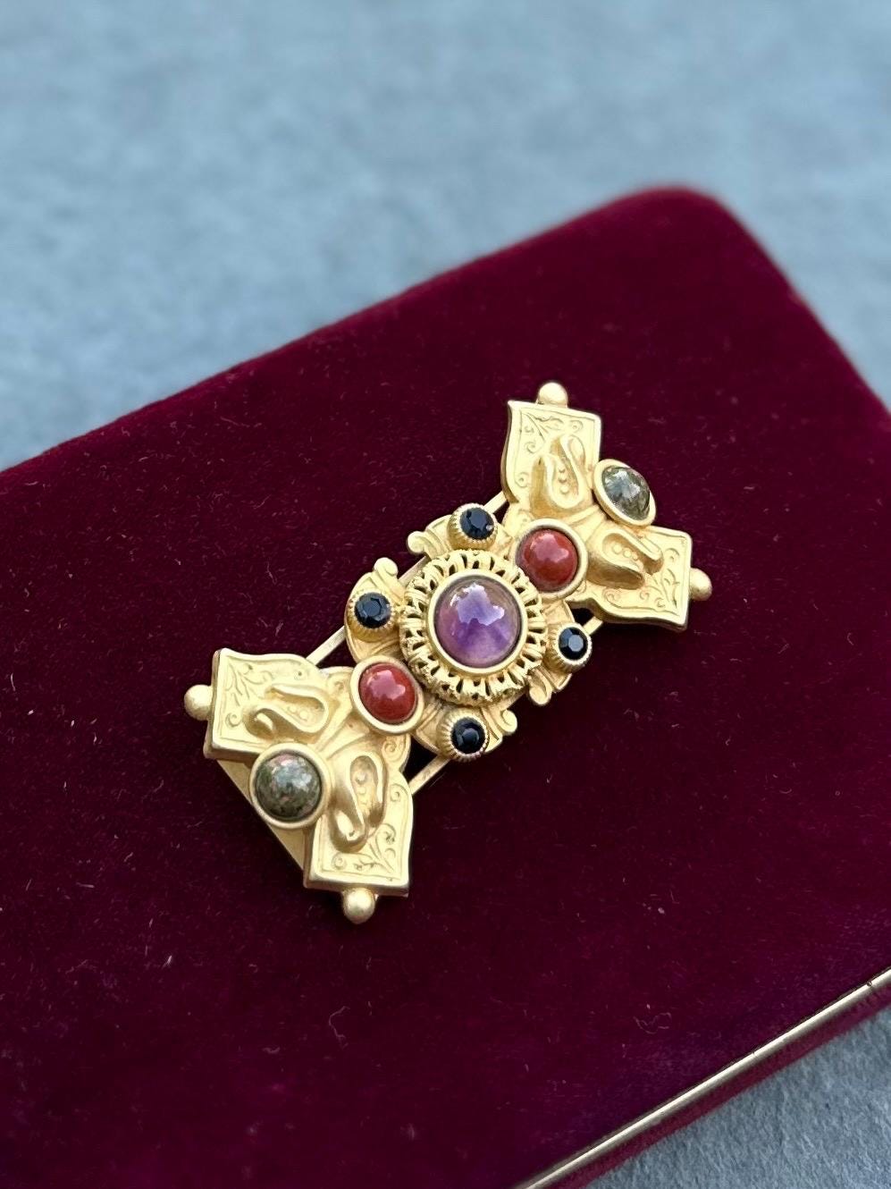 Circa 1990s. High-end stunning vintage Etruscan style brooch featuring semi-precious amethyst, carnelian, agate, and onyx stones, set in matte 18k yellow gold plating.