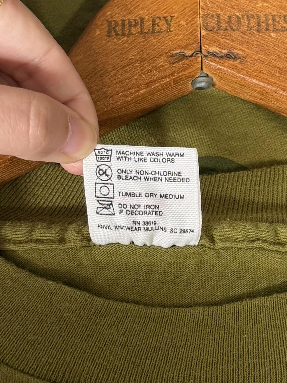 100% preshrunk cotton. Made in USA. Labeled a size Large.