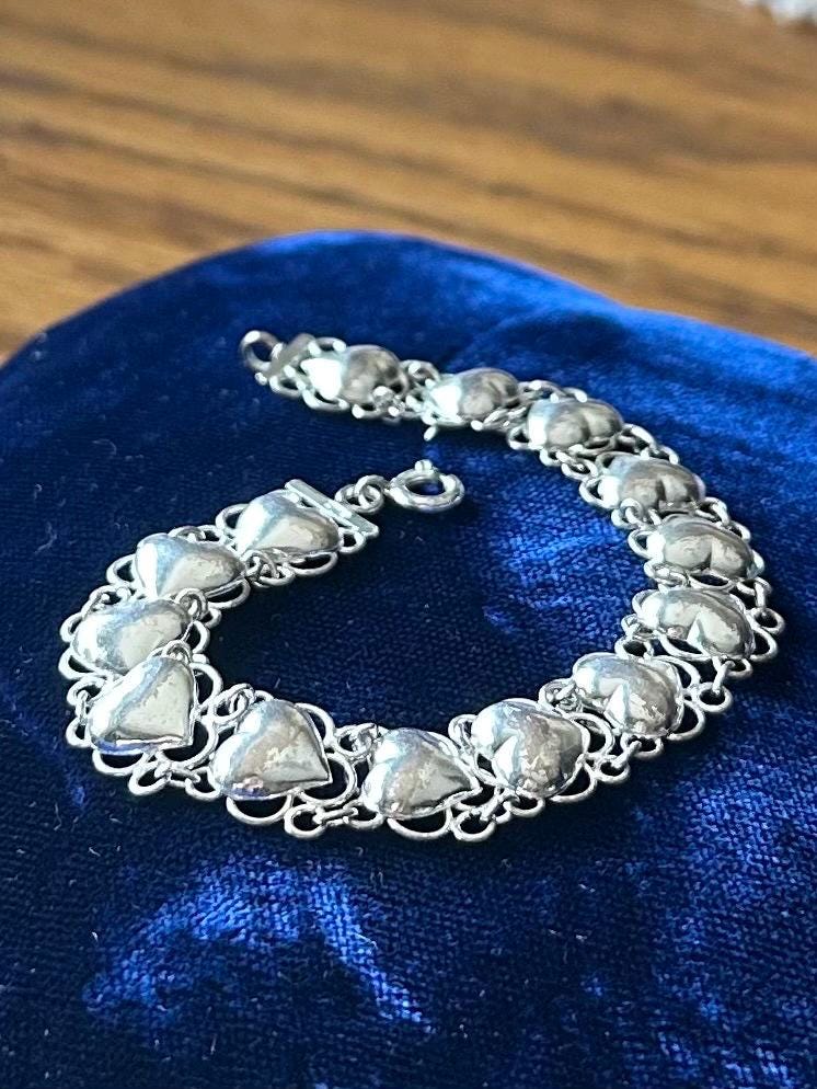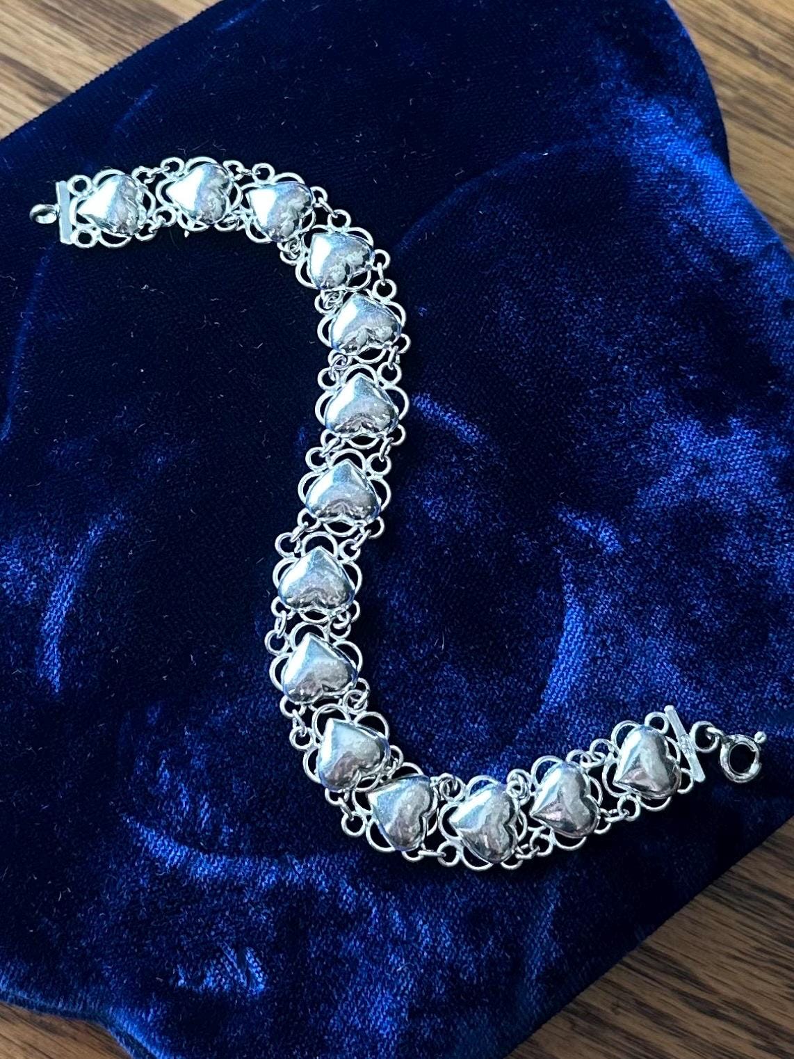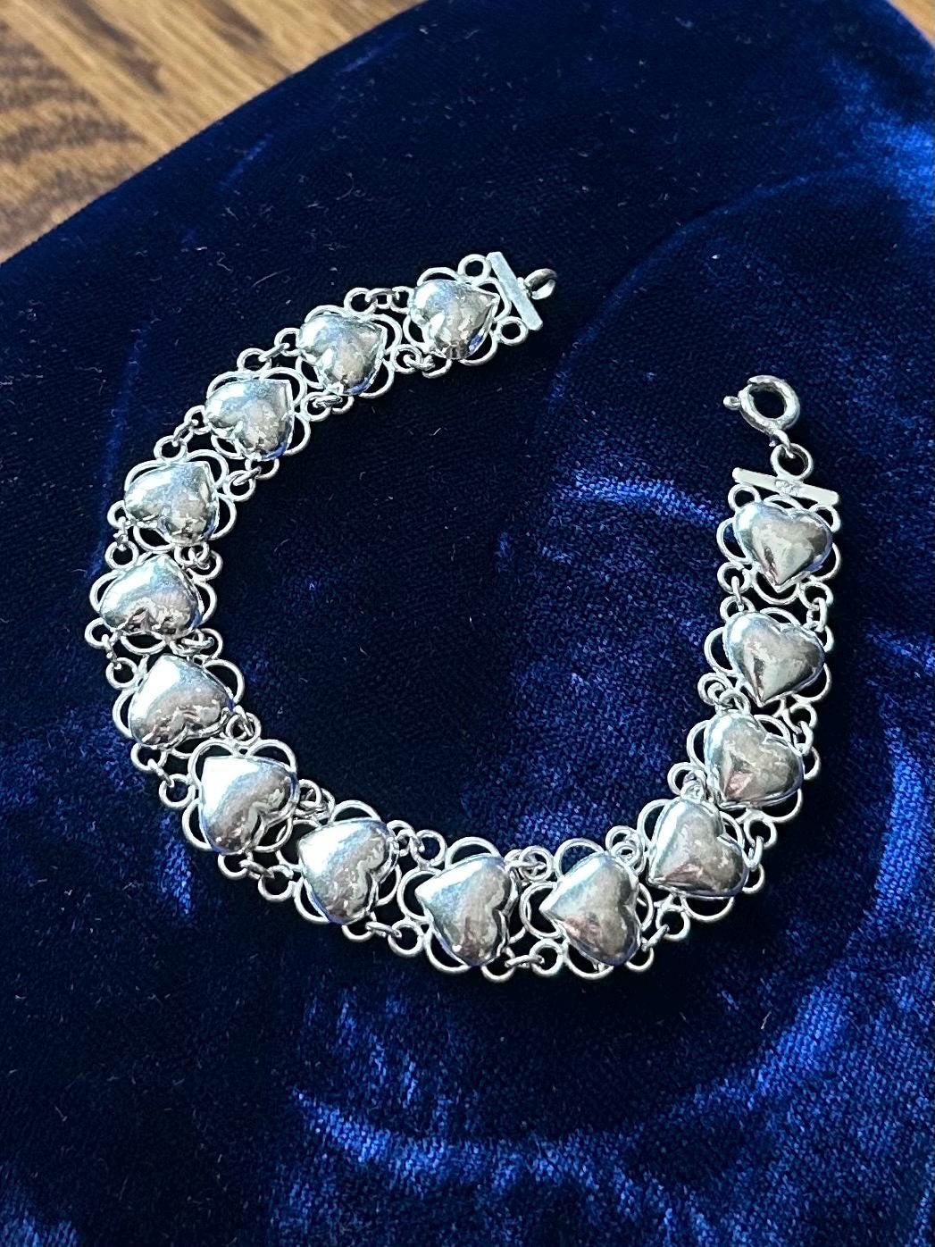 Vintage 925 Sterling Silver Puffy Hearts Open Link Bracelet 7.25"