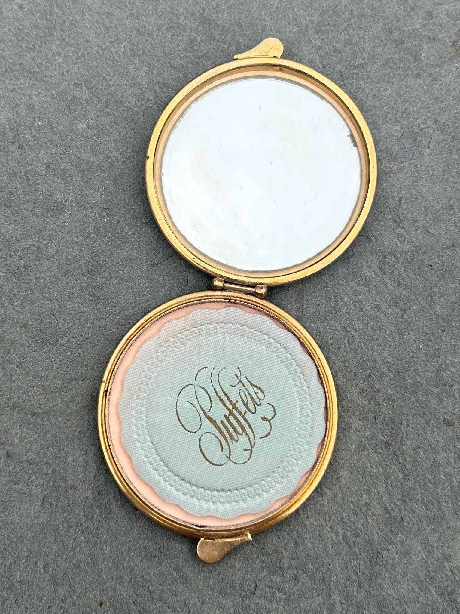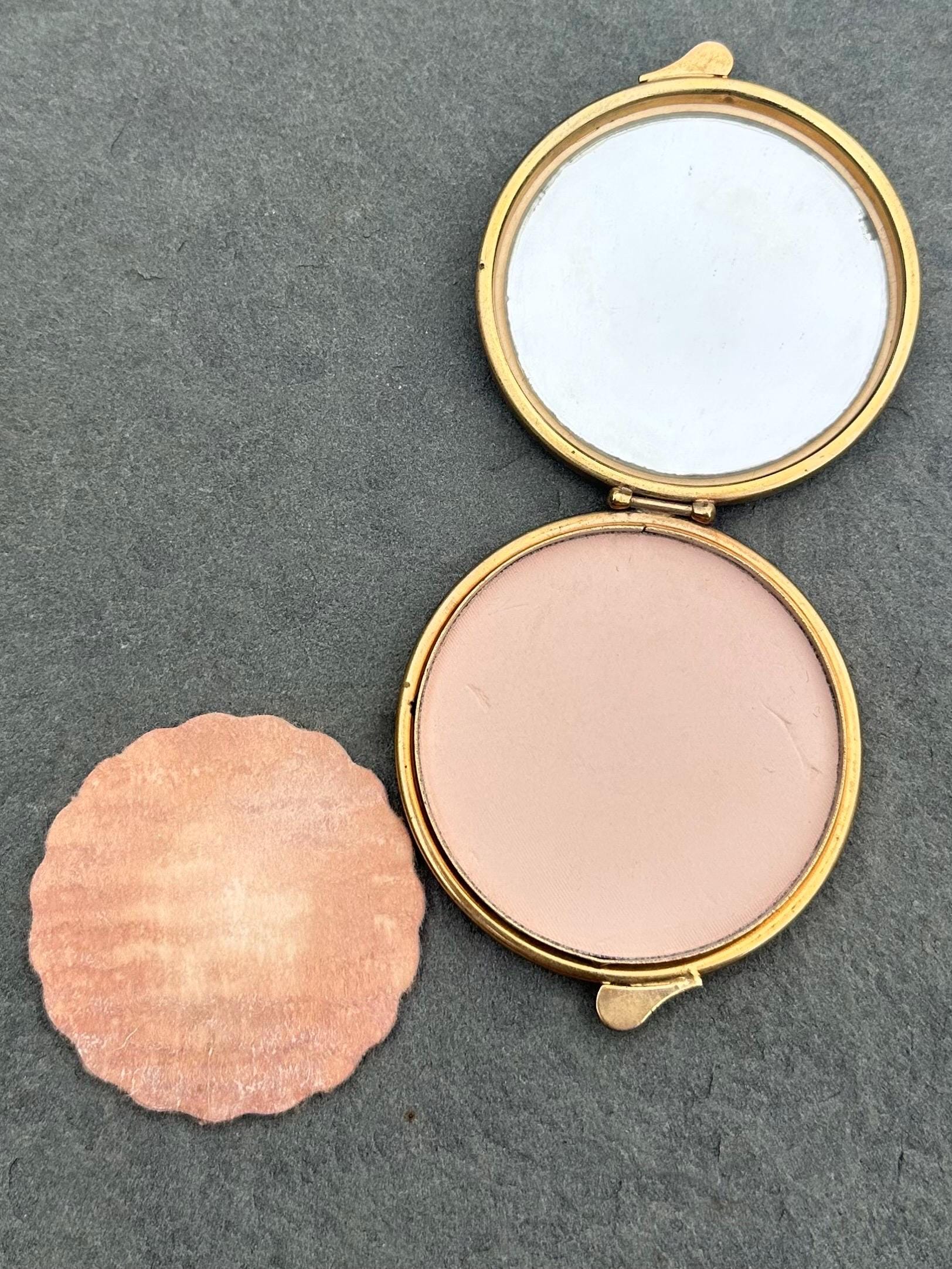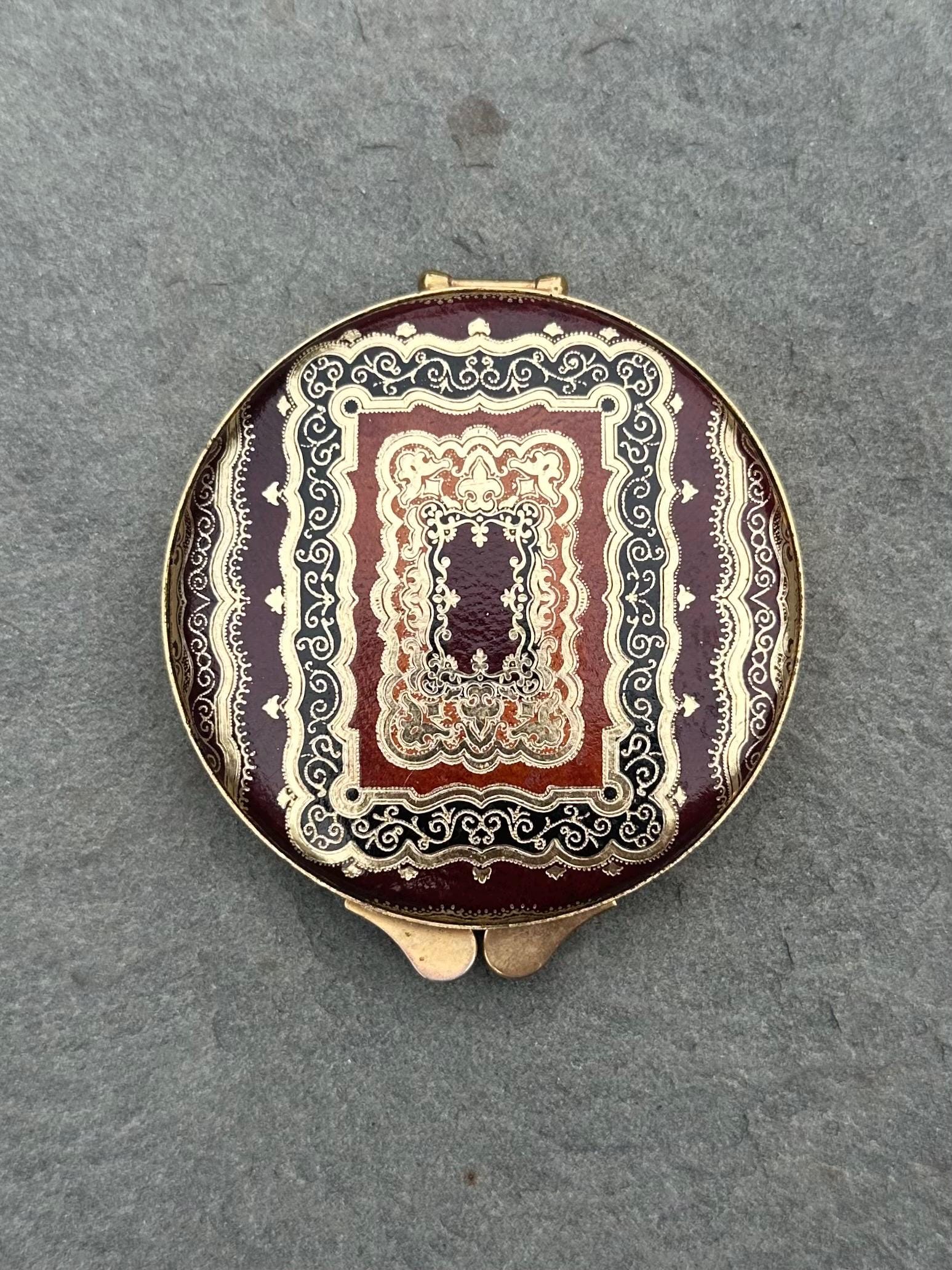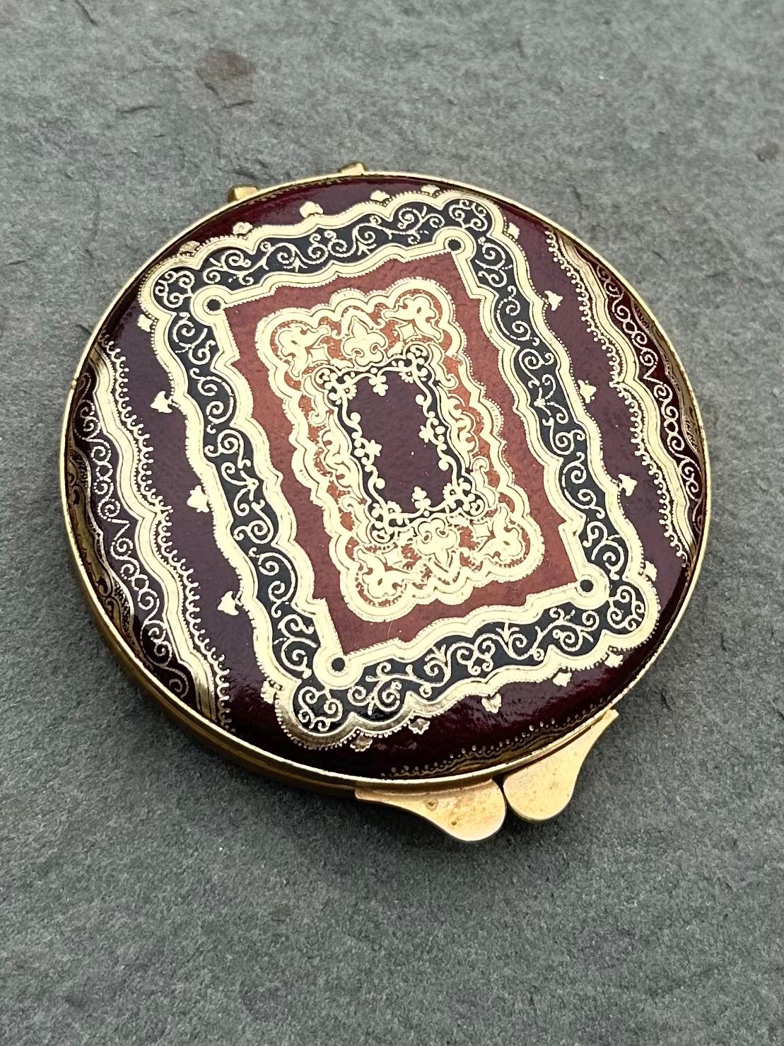 Crafted from maroon genuine leather, this vintage compact features intricate gold embossed scrollwork in warm orange and brown tones. he ornate design reflects classic Italian craftsmanship, and the interior includes a mirror, an unused powder compartment, and the original powder applicator labeled "Puffets." A beautifully preserved mid-century piece, perfect for collectors or as a timeless vanity accessory.