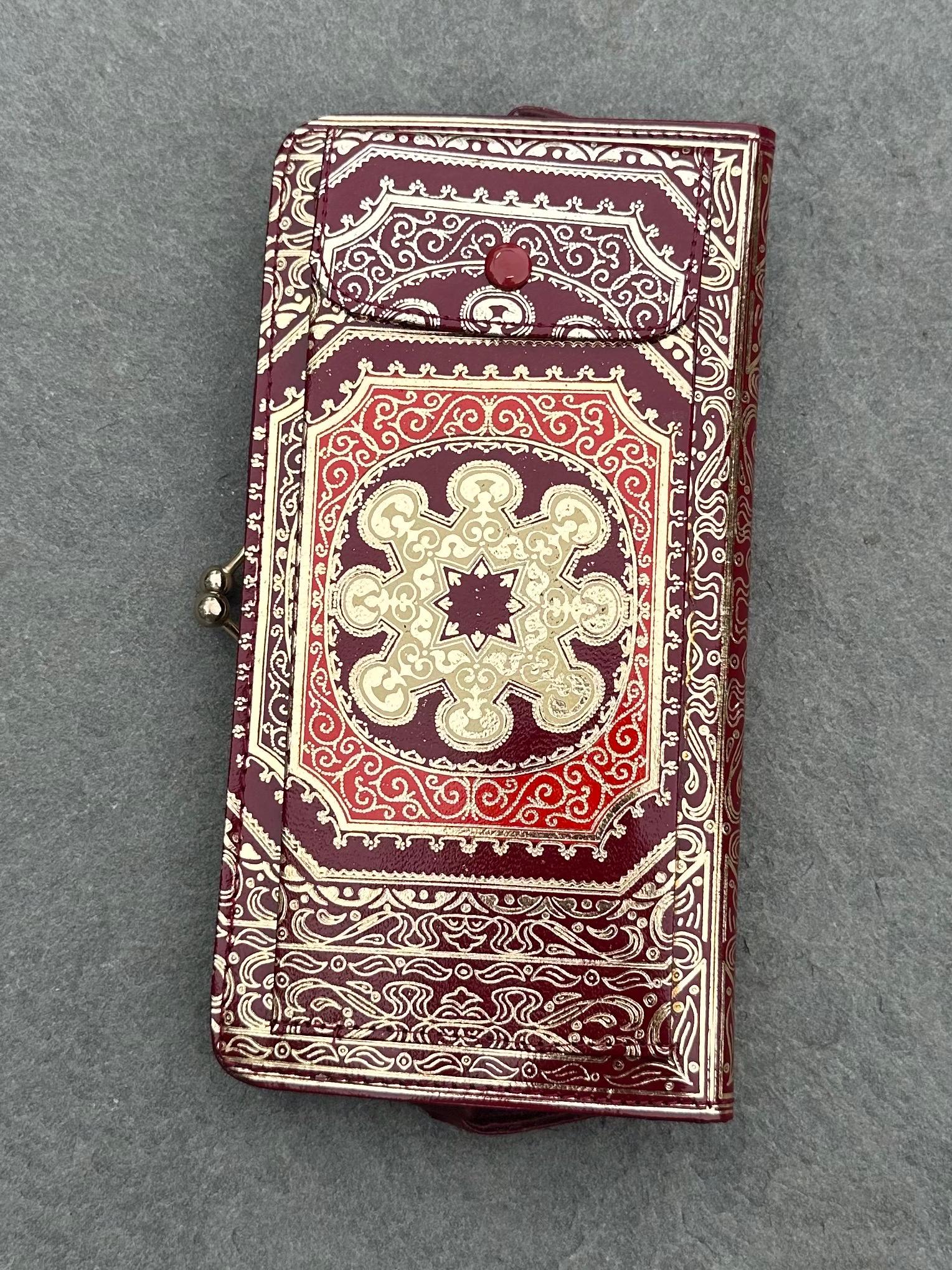 Inside is imprinted "GENUINE LEATHER MADE IN ITALY". Crafted from maroon/red genuine leather, this vintage wallet features intricate gold embossed scrollwork in warm orange and yellow tones. The wallet includes a kiss-lock compartment, a snap button section that opens to reveal two interior slots—ideal for bills or receipts—and an additional exterior snap button pocket perfect for coins or small essentials.
