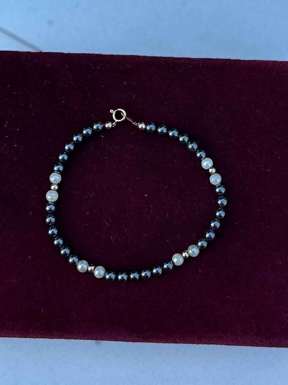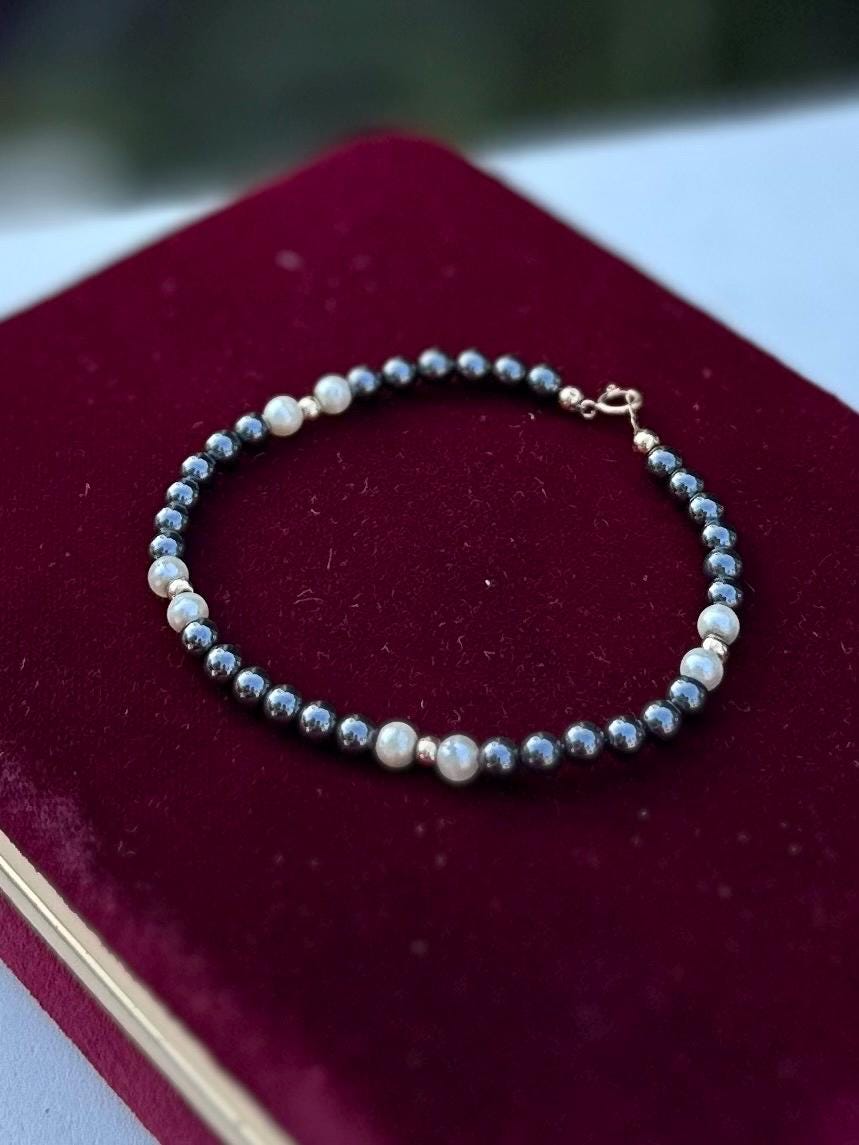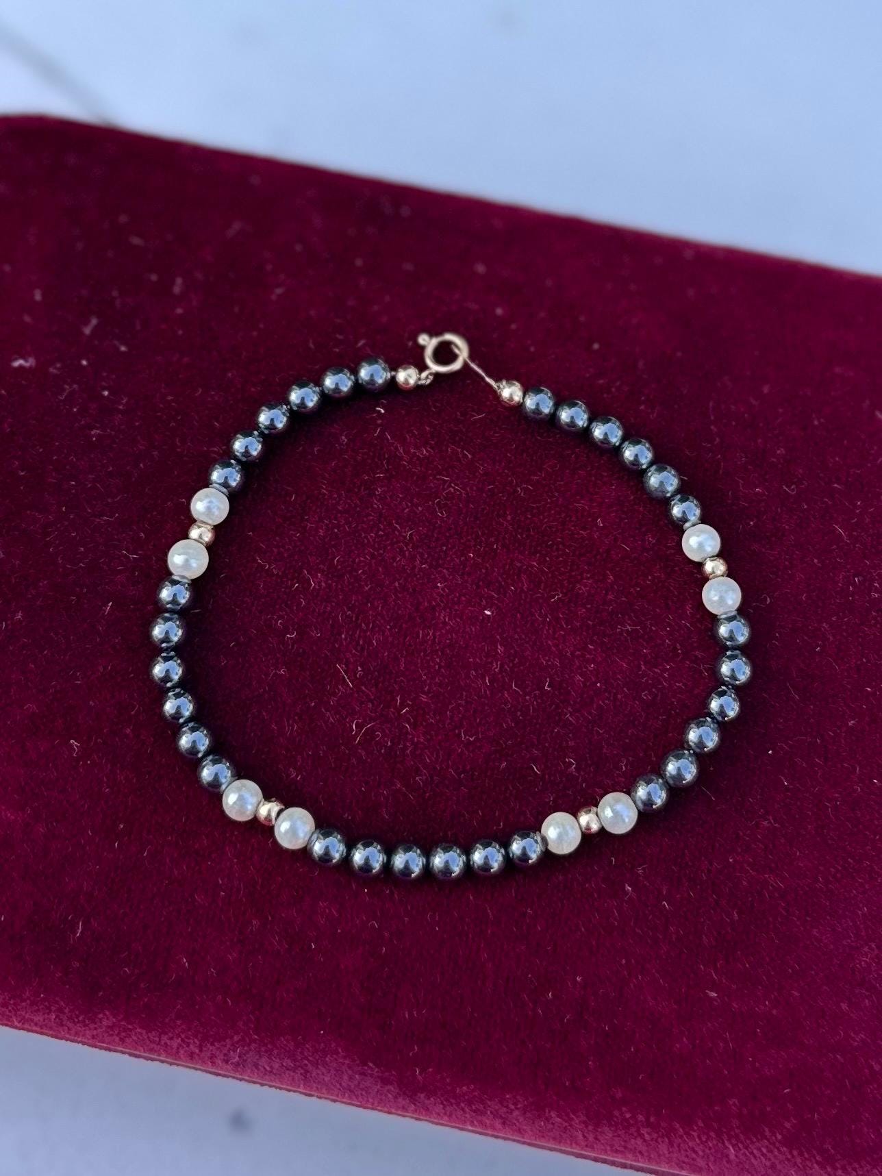 Beautiful and dainty vintage hematite, pearl, and 14k yellow gold beaded bracelet. Clasp and separators are both 14k yellow gold.