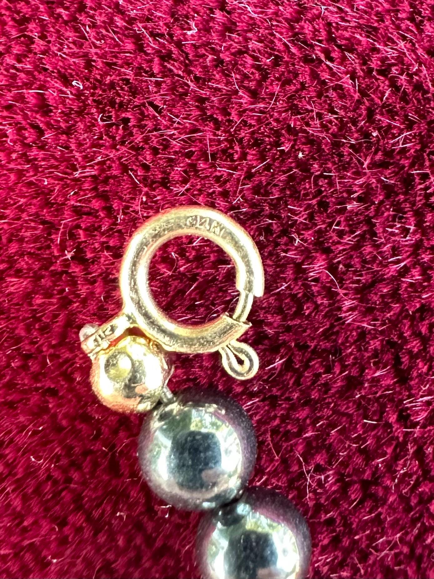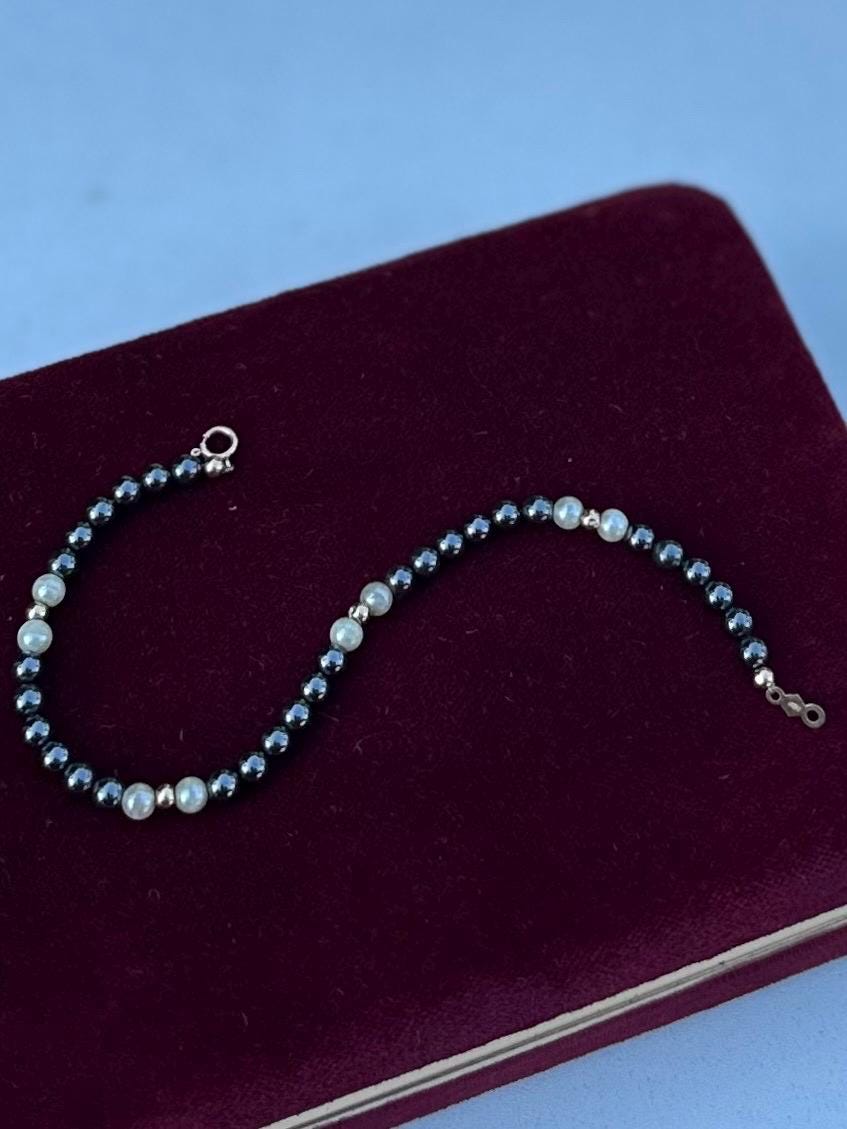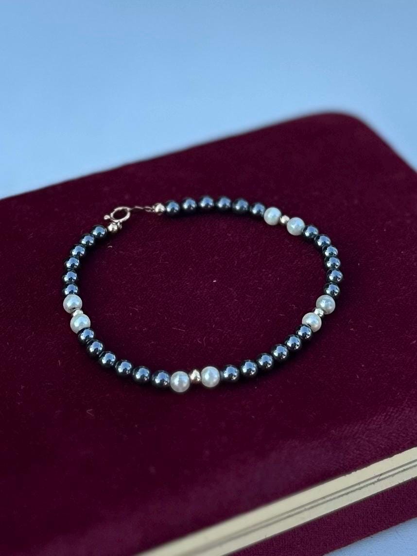Beautiful and dainty vintage hematite, pearl, and 14k yellow gold beaded bracelet. Clasp and separators are both 14k yellow gold.
