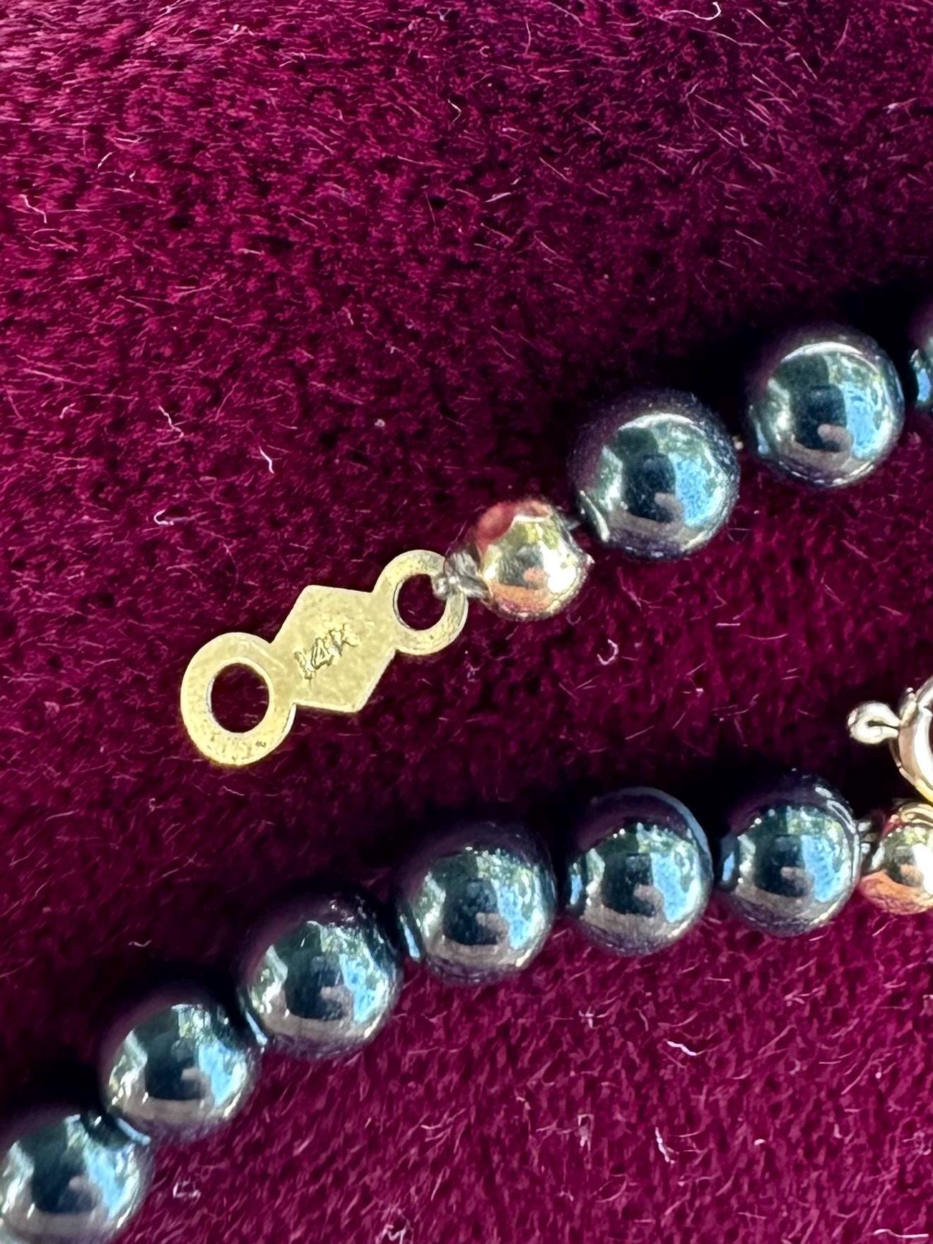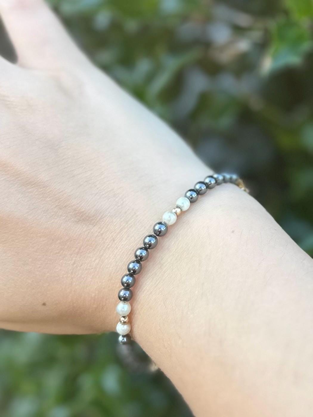 Vintage Dainty 14k Yellow Gold Genuine Hematite & Pearl 4mm Beaded Bracelet