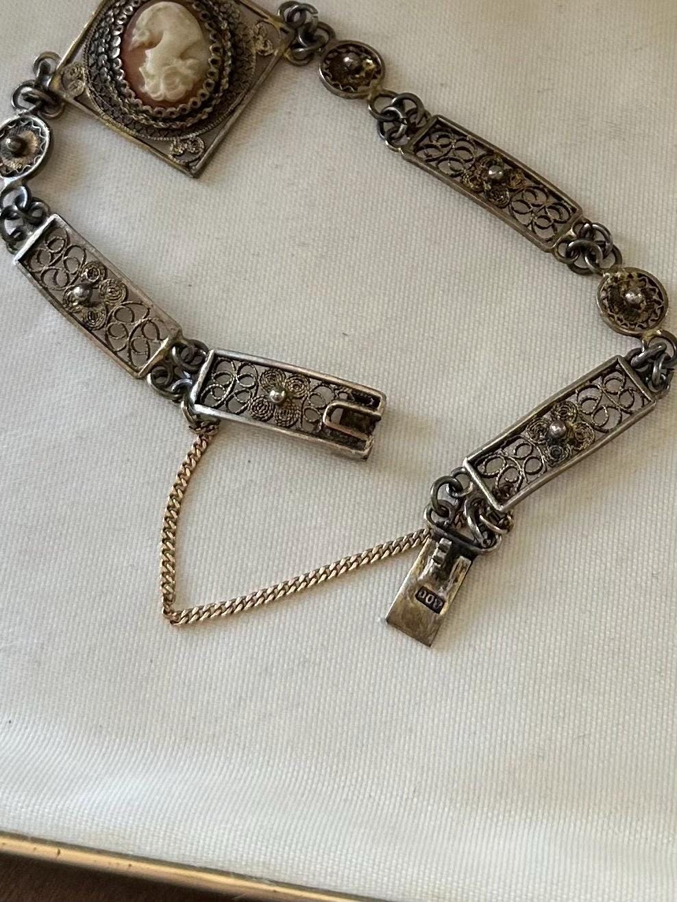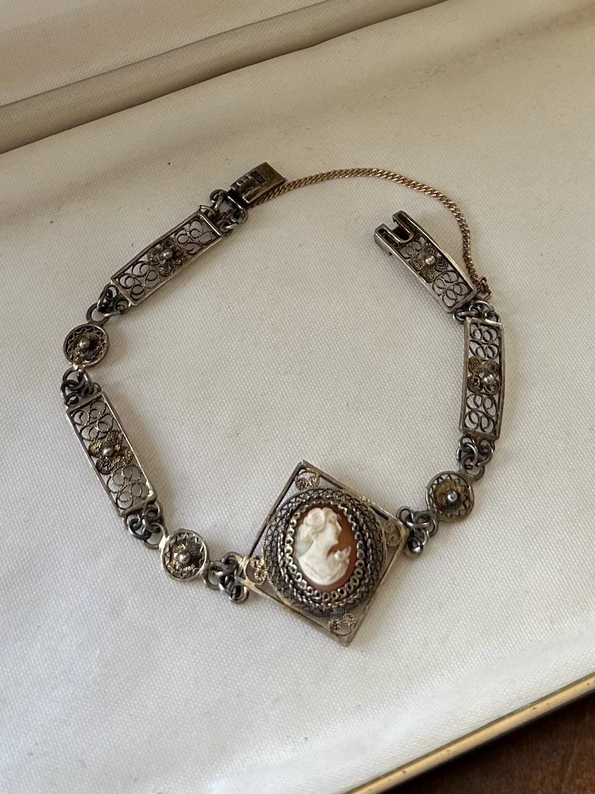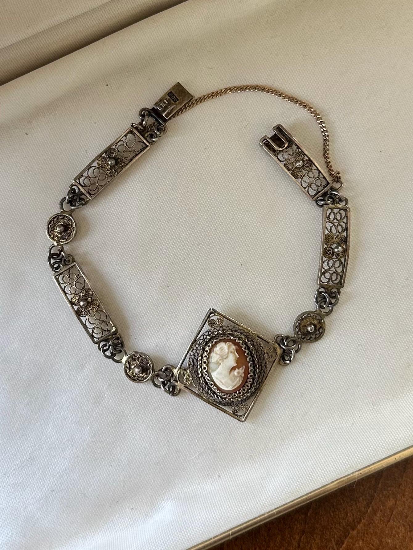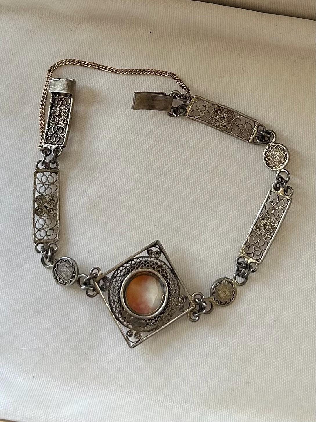 Beautiful filigree silver bracelet with a hand carved pink shell cameo with rope twist edging, set in a diamond shaped panel. Cameo has an open back setting. Alternating circular panels with a silver bauble and long panels with a flower and silver bauble.