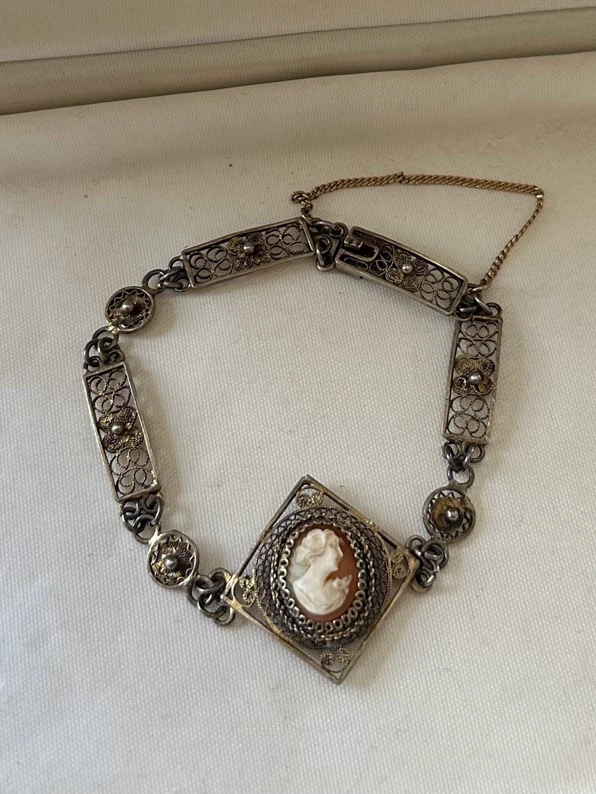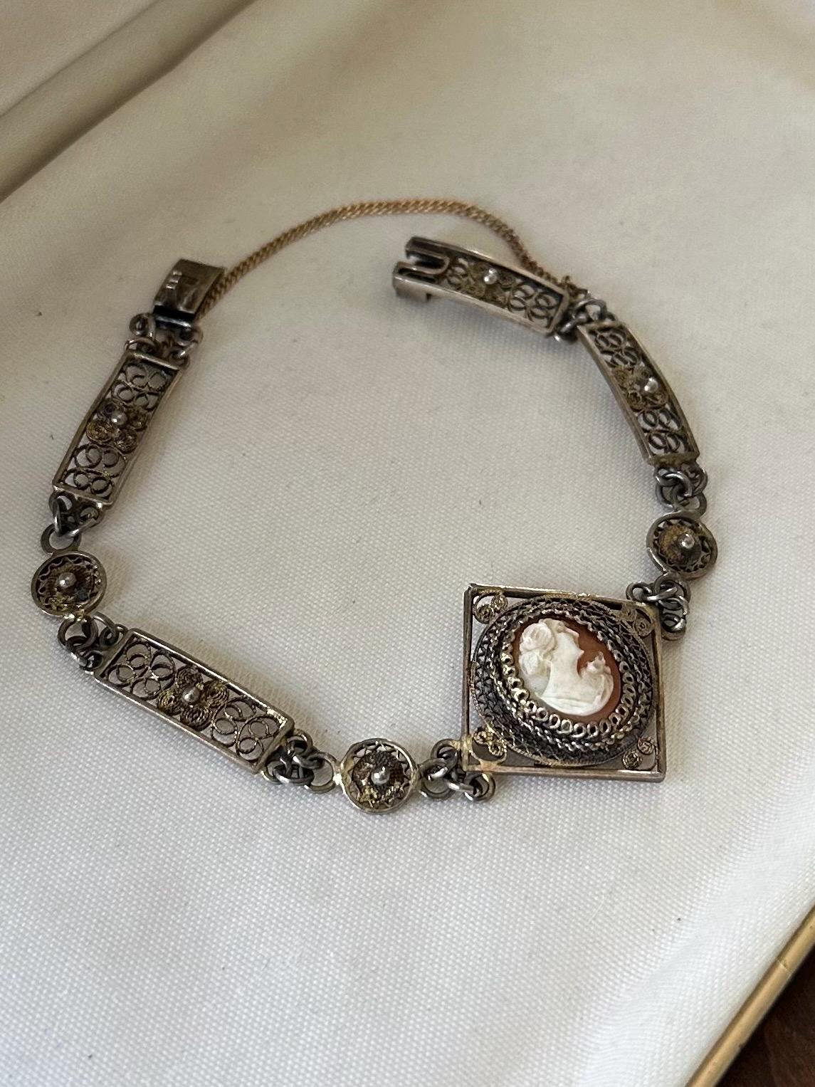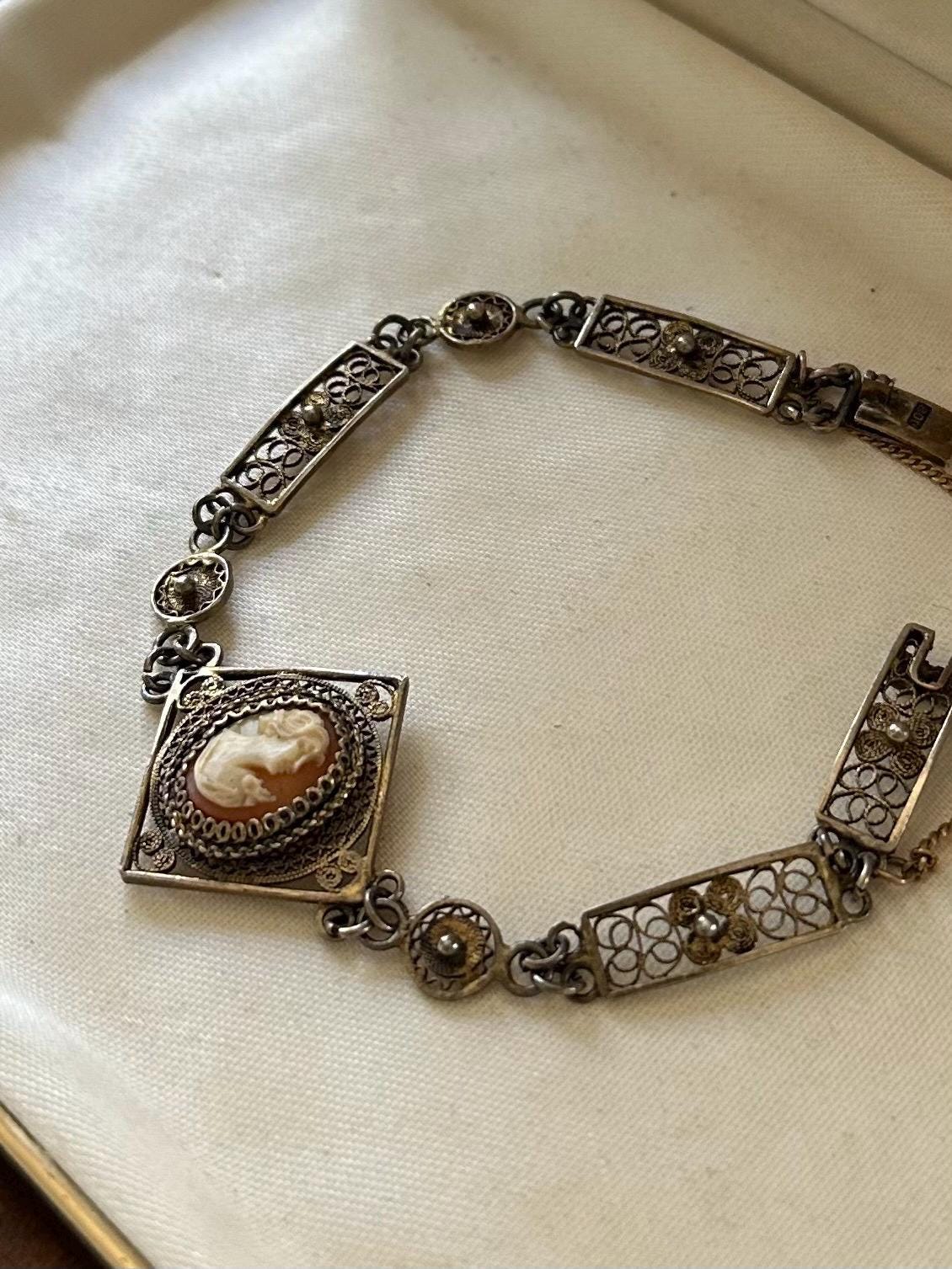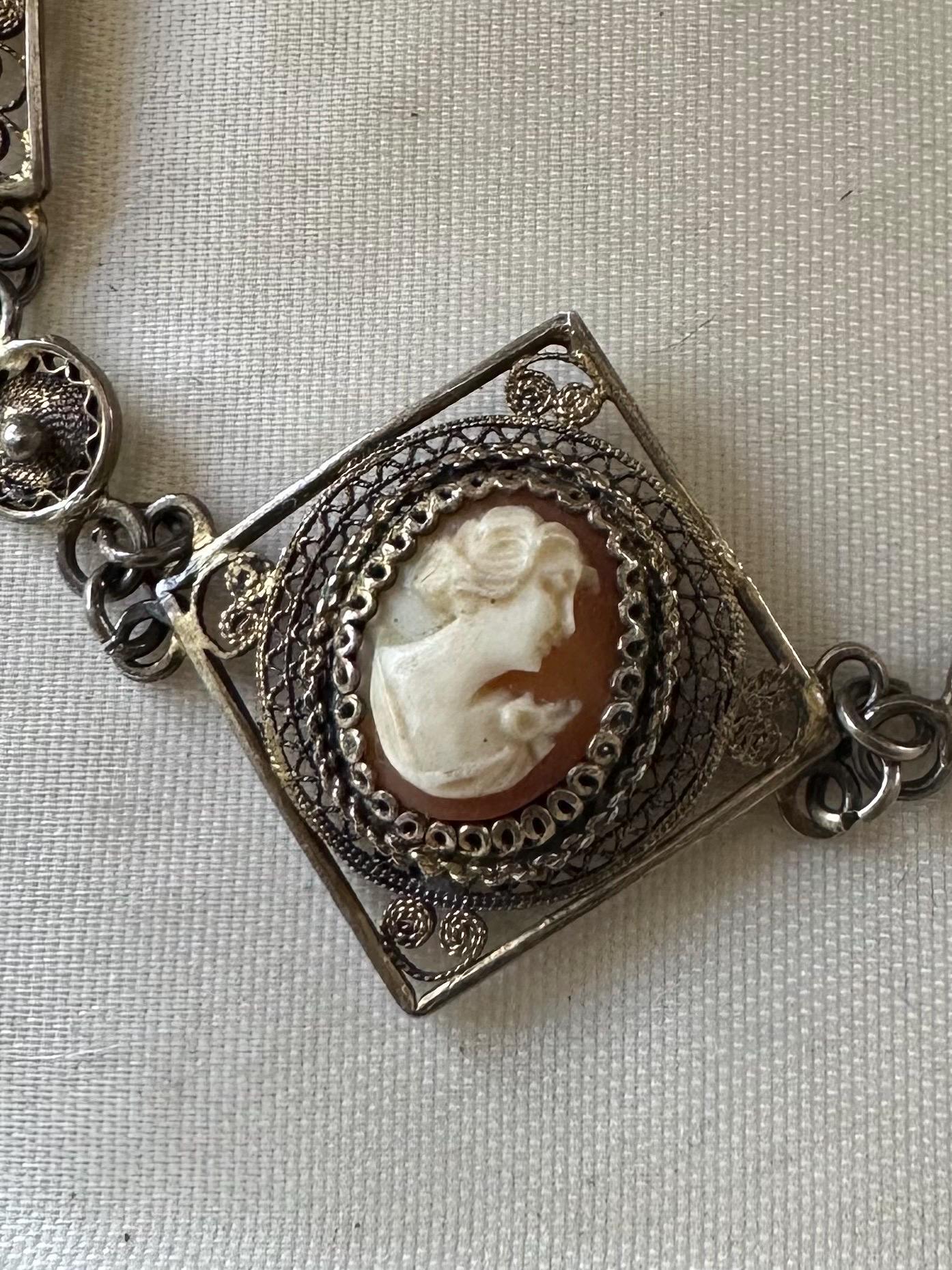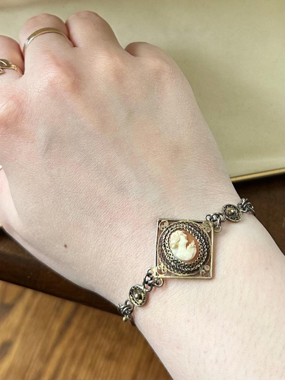 Vintage European 800 Silver Gold Gilt Delicate Filigree Hand Carved Shell Cameo Panel Link Bracelet