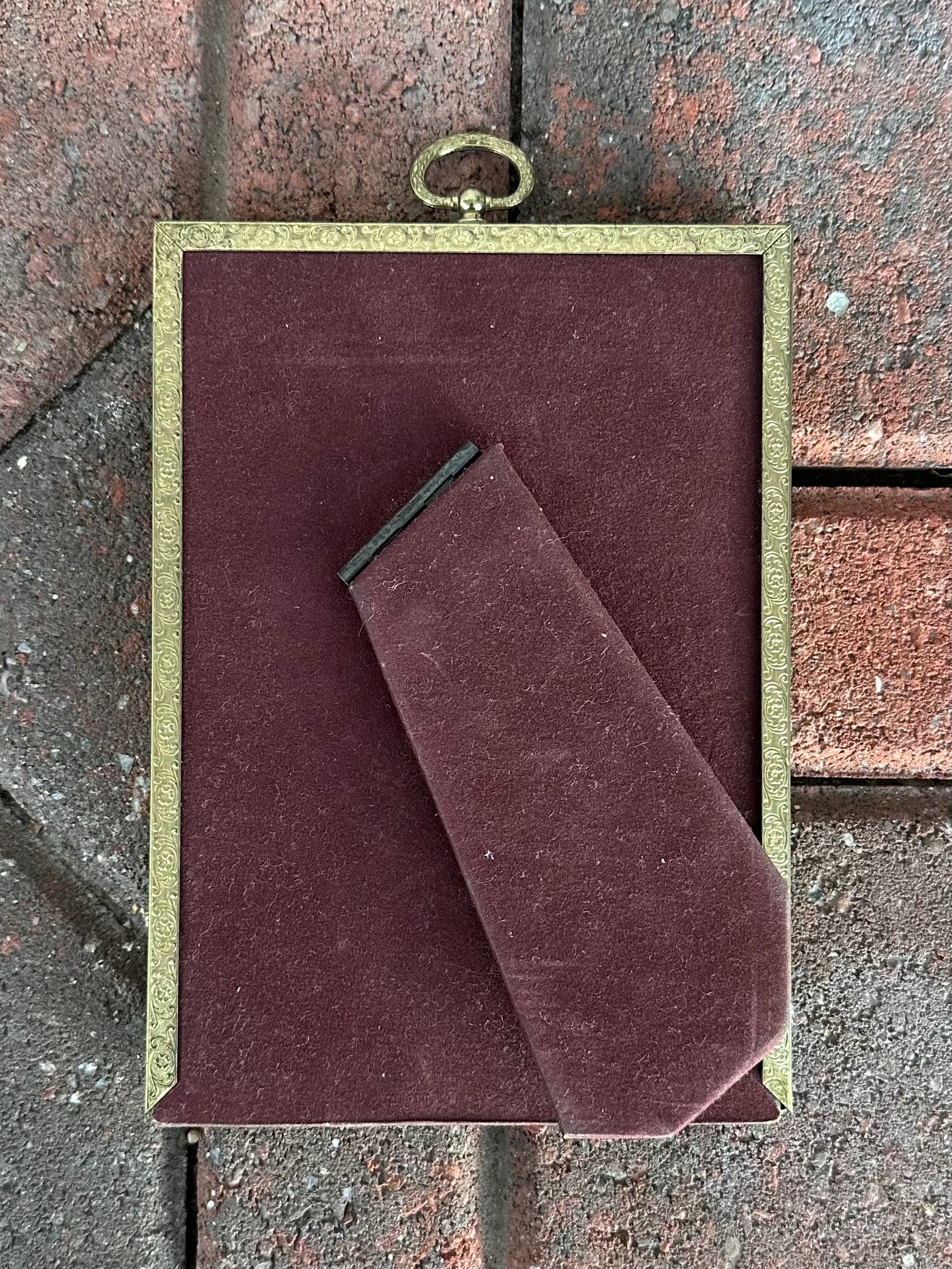 Back of frame is affixed with an easel back as well as a loop at the top for wall hanging.