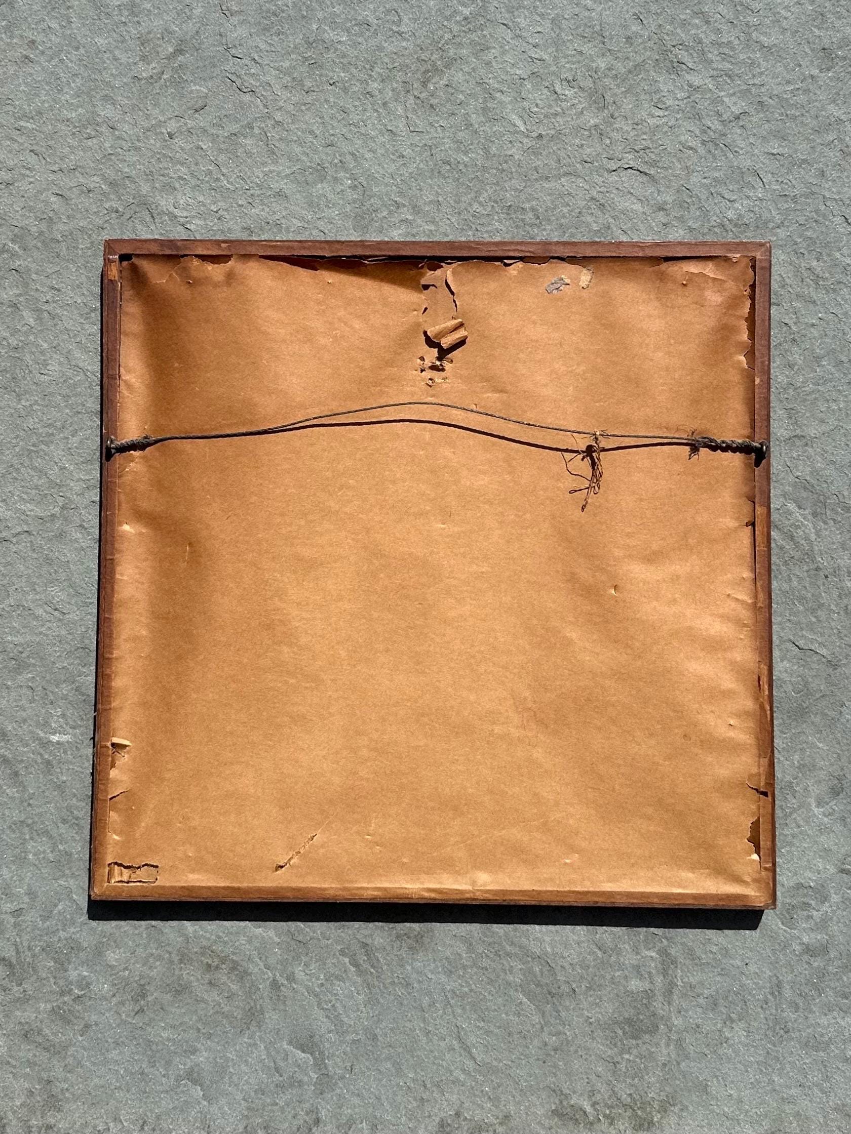 Frame measures approximately 12.45 inches tall by 12.6 inches wide, and has a depth of approximately 0.6 inch. Glass cover. Back of frame is affixed with wire for wall hanging.