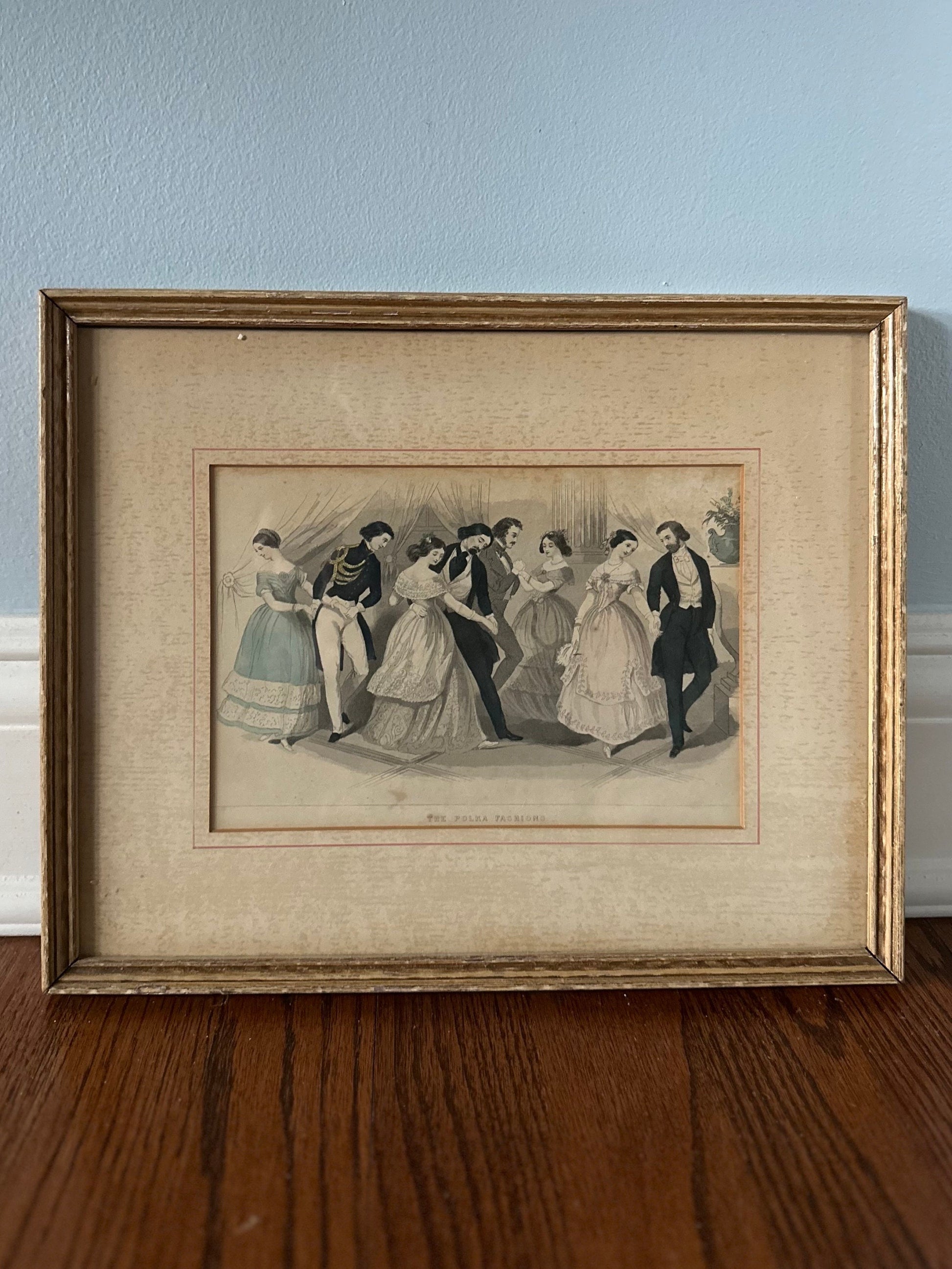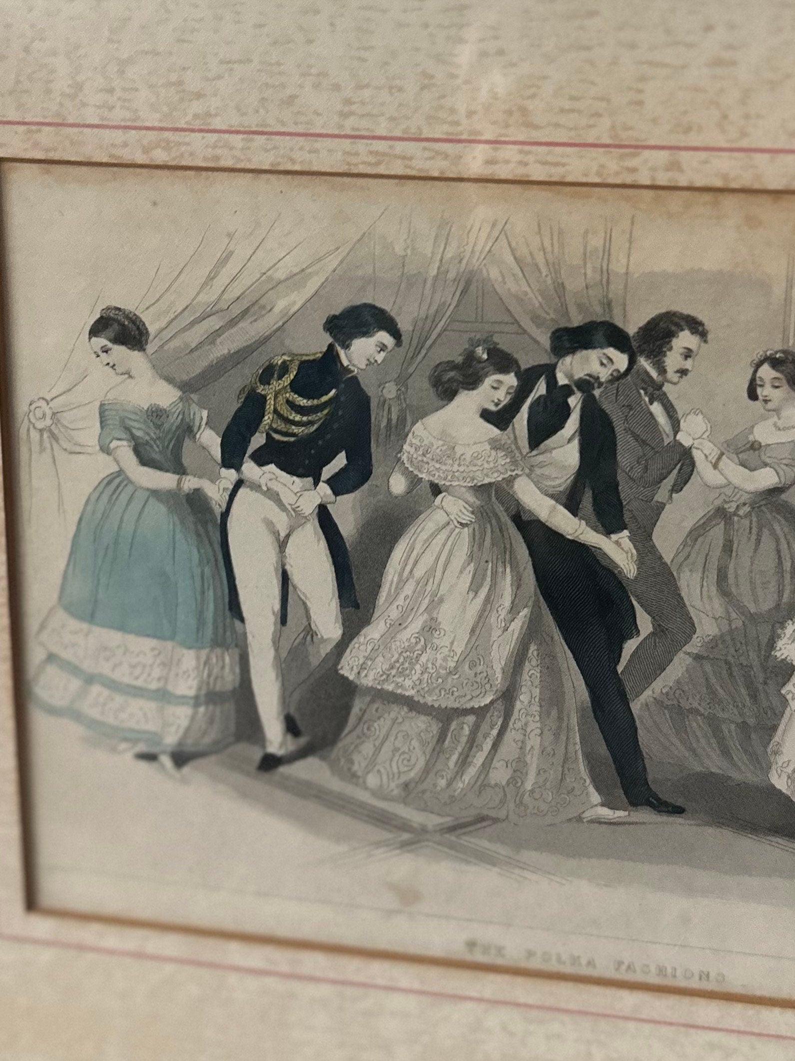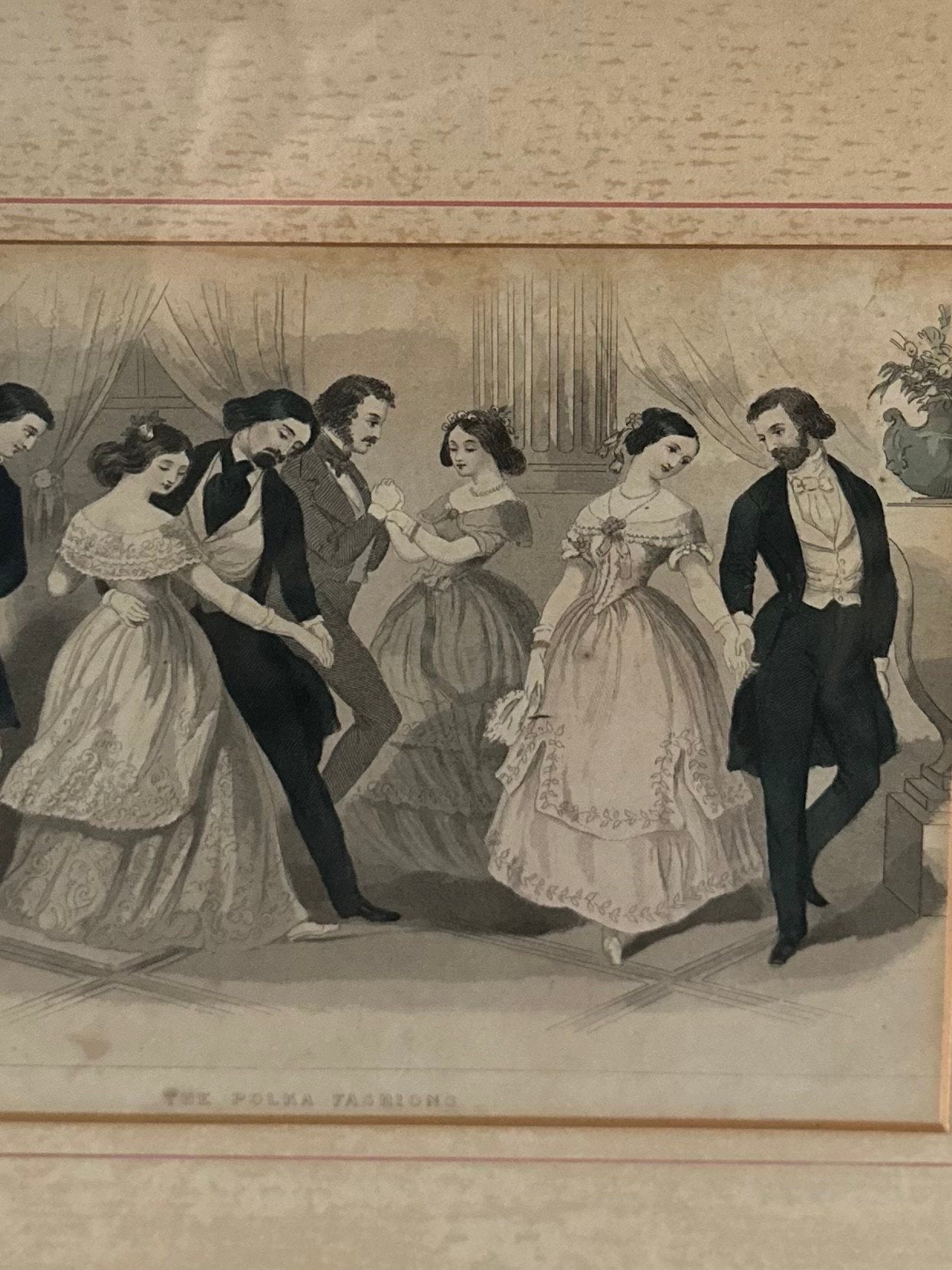 Framed & matted lithograph, depicting a group of dancers in Victorian garb, titled “The Polka Fashions,” from Godey's Lady's Book, vol. XXXI, 1845 (engraving).