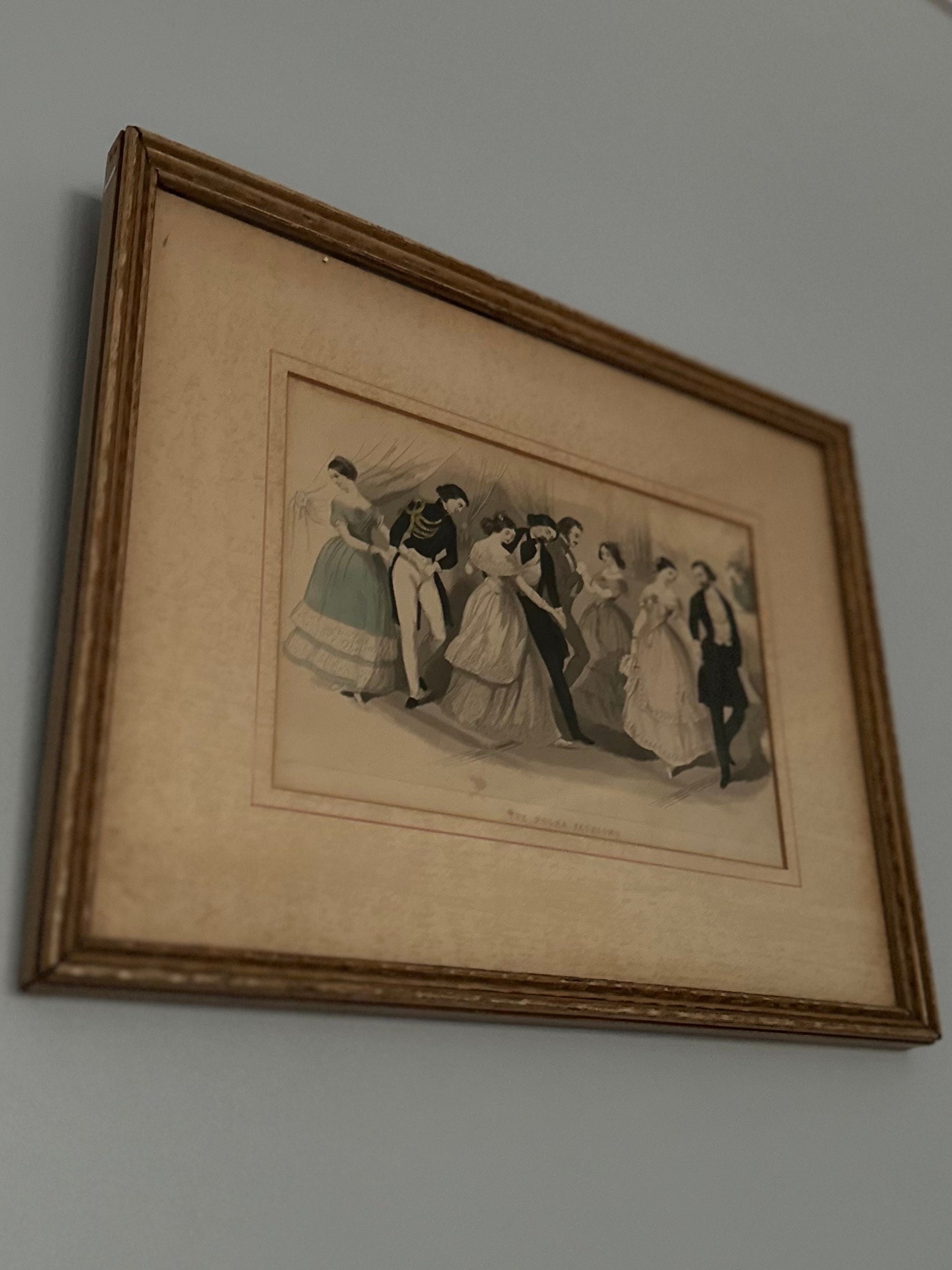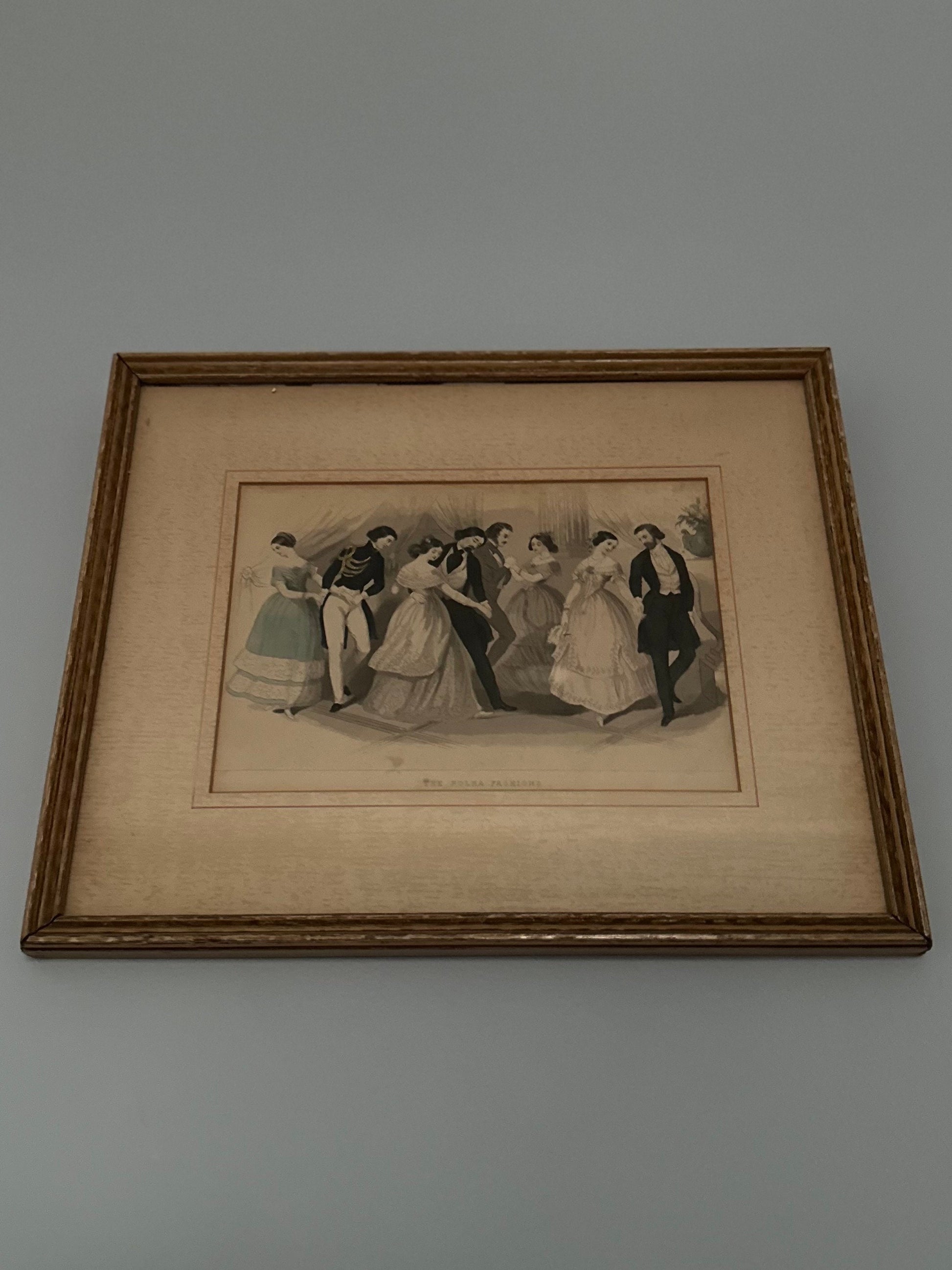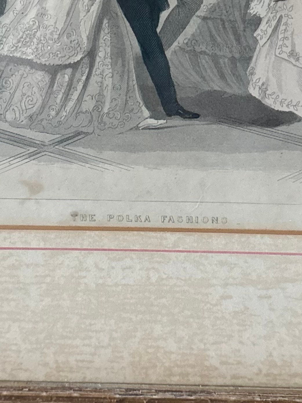 Framed & matted lithograph, depicting a group of dancers in Victorian garb, titled “The Polka Fashions,” from Godey's Lady's Book, vol. XXXI, 1845 (engraving).