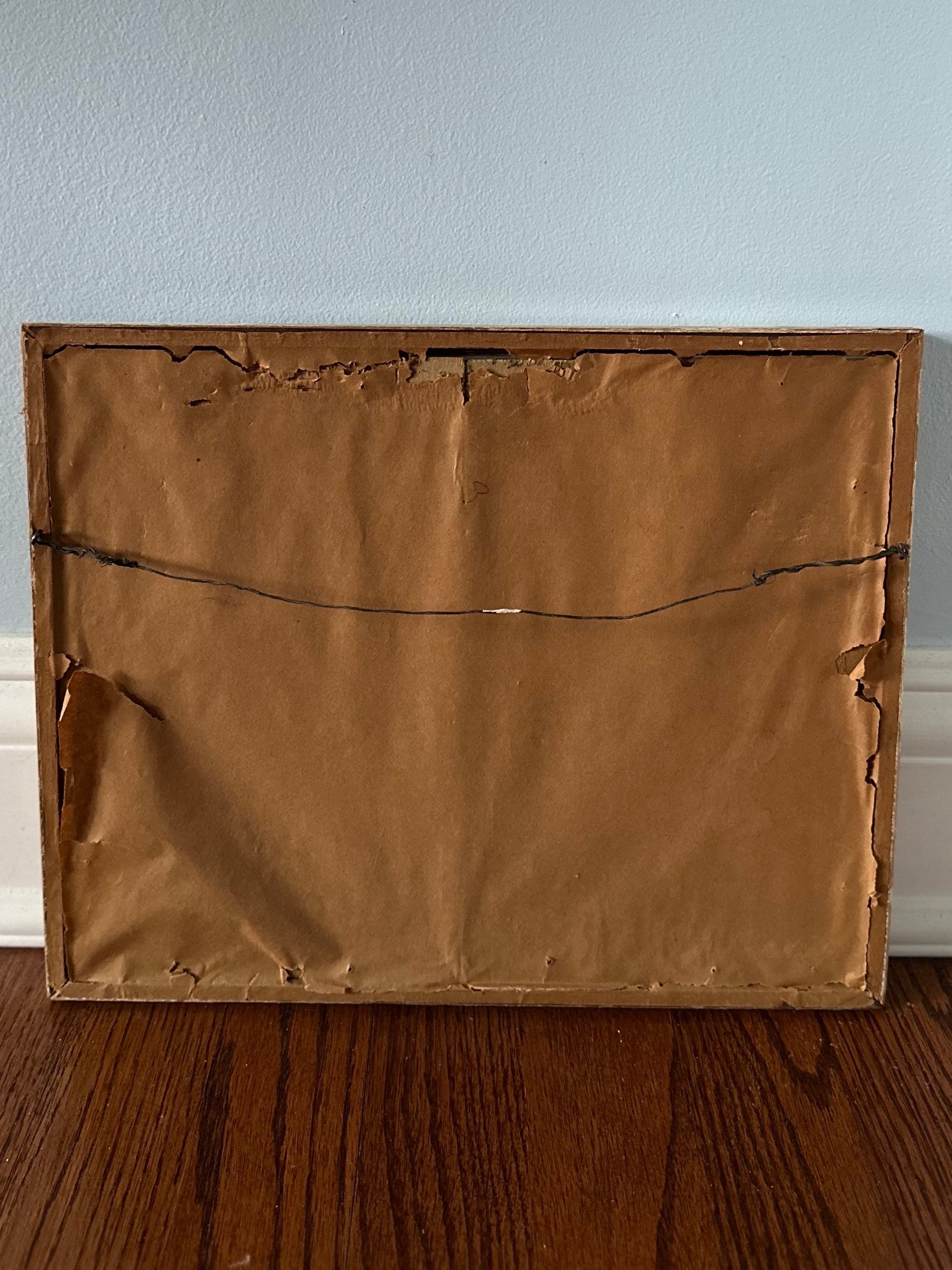 Frame measures approximately 12.75 inches long by 10.25 inches wide. Back of frame is affixed with wire for wall hanging.