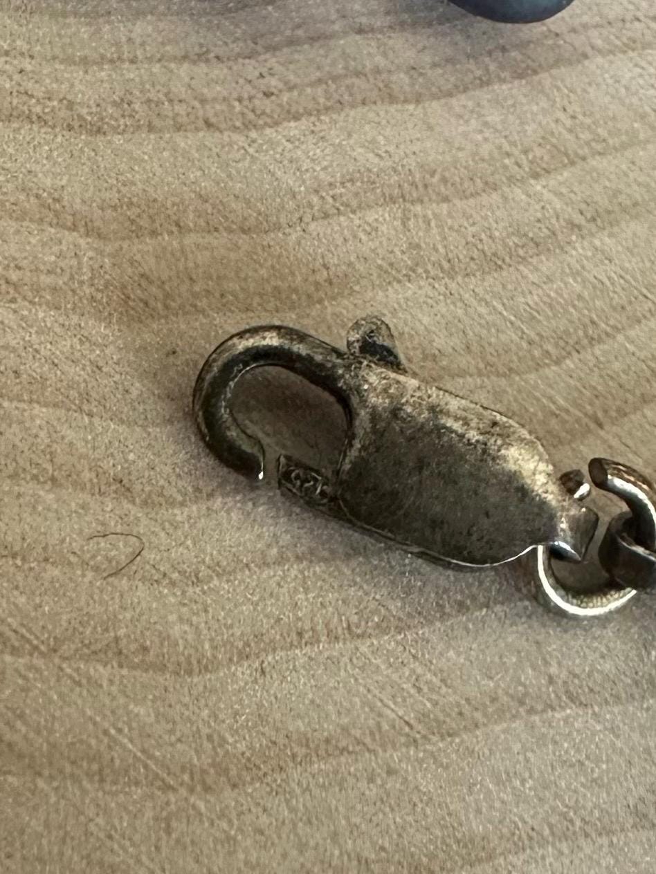Necklace measures approximately 16.75 inches long and has a lobster claw clasp. Clasp is stamped “925” for sterling silver.