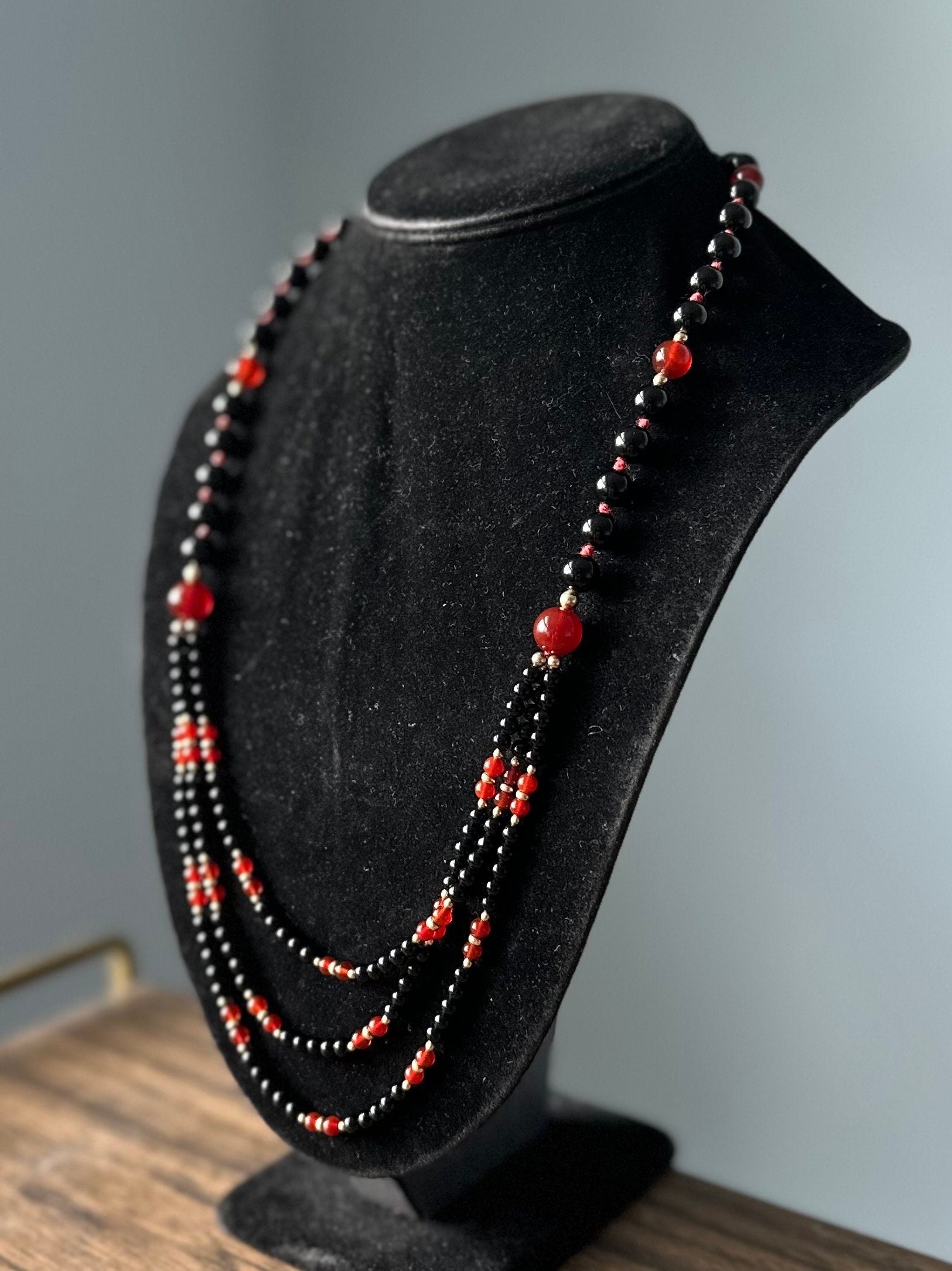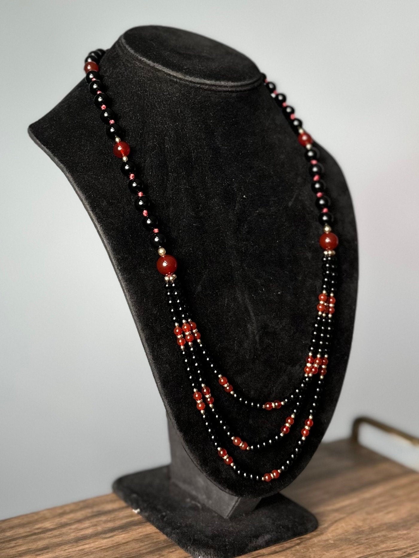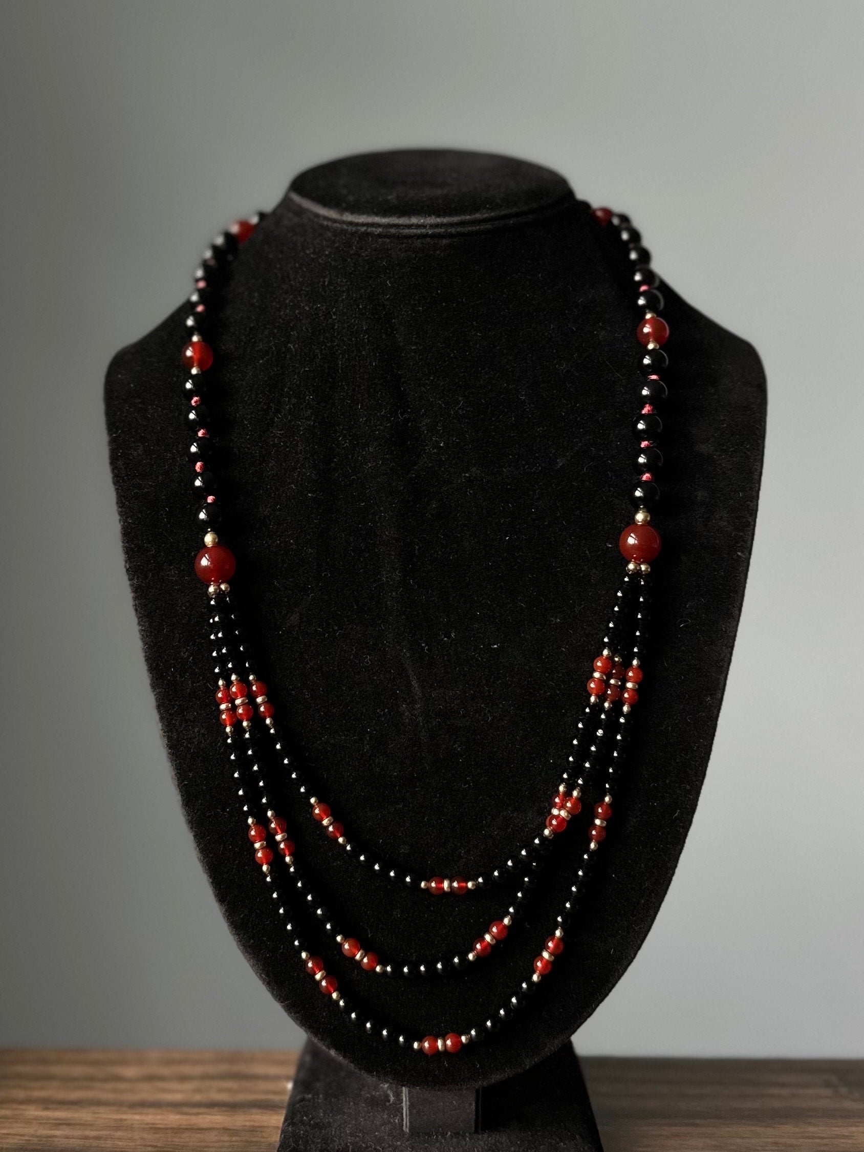 Hand knotted genuine black onyx and carnelian beads with gold filled separator beads.