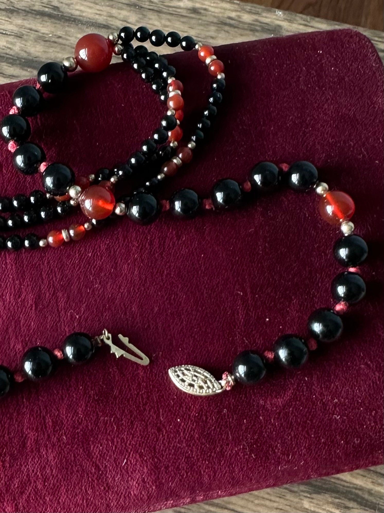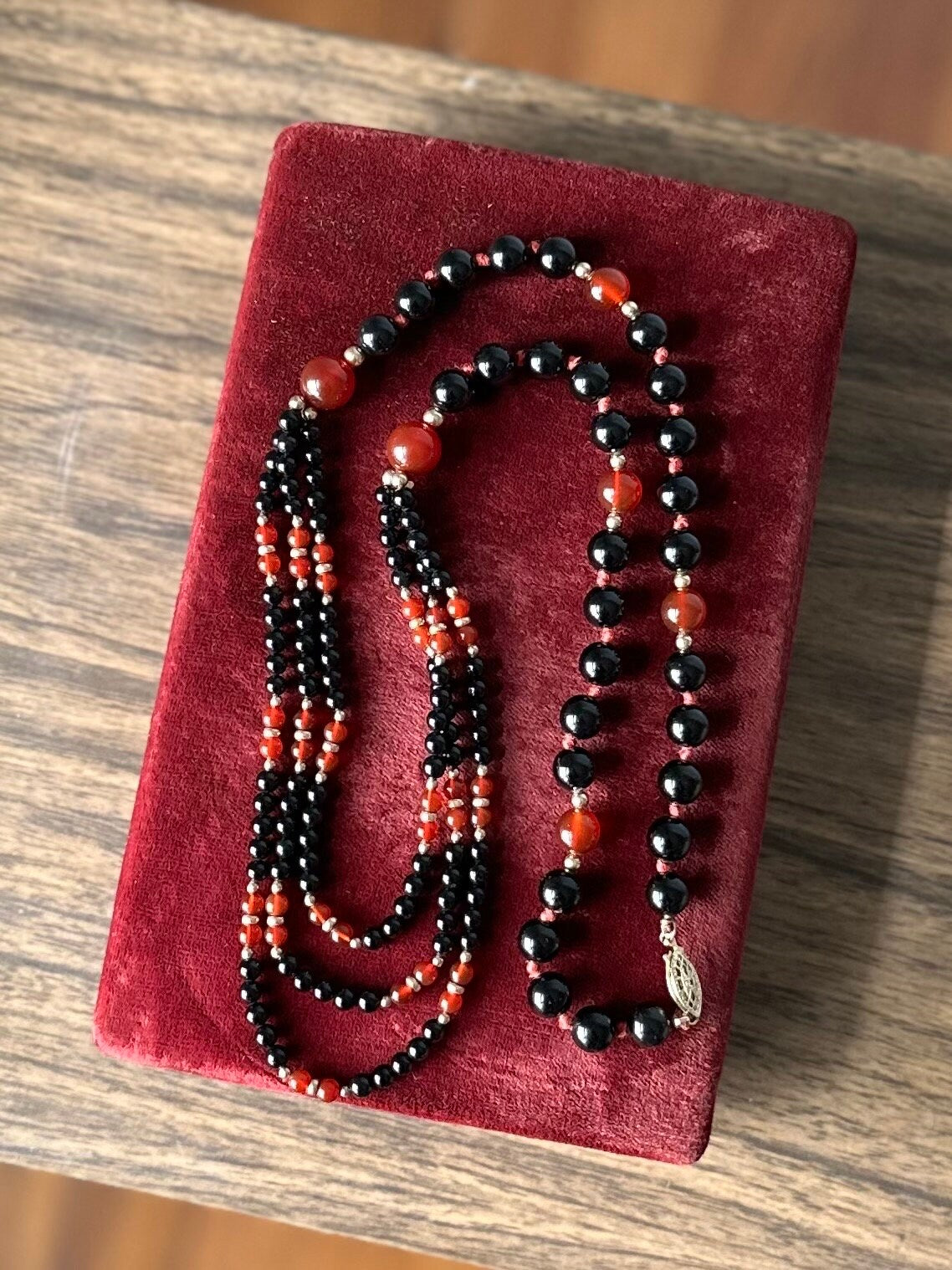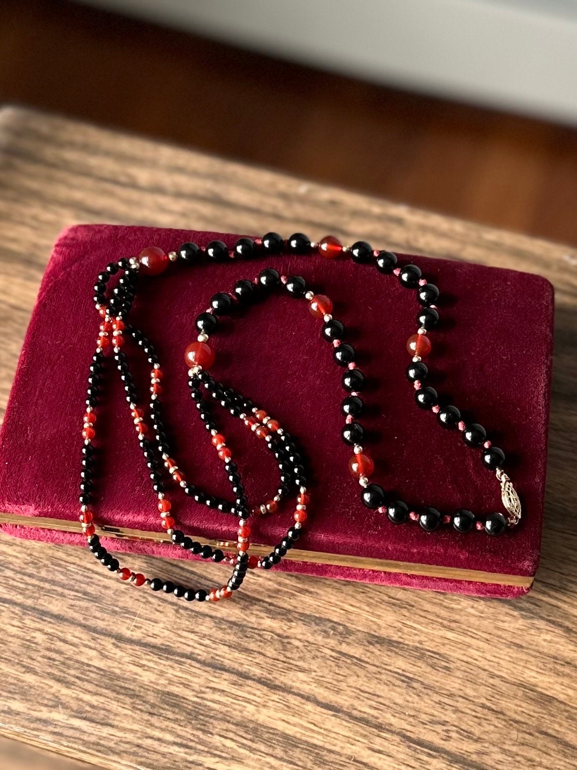 Hand knotted genuine black onyx and carnelian beads with gold filled separator beads.