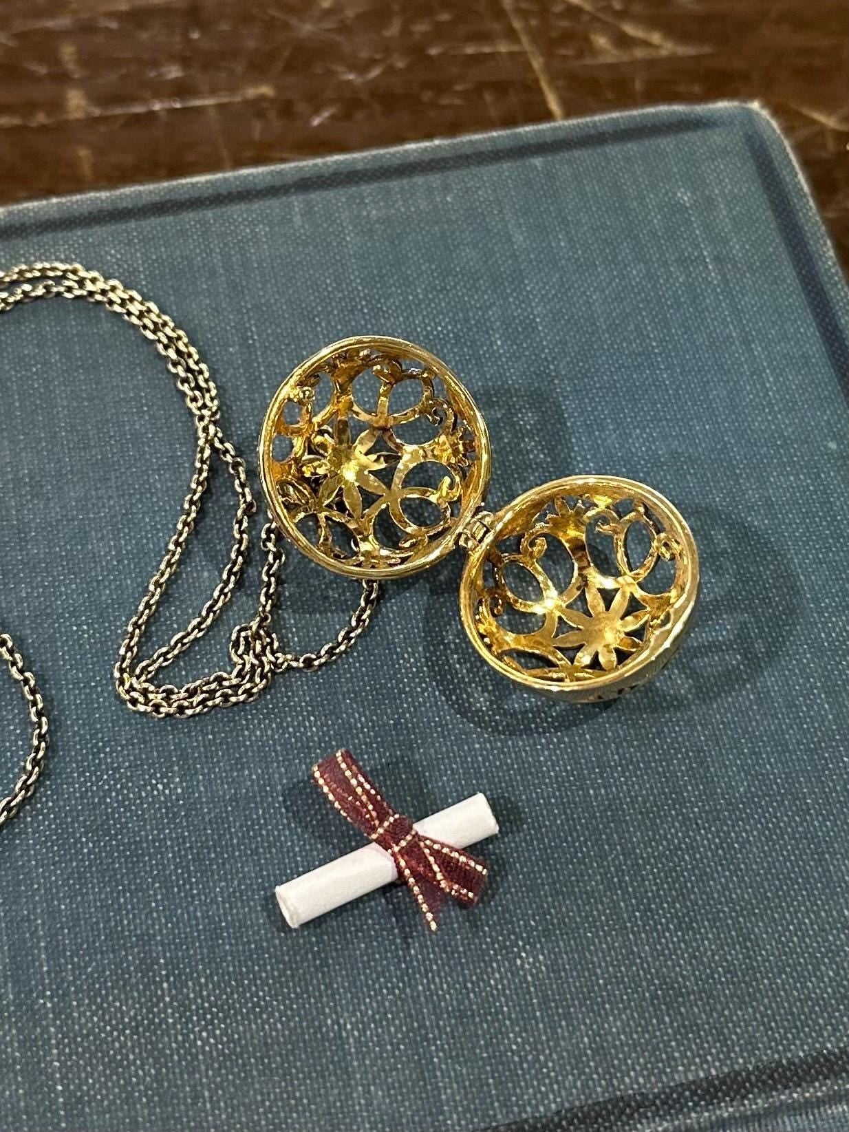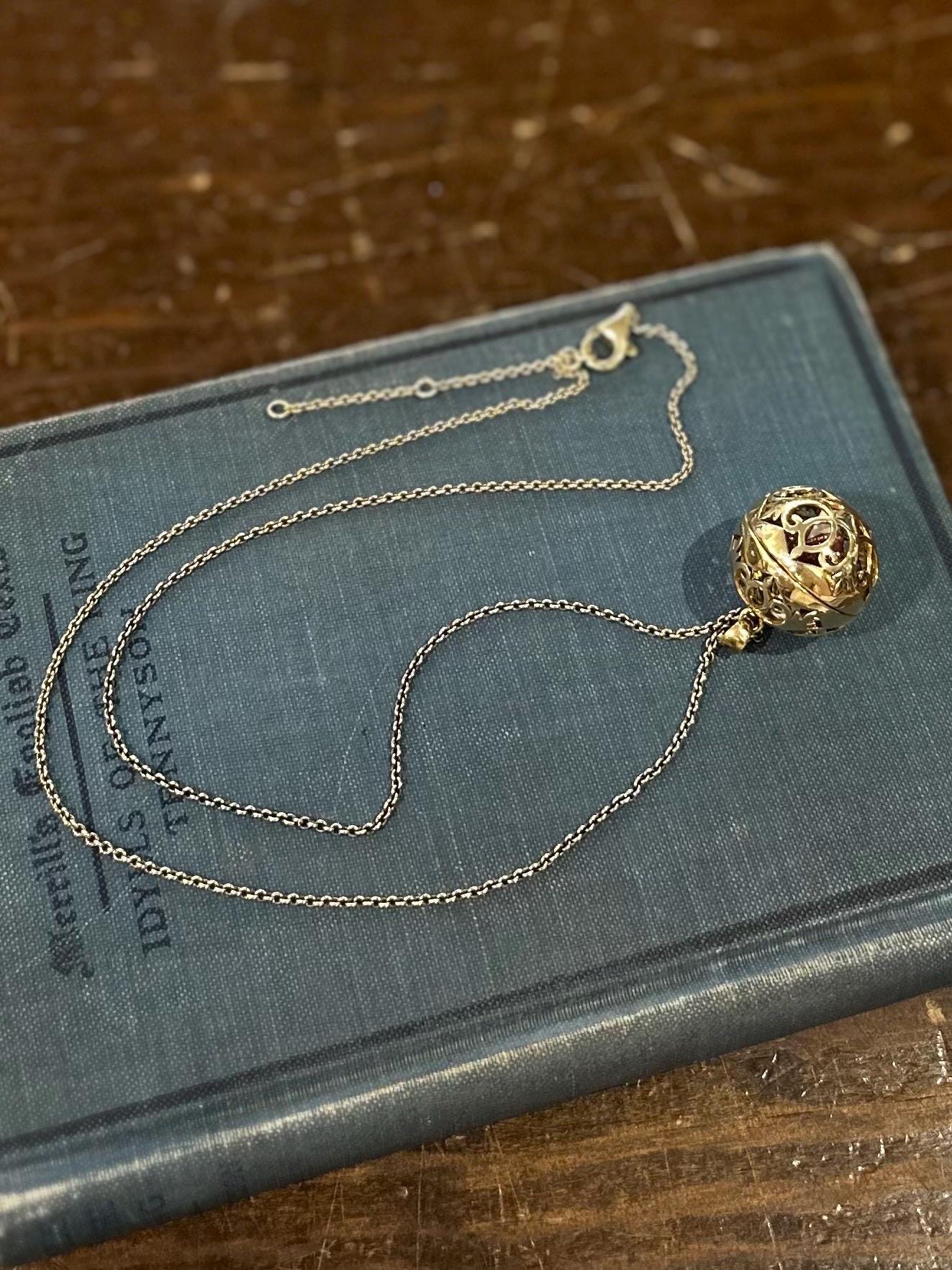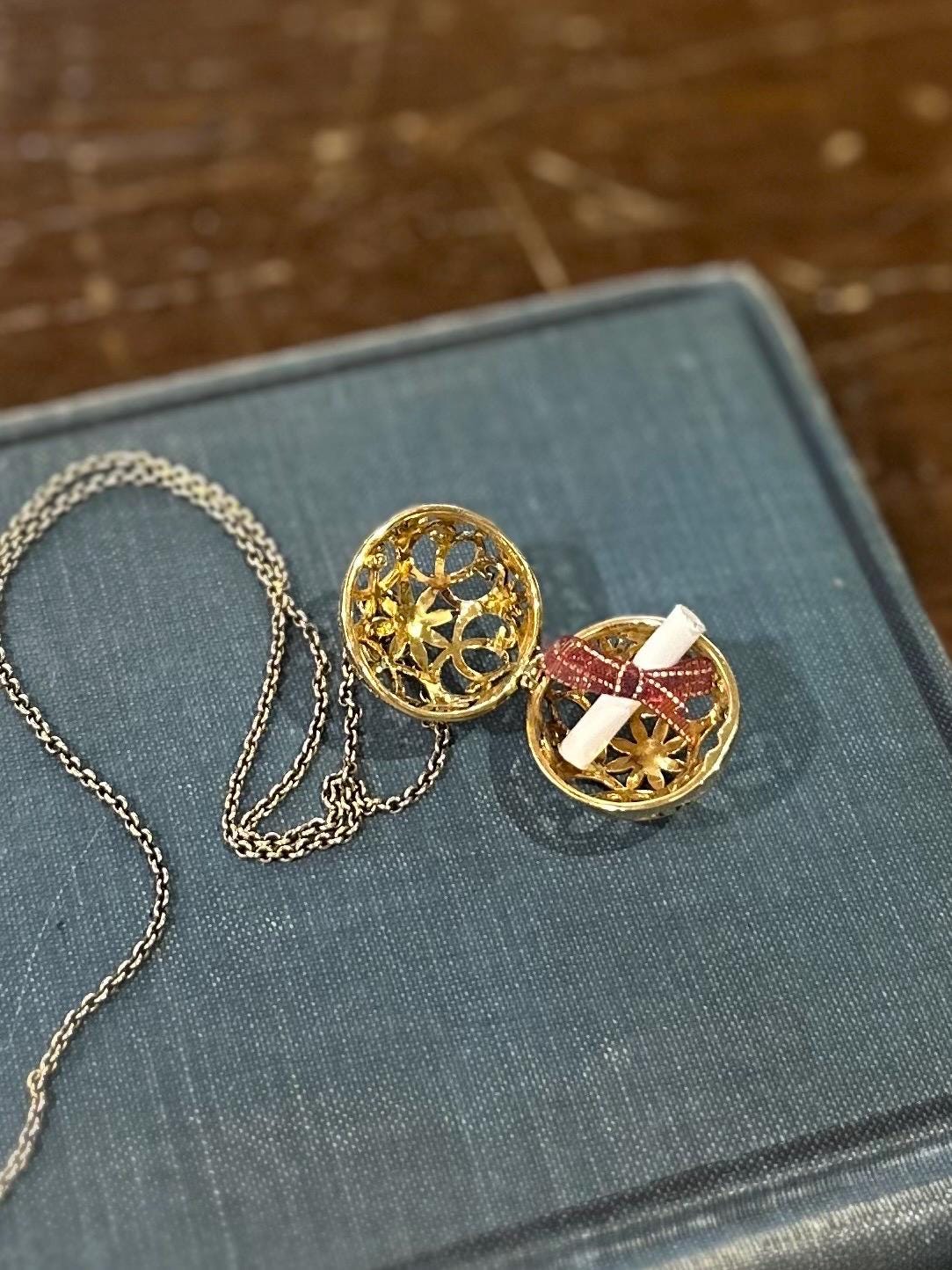Unique mechanical orb pendant necklace in gold plated sterling silver. On the inside of the orb, there is a blank rolled up scroll tied in red ribbon. Leave it blank or write a secret and/or sentimental message!