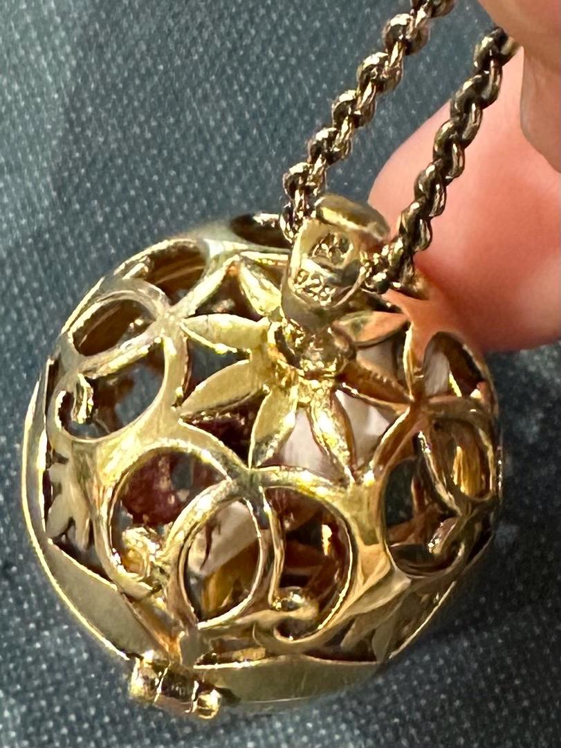 Orb pendant measures approximately 0.9 inches long by 0.9 inches wide (not including bail). Outer circumference of approximately 7.25 cm. The bail of the orb is also stamped “925” and has an undistinguishable maker’s mark.